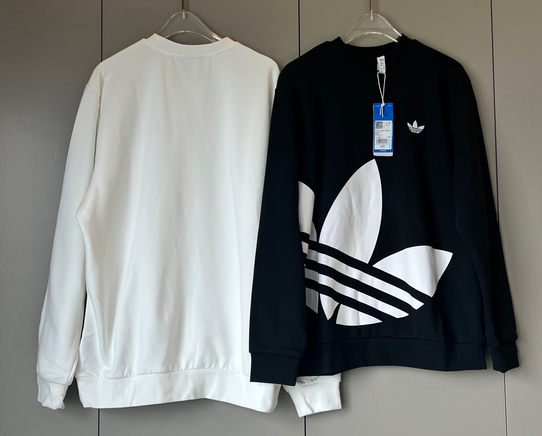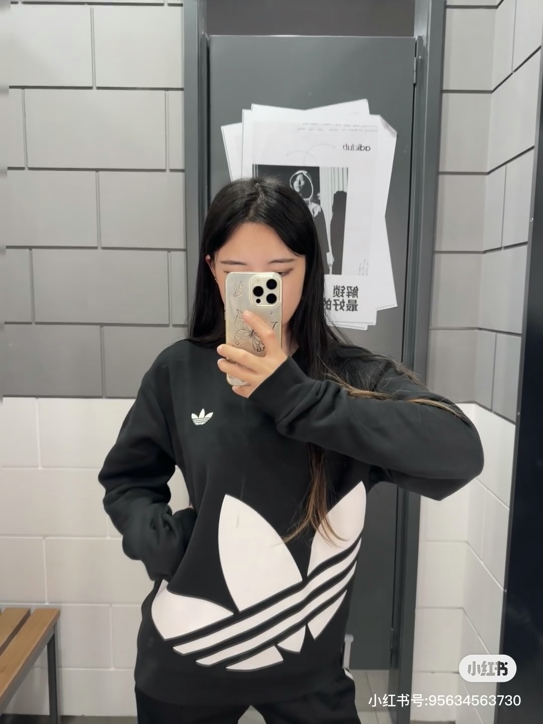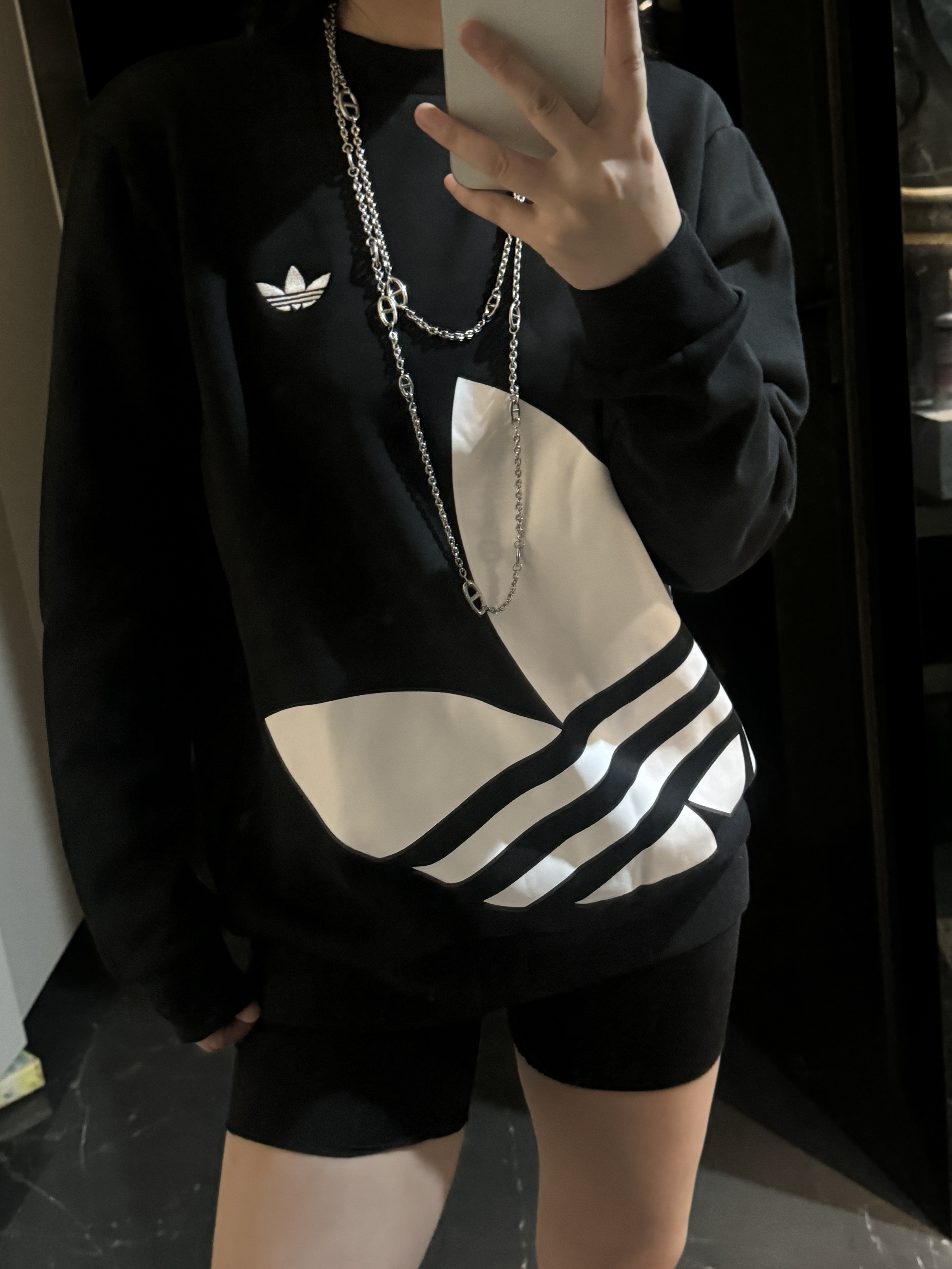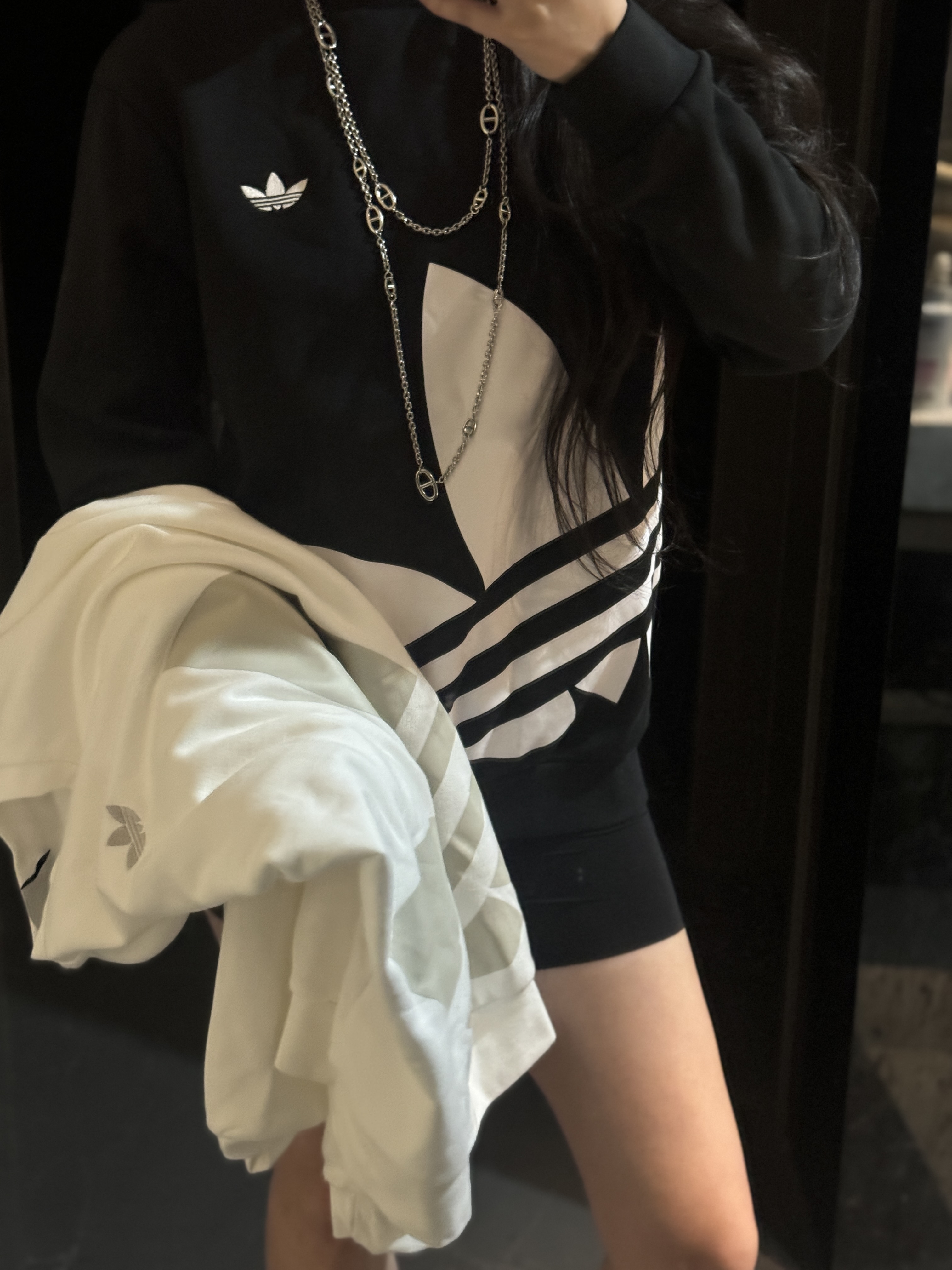 标志性大LOGO印花+经典三叶草小标,👀黑白撞色潮酷吸睛,往身上一穿就是街头焦点。宽松版型对各种身材友好,不管是配运动裤走休闲风,还是搭牛仔裤玩复古潮,它都能完美适配,让你在秋冬保暖圈里时髦到飞起~