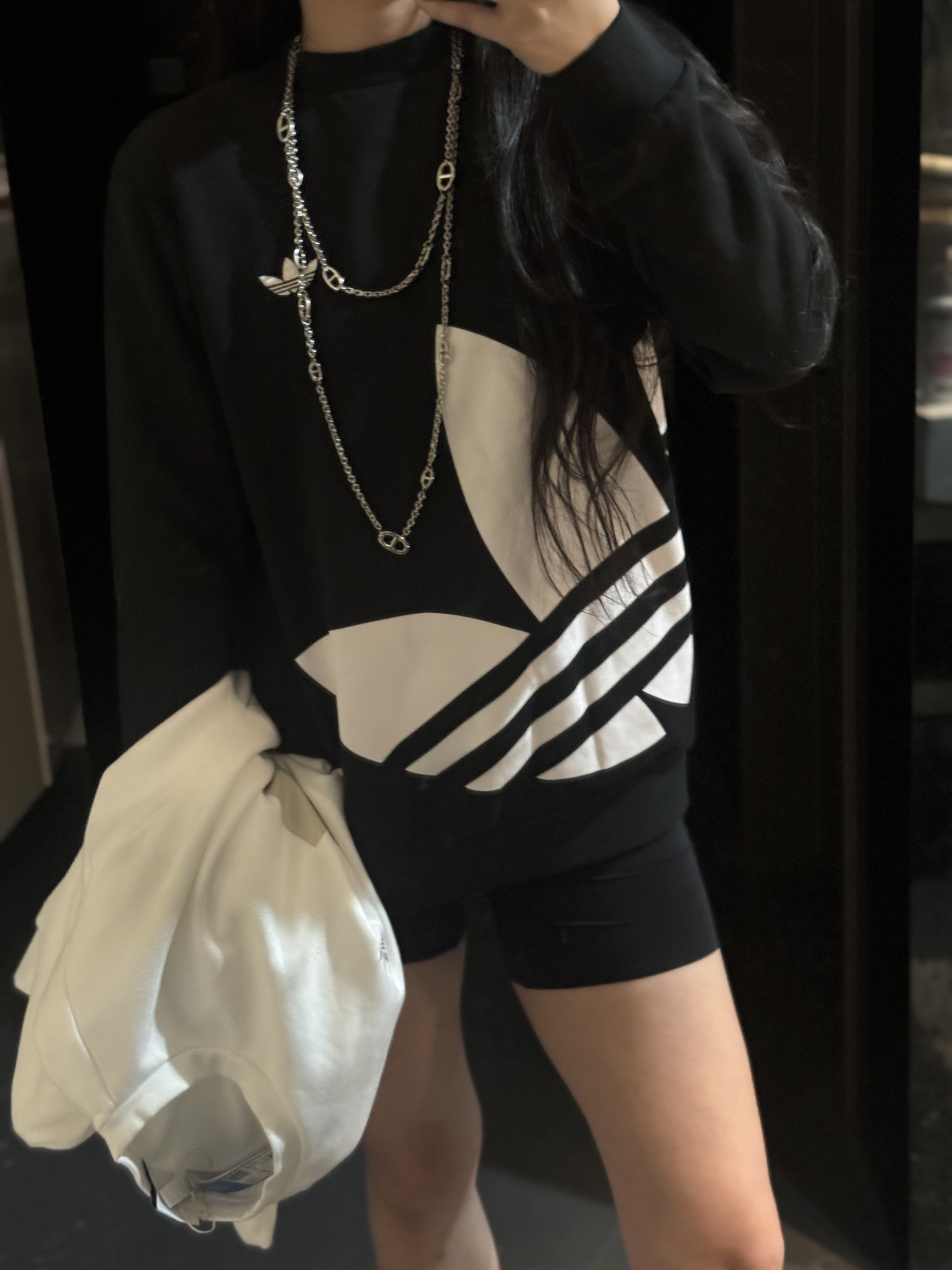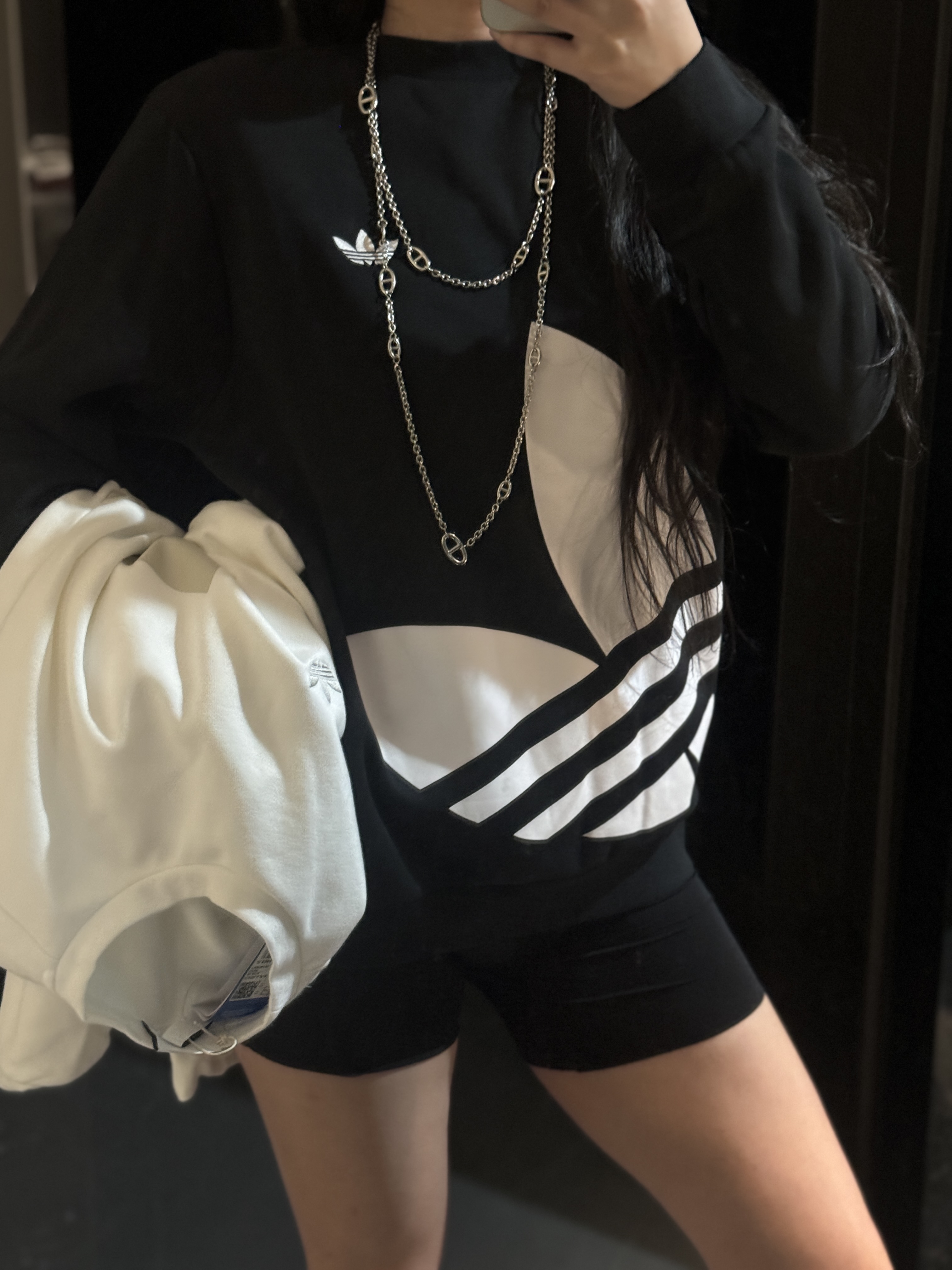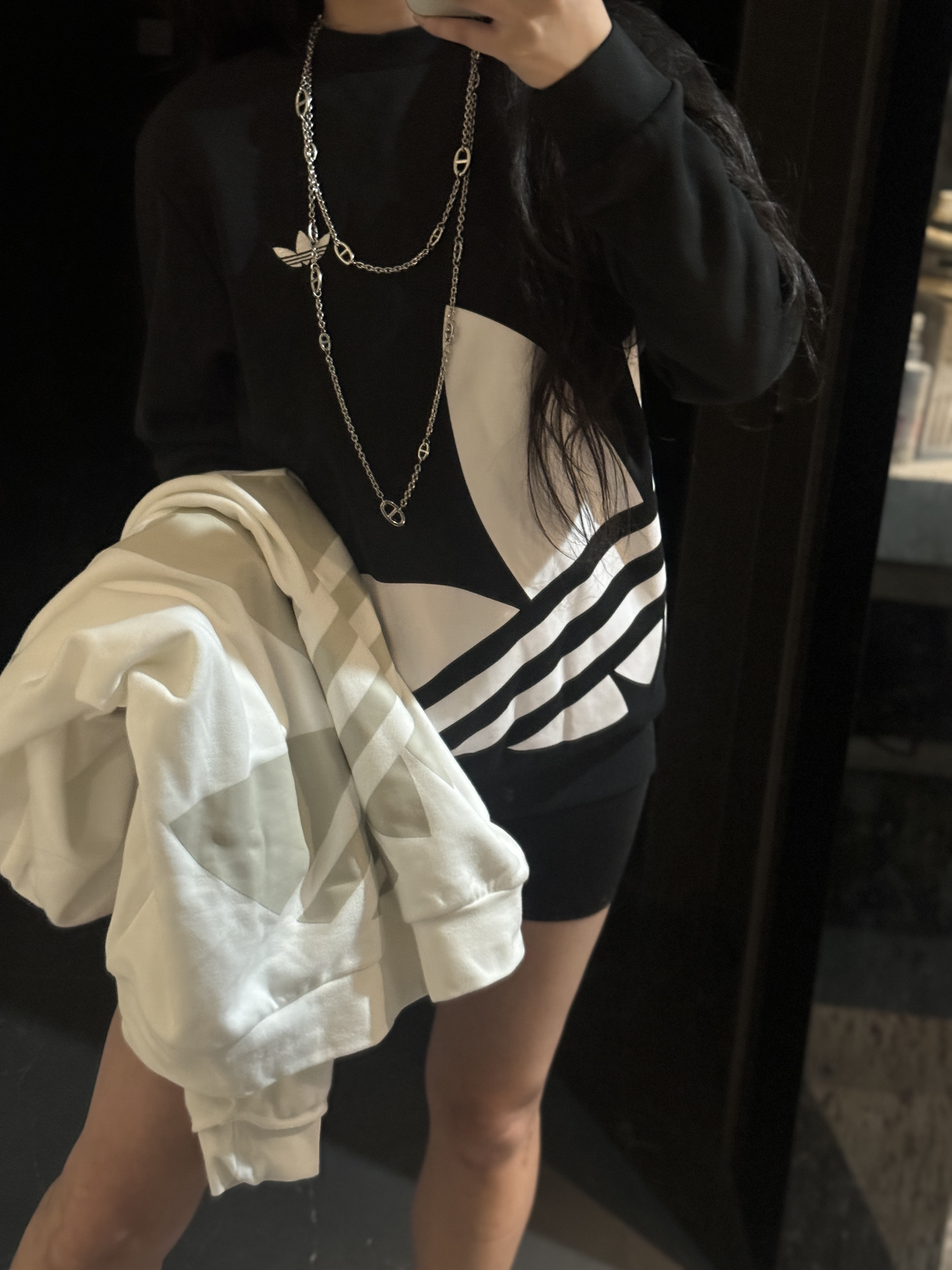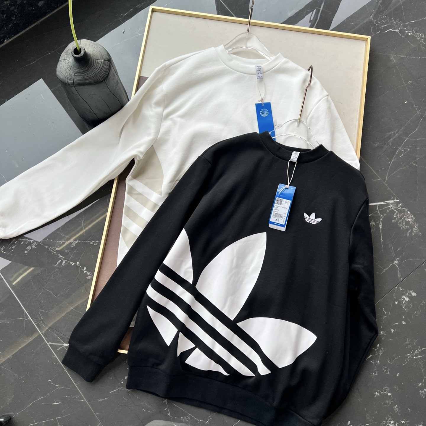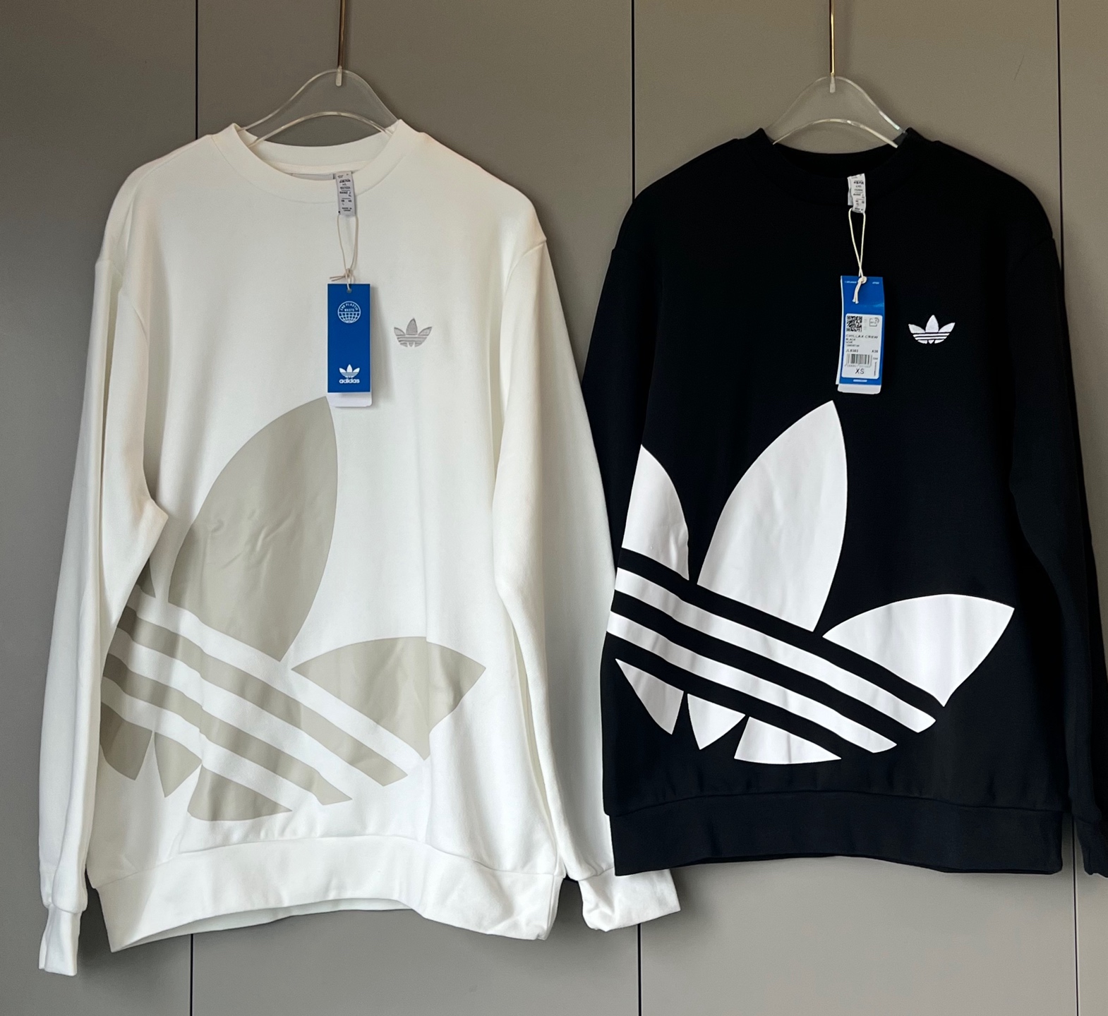 标志性大LOGO印花+经典三叶草小标,👀黑白撞色潮酷吸睛,往身上一穿就是街头焦点。宽松版型对各种身材友好,不管是配运动裤走休闲风,还是搭牛仔裤玩复古潮,它都能完美适配,让你在秋冬保暖圈里时髦到飞起~