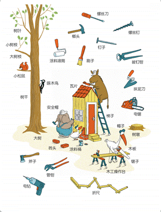 与传统的看图识物不同的是,作者并非将日常用品单个陈列于画面中,而是将它们巧妙置于丰富、生动、连贯的故事画面中。随着每一页画面的呈现,读者跟随着小动物的脚步,先后来到卧室、卫生间、厨房、客厅、花园及室外,乃至海边、山间等更广阔的自然世界中。