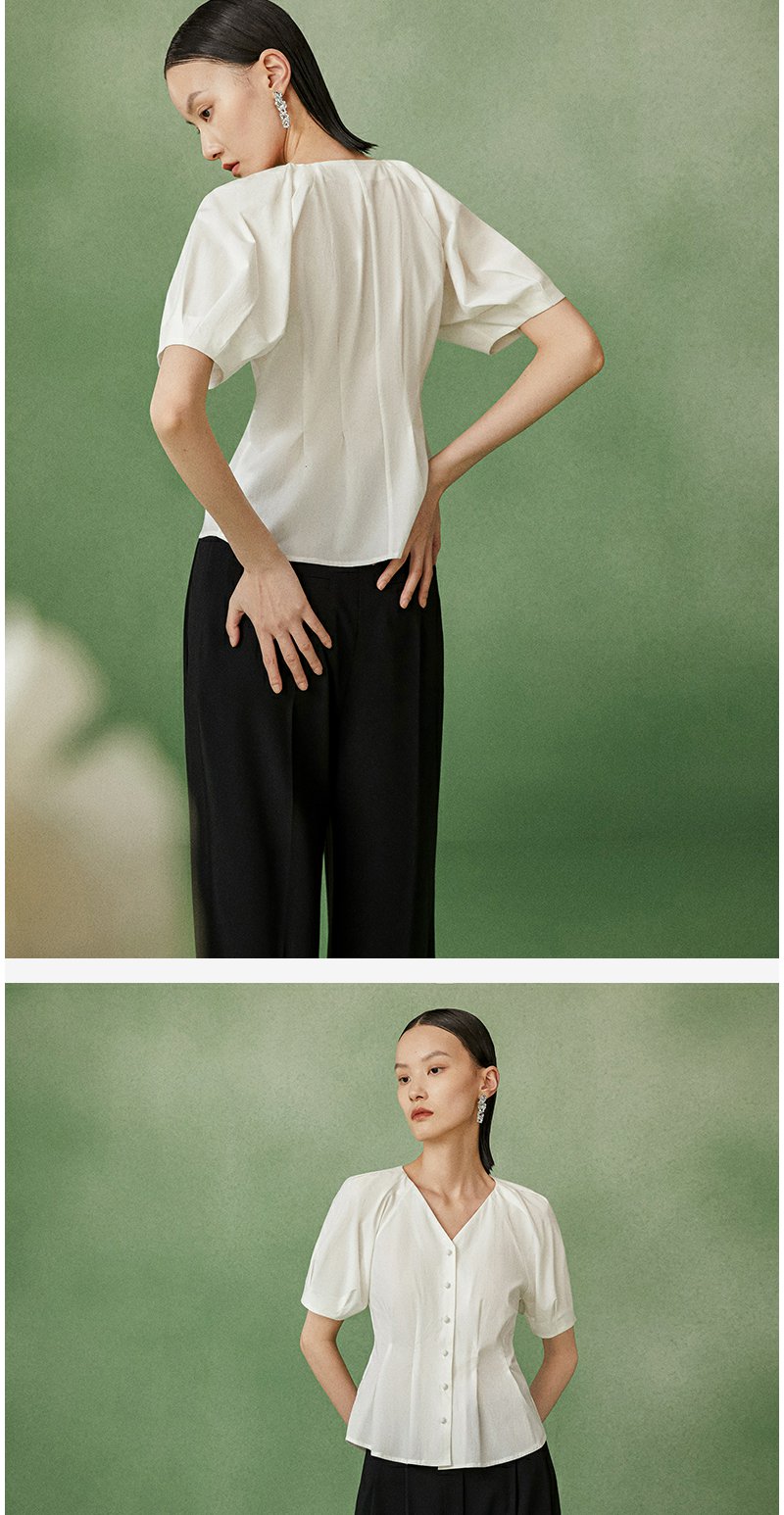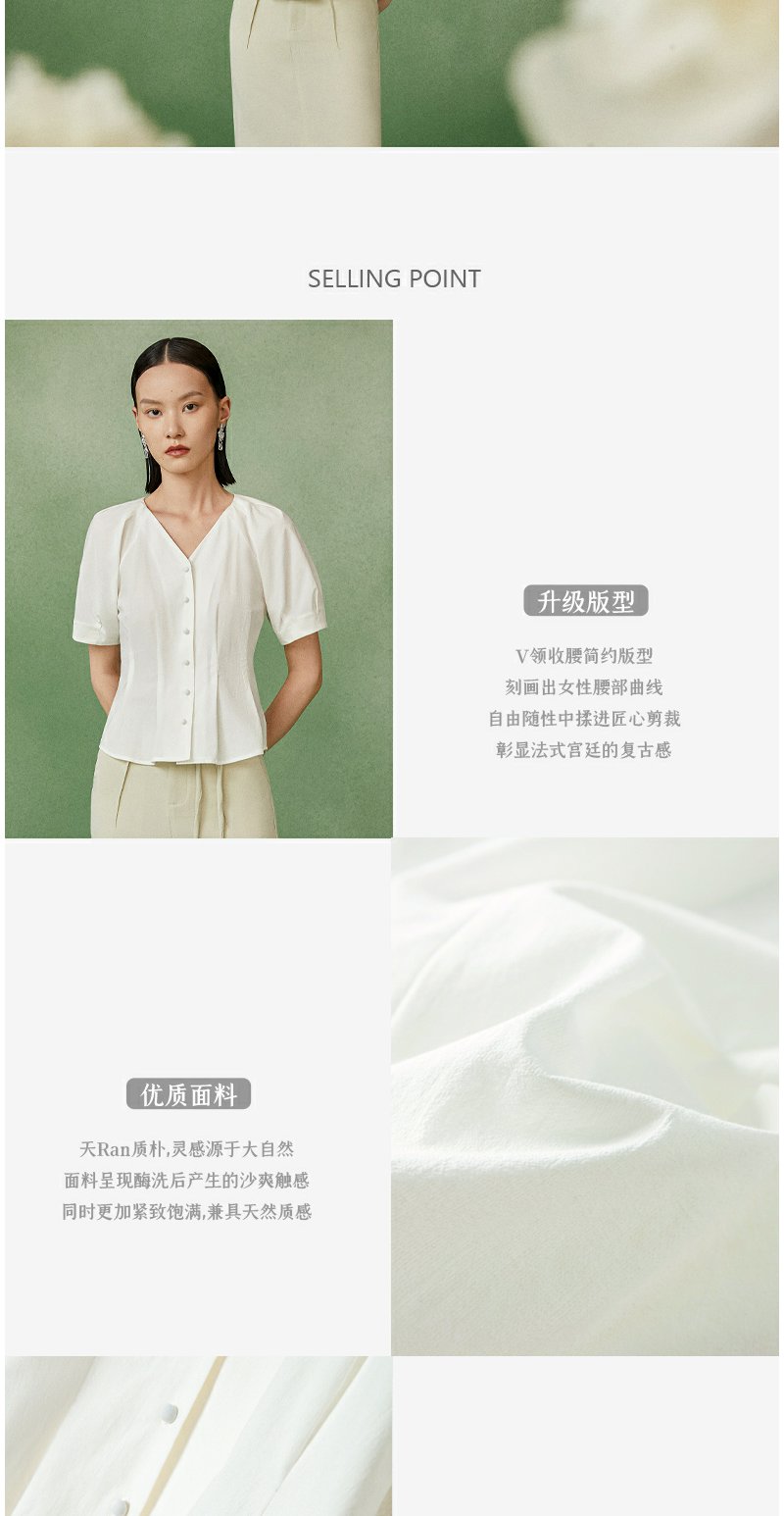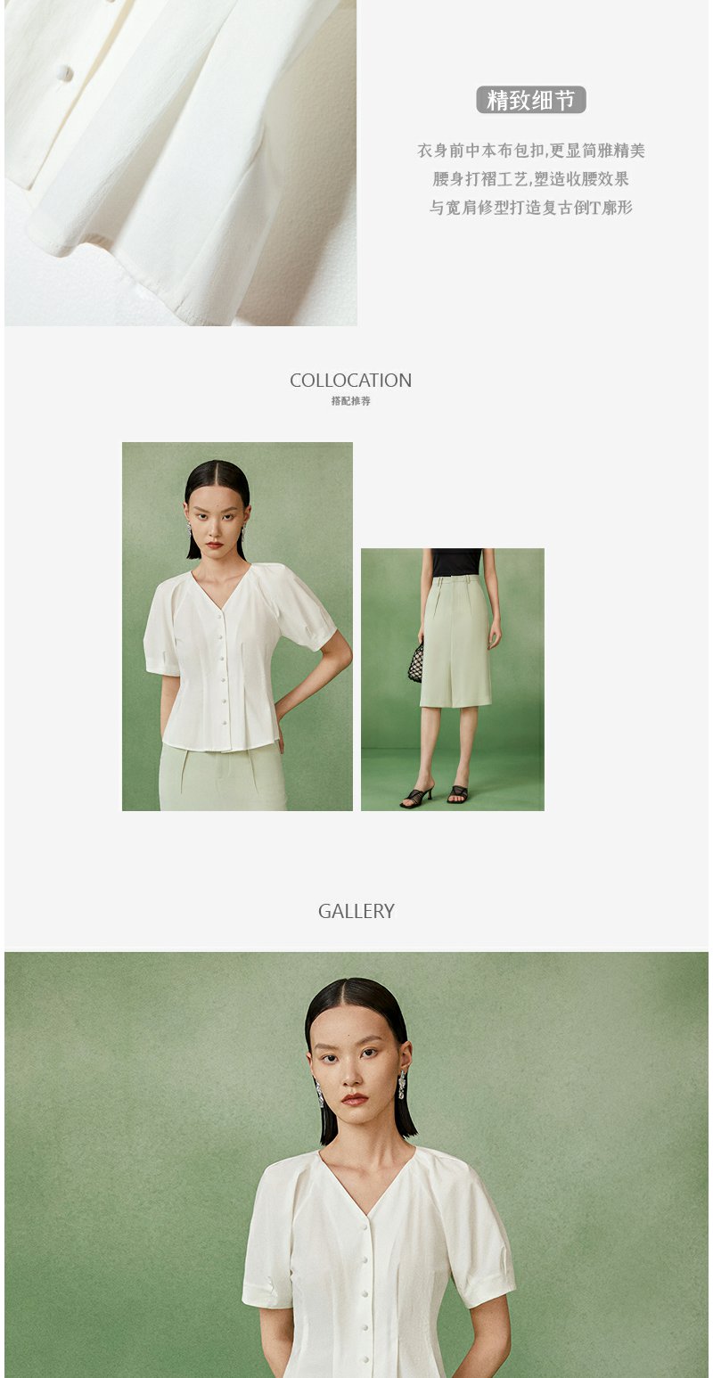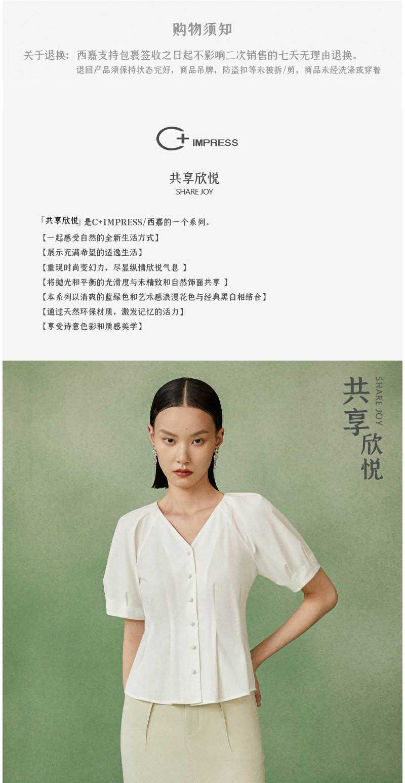 C+IMPRESS/西嘉 新疆长绒棉白色法式宫廷复古V领泡泡袖衬衫上衣女CS2202021