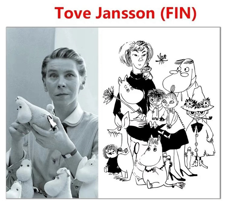 姆明:是一位多才多艺的杜芙·颜生(Tove Jansson,又译:图韦·杨松)。杜芙原名杜芙·玛丽嘉·颜生(Tove Marika Jansson),1914年9月8日出生于赫尔辛基,她出身自芬兰少数讲瑞典语的家庭。杜芙身兼画家、插图师、小说家和连环画作家于一身,她的横溢才情,也许遗传自她的雕塑家父亲和画家母亲。从1945年开始,她便踏上创作姆明(Moomin)的道路。她将很多儿时的感受和成长环境,融进了那个虚构故事当中