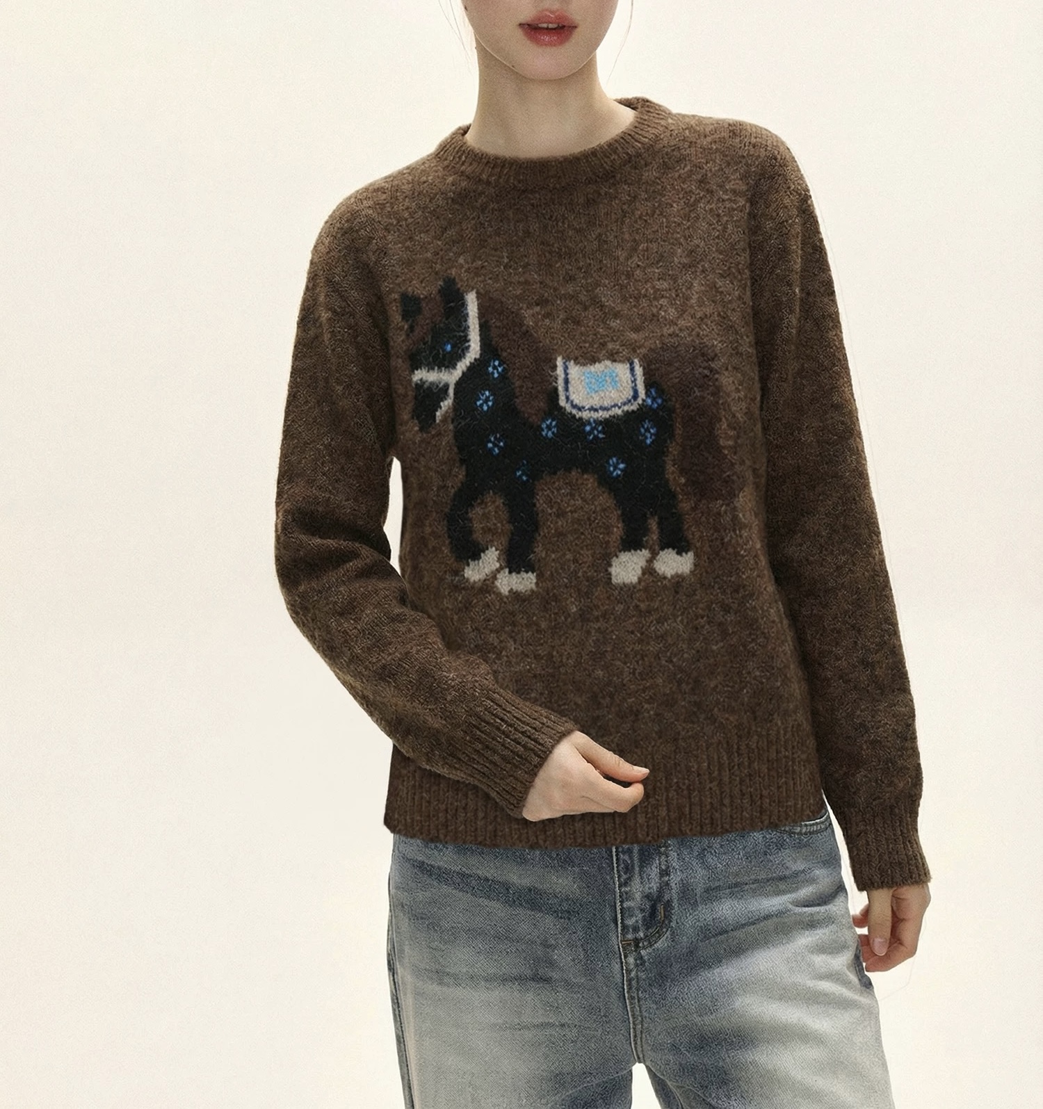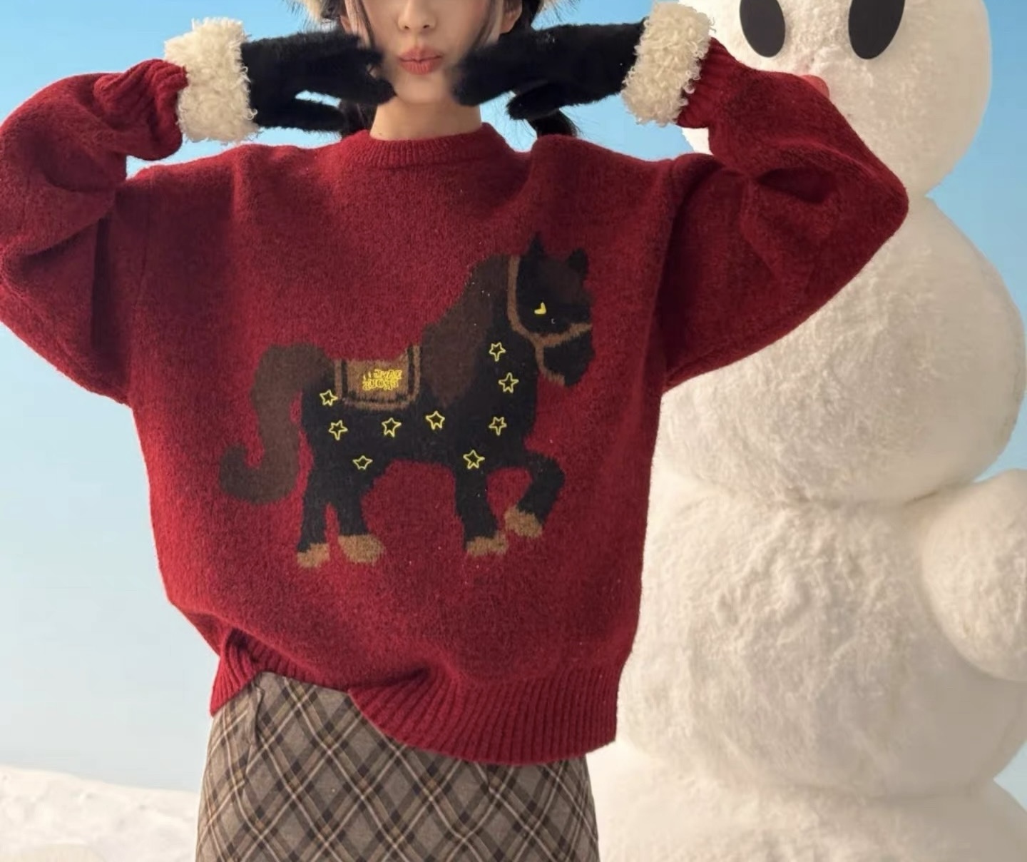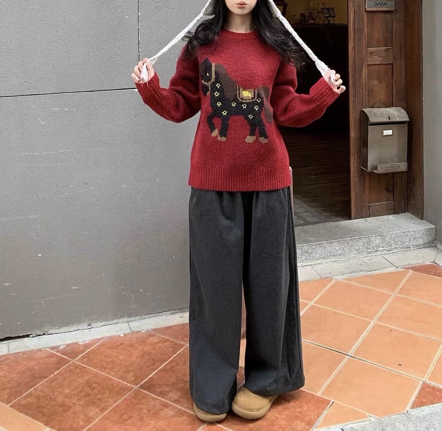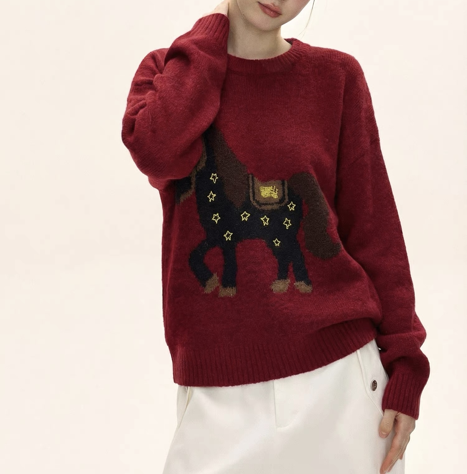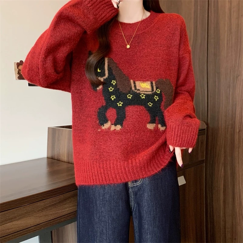 富比羊新年小马羊毛衣 绵羊毛混纺亲肤软糯 新年限定本命红显白到发光 宽松套头版型不挑身材显瘦显气质