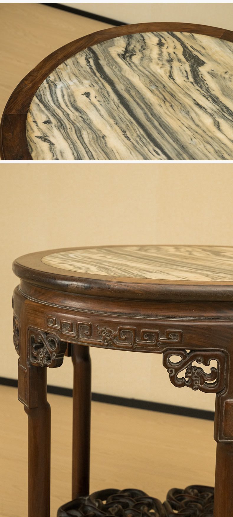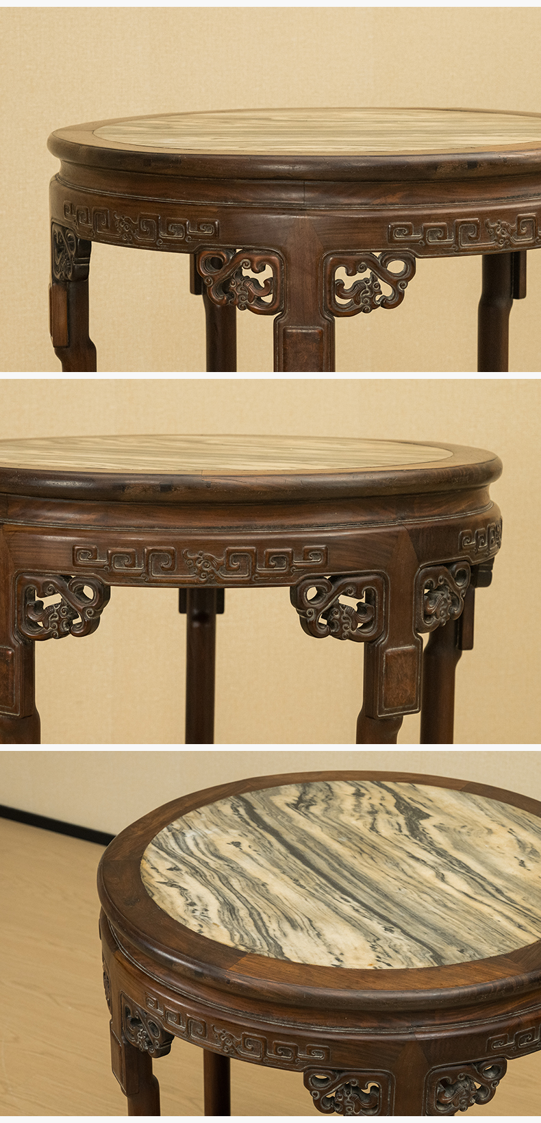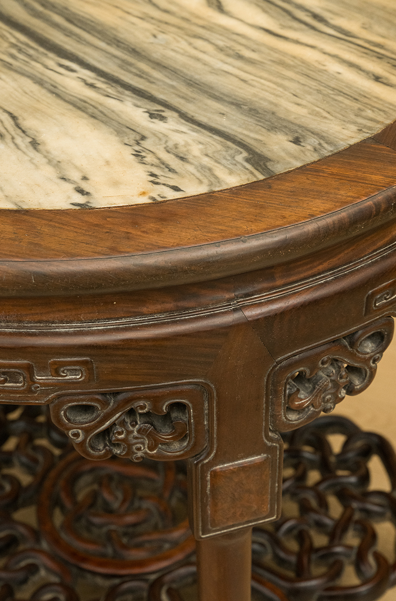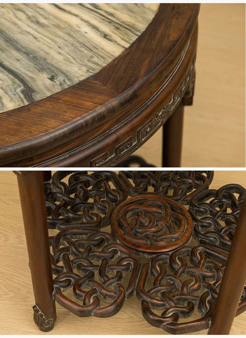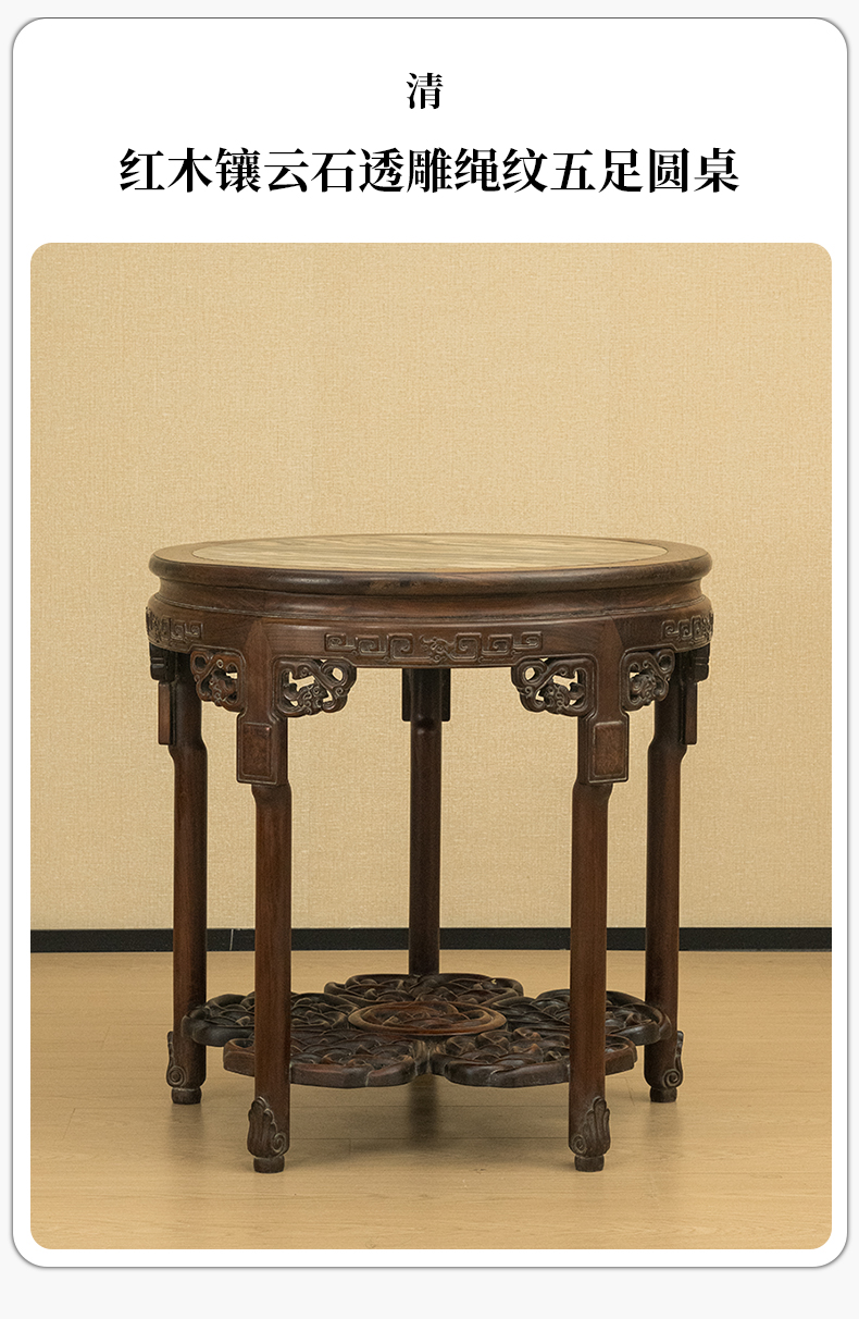 清 红木镶云石透雕绳纹五足圆桌