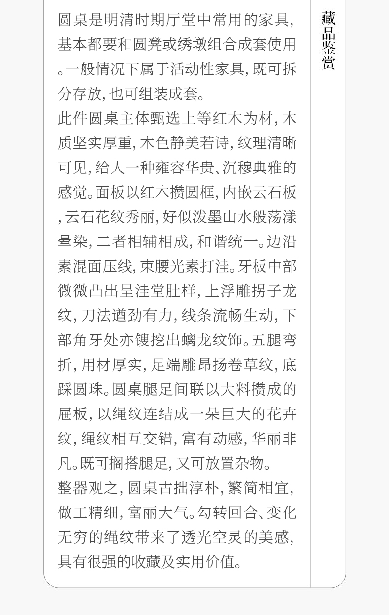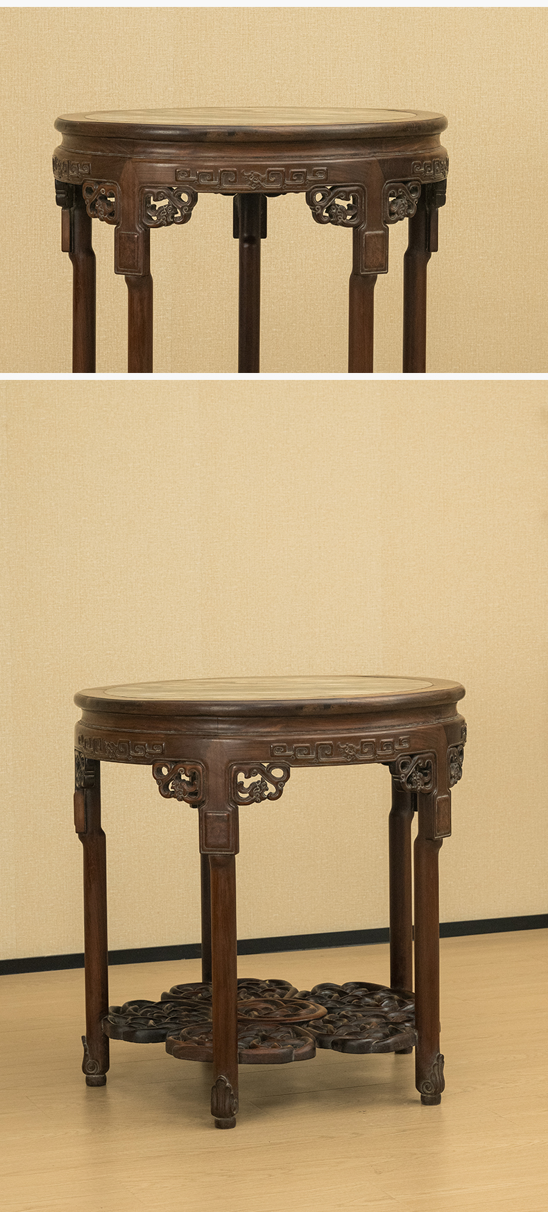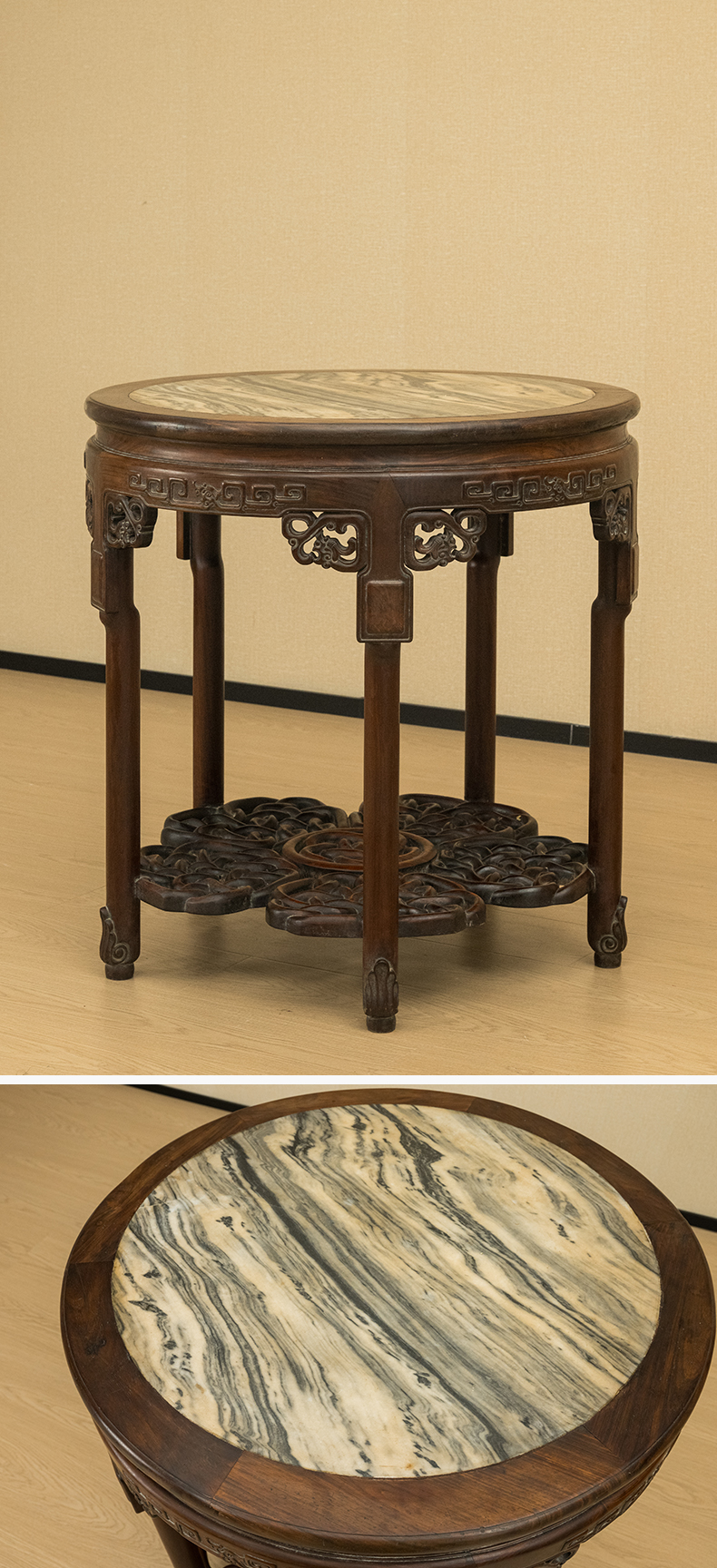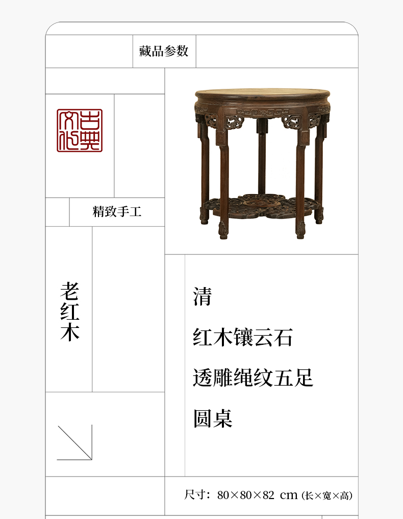 清 红木镶云石透雕绳纹五足圆桌
