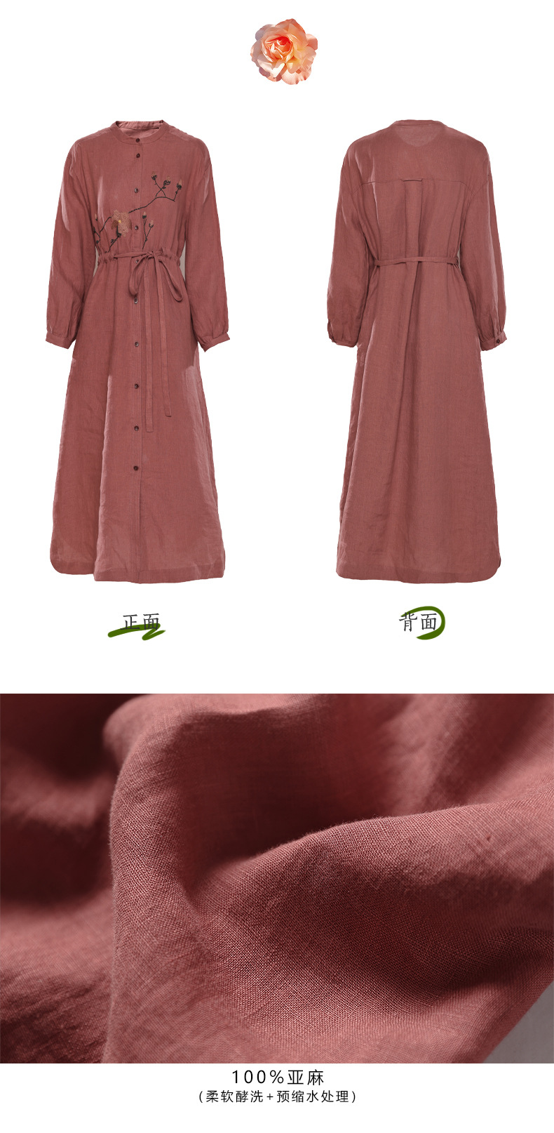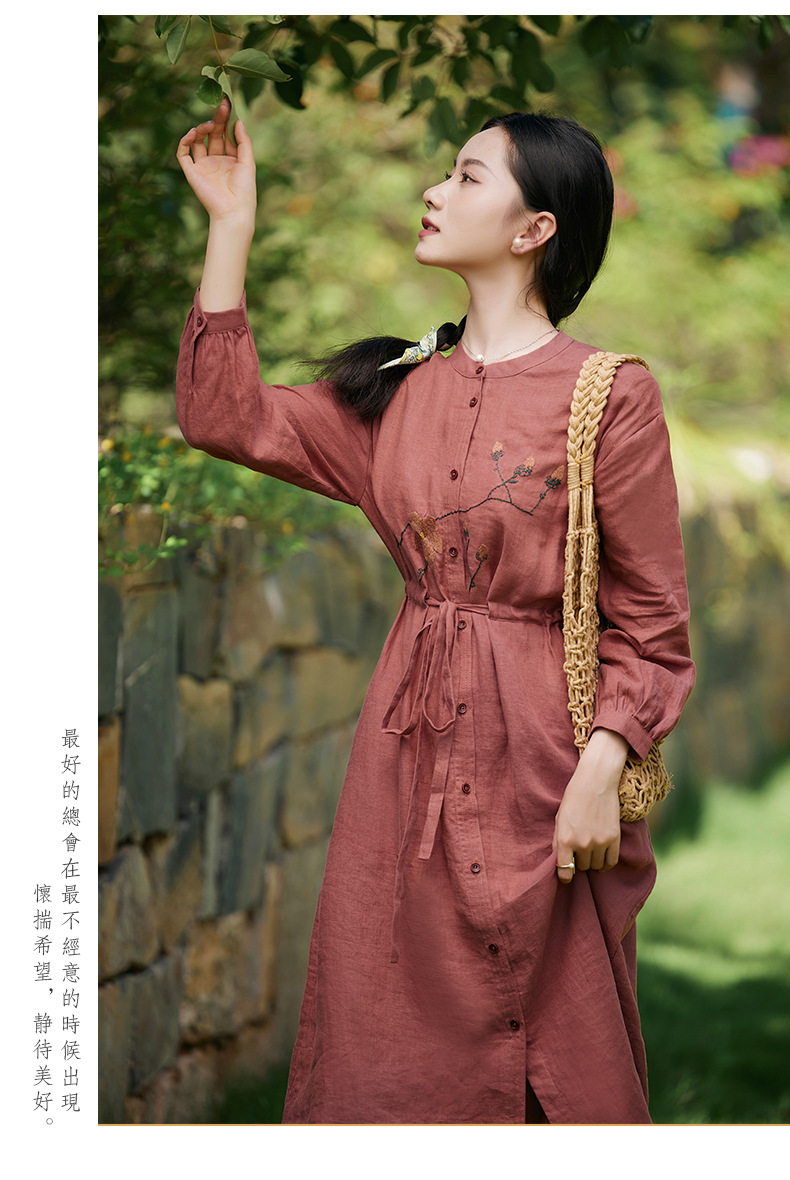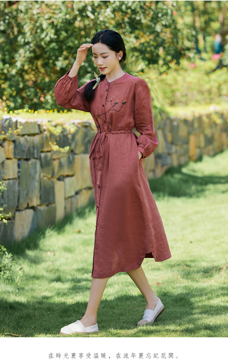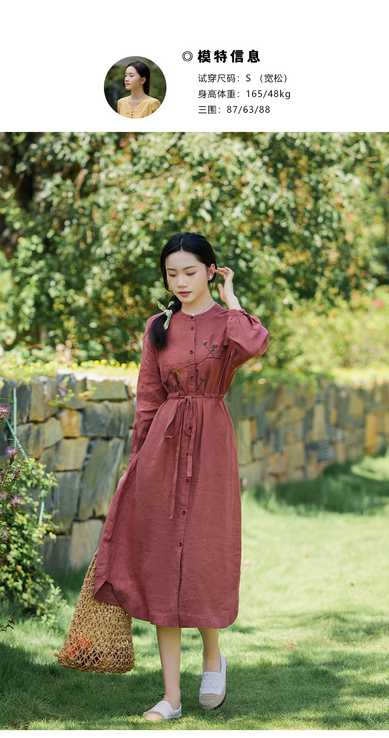 HM-S335秋季新款花朵重工刺绣文艺亚麻连衣裙圆领长袖宽松衬衫式长裙