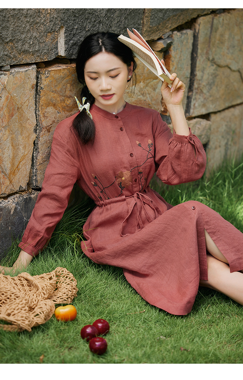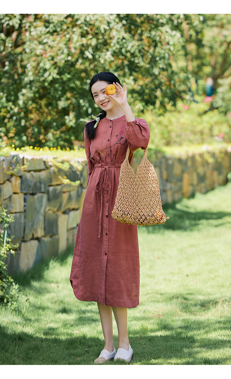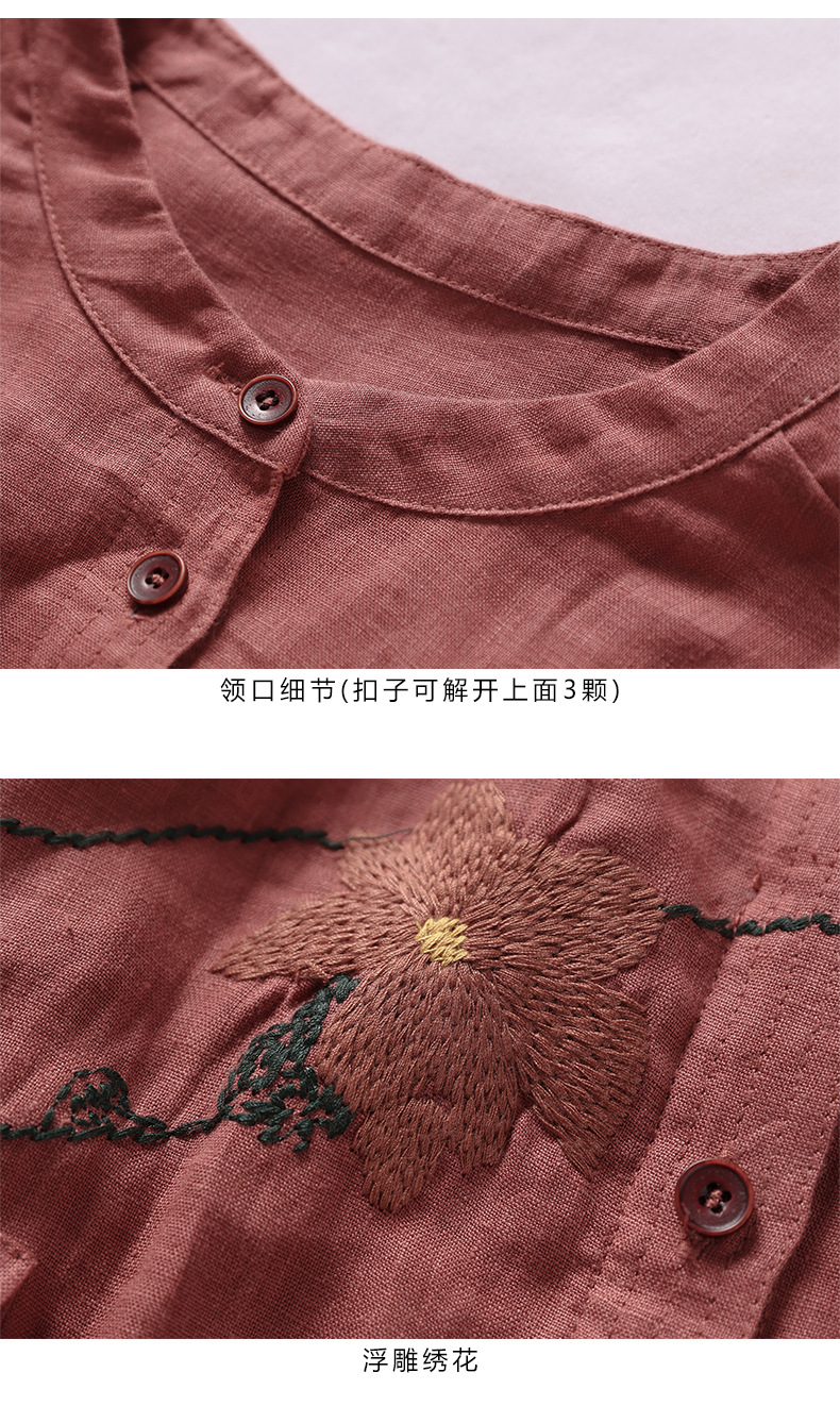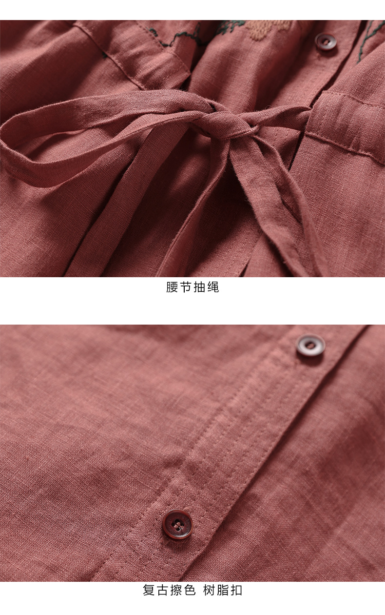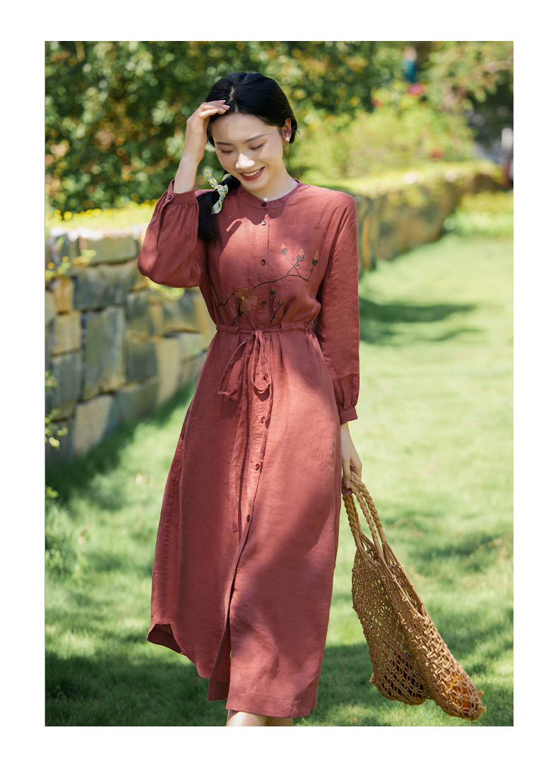 HM-S335秋季新款花朵重工刺绣文艺亚麻连衣裙圆领长袖宽松衬衫式长裙