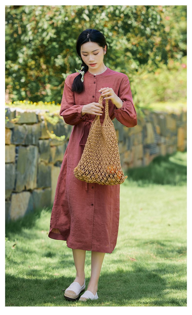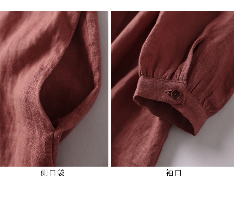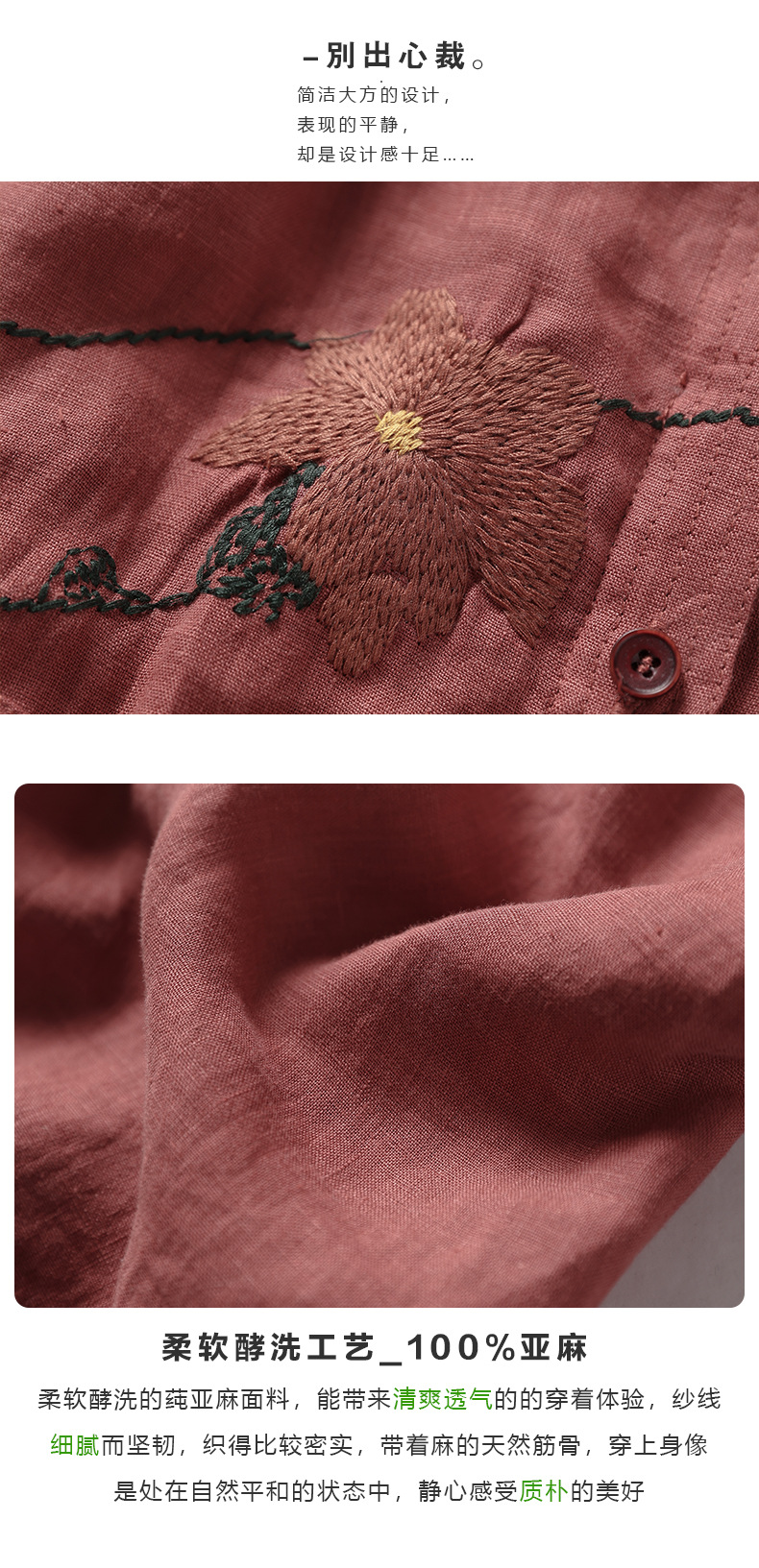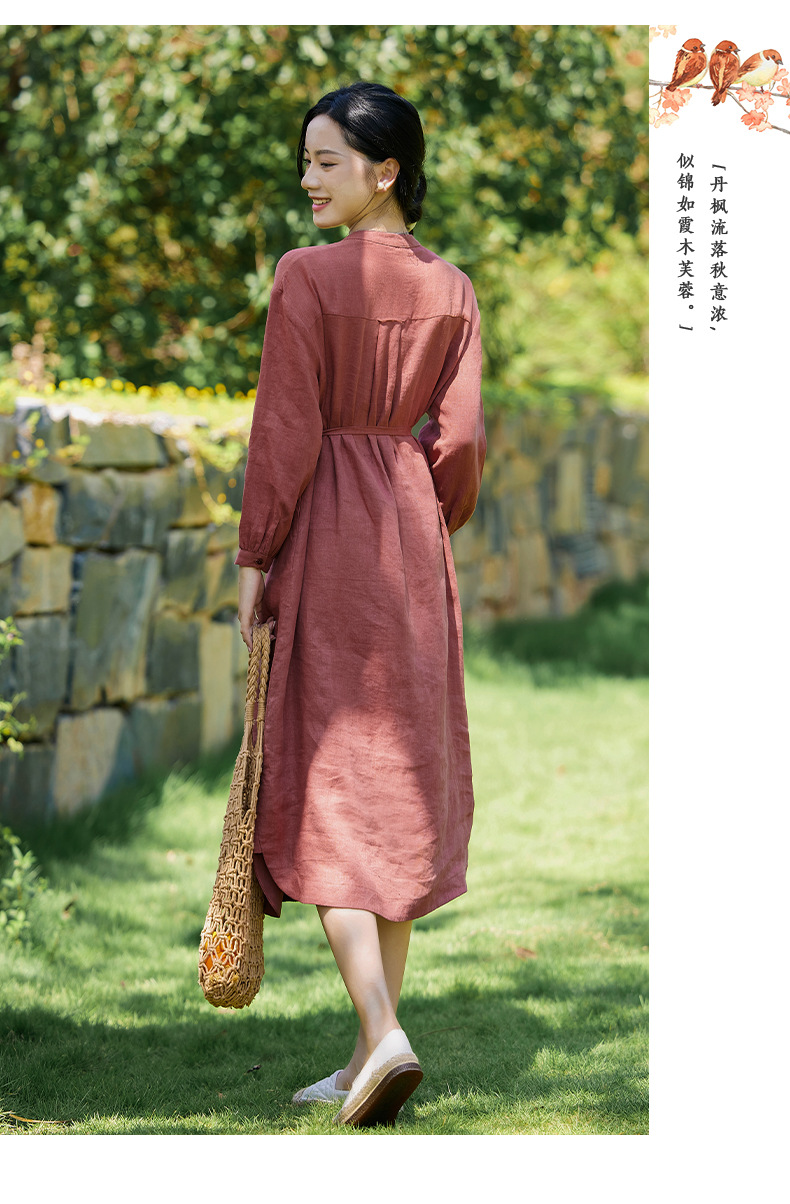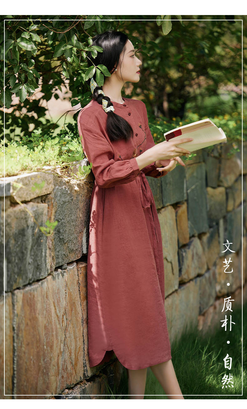 HM-S335秋季新款花朵重工刺绣文艺亚麻连衣裙圆领长袖宽松衬衫式长裙