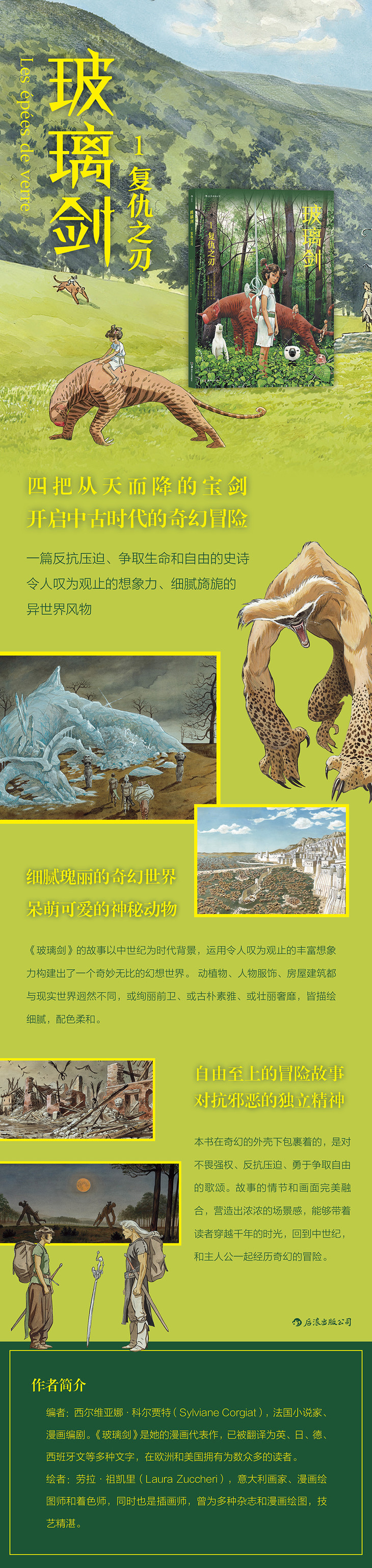 绘者:劳拉·祖凯里(Laura Zuccheri),1971 年生于意大利北部城市博洛尼亚,意大利画家、漫画绘图师和着色师,同时也是插画师,曾为多种杂志和漫画绘图,技艺精湛。2006 年,她和科尔贾特相识并开始共同创作中世纪奇幻题材漫画《玻璃剑》。