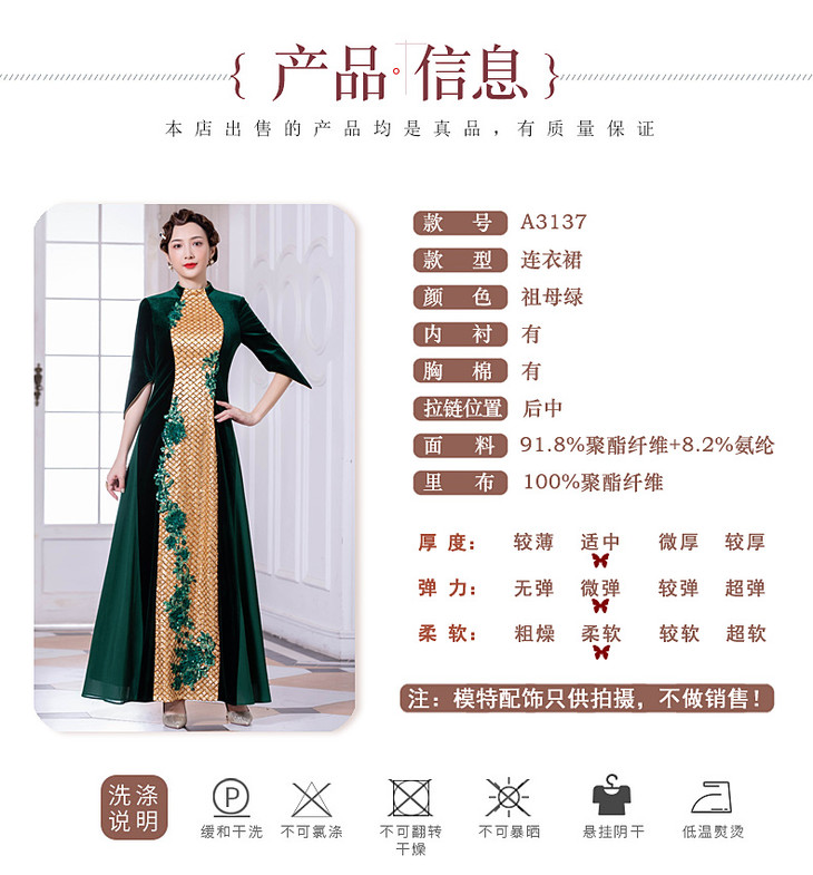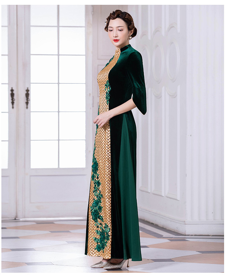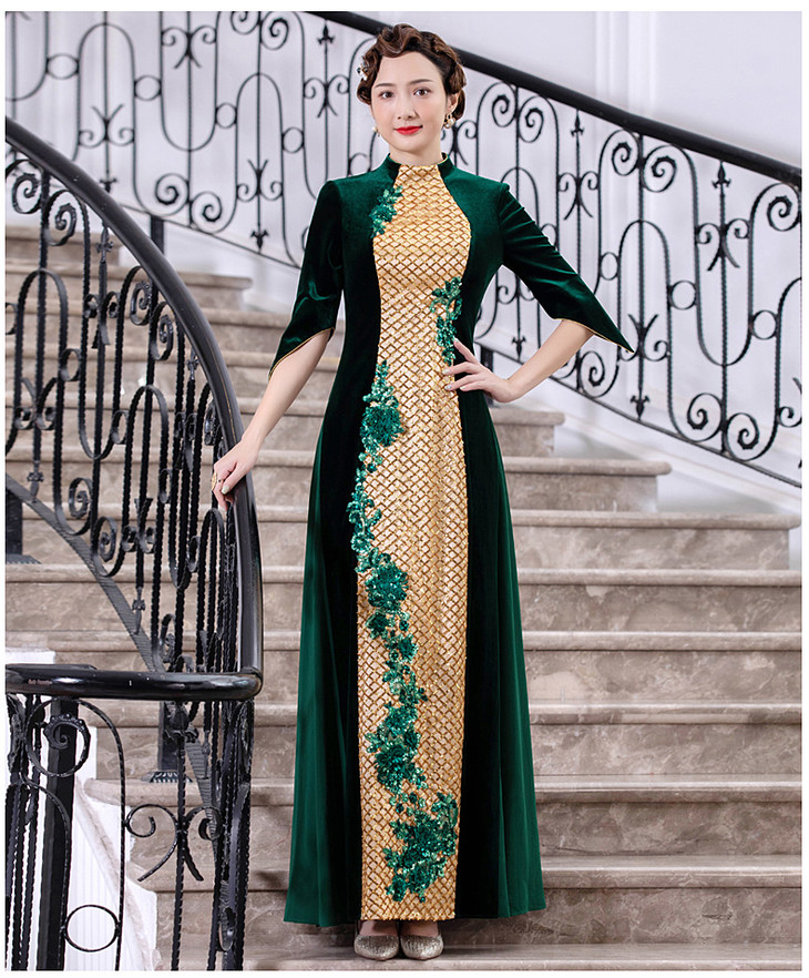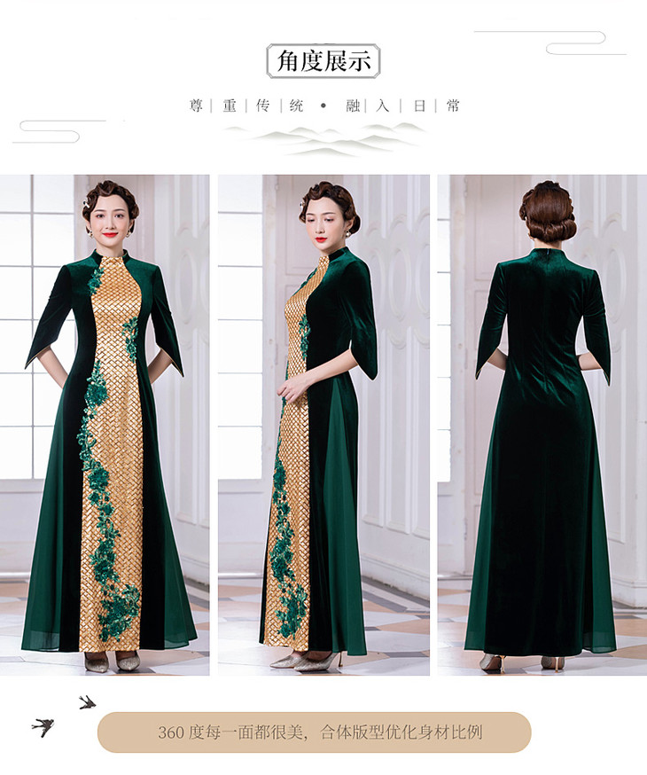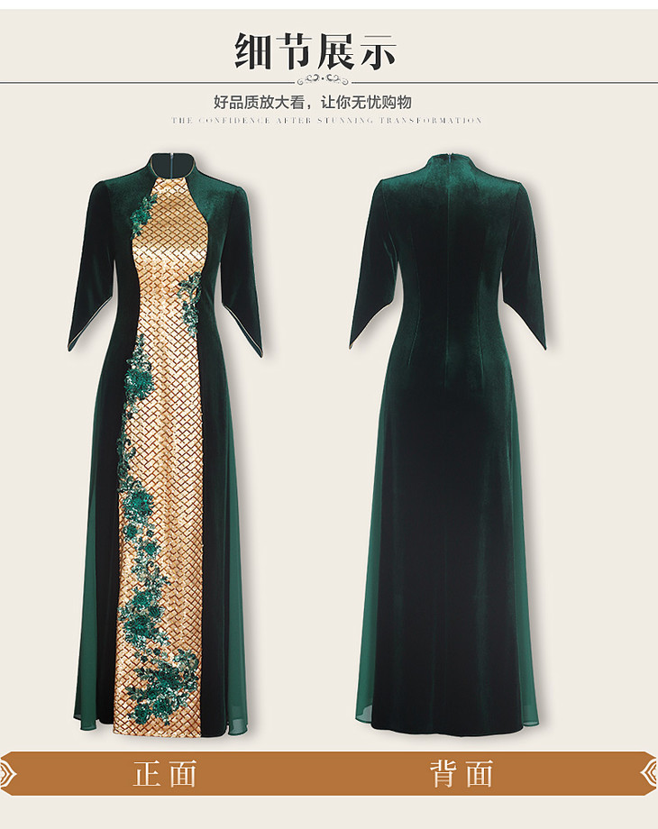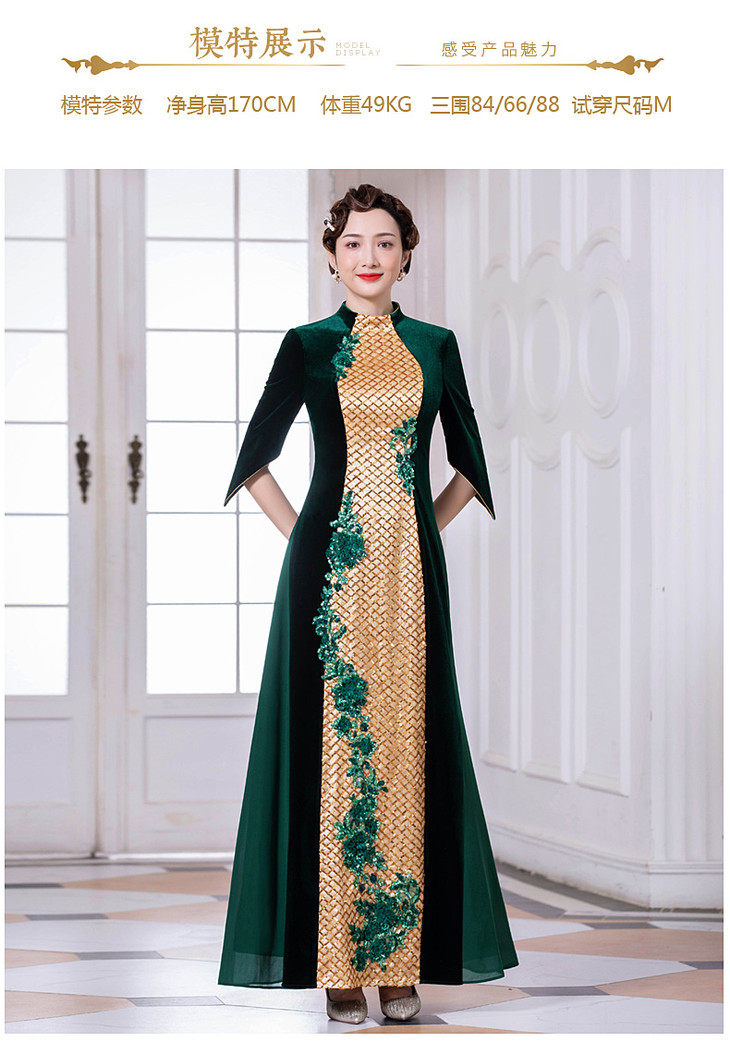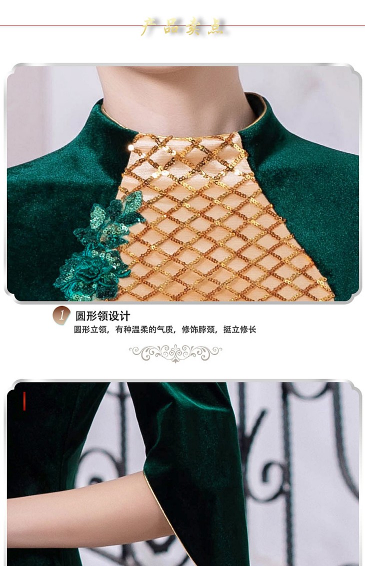 DLQ-A3137新款高端优雅气质修身立领七分袖长款丝绒绣花礼服裙