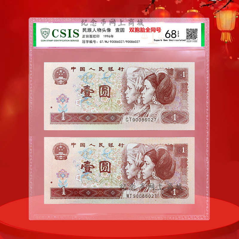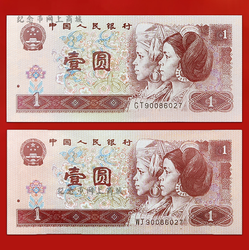 四版96版1元,2张纸币号码全部相同,双胞胎全同号