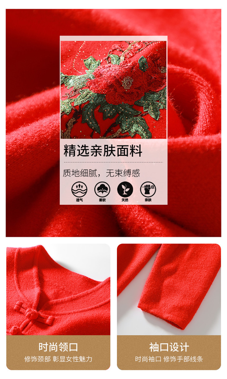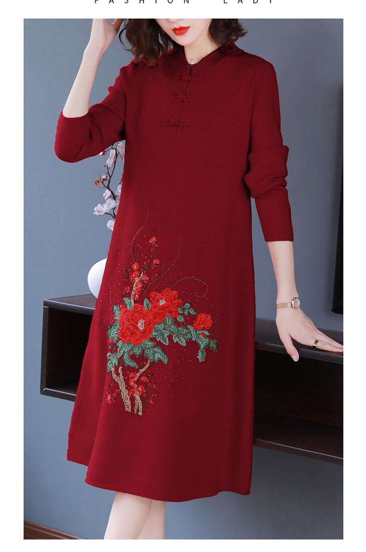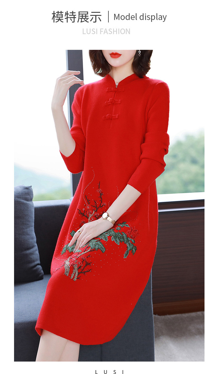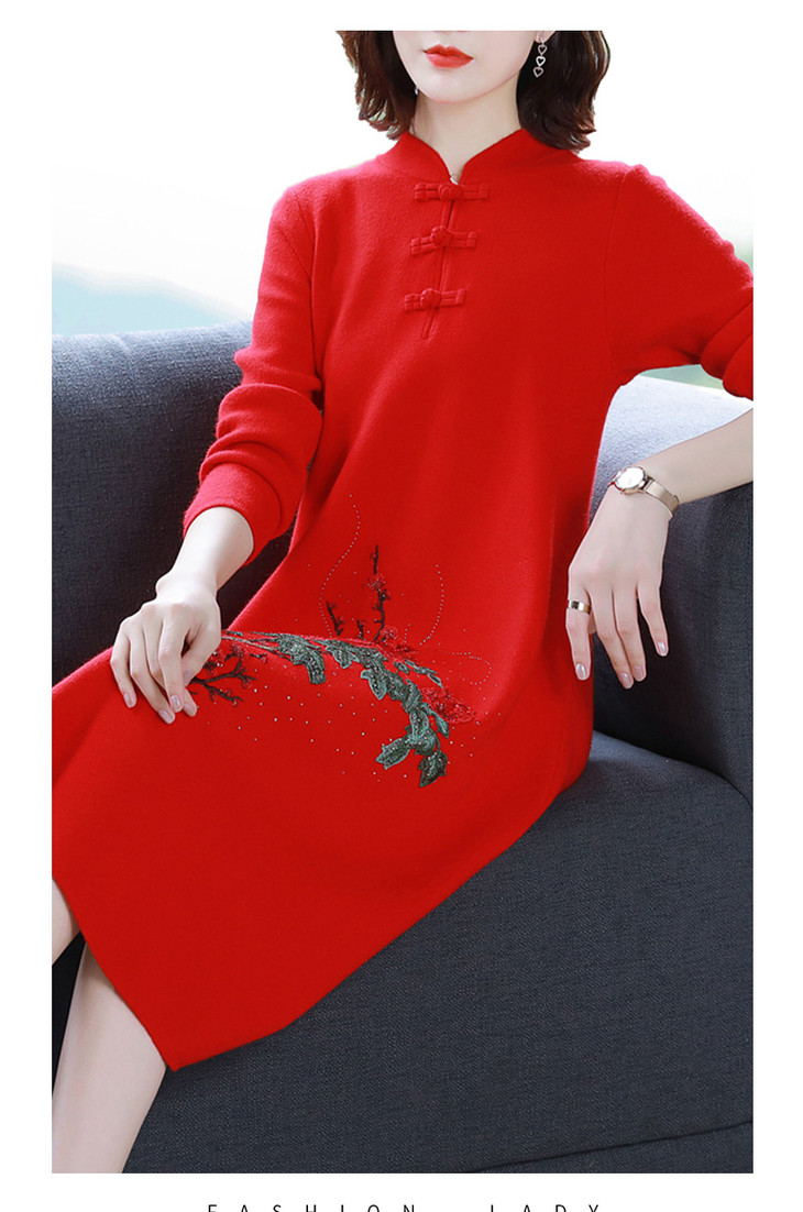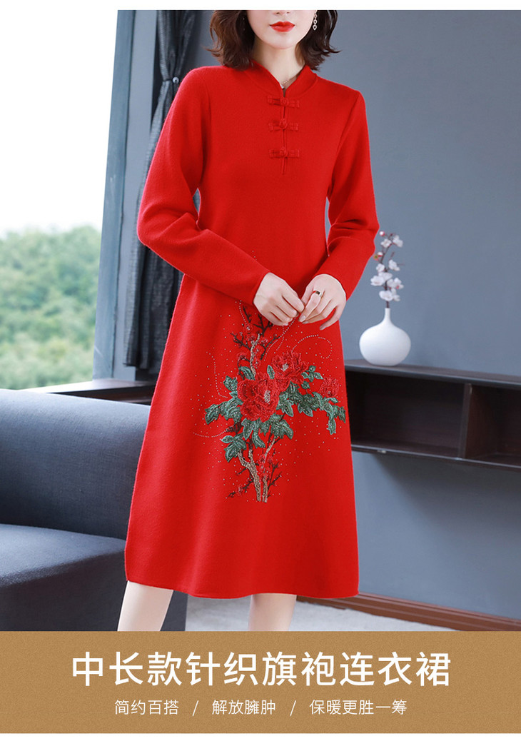 qf-72-8633红色烫钻盘扣立领旗袍春秋装针织绣花连衣裙