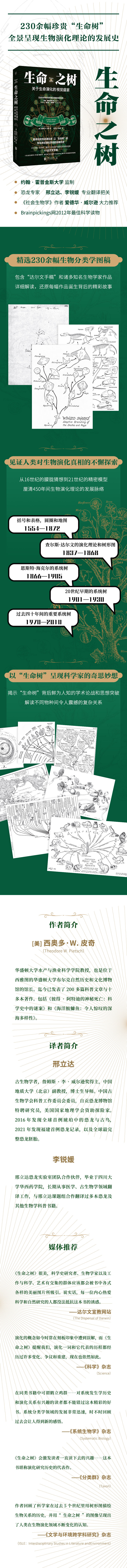 《生命之树》是一本令人印象深刻的生物分类学图书,很少有图书会通过介绍大量专业图表的方式来梳理演化学说的发展历程。对生物学史研究者和生物分类学爱好者来说,这本书是十分珍贵的参考资料。作者精心挑选出 230 余幅极具代表性的树状图,并对它们逐一进行了介绍,分析了其科学意义和局限性。书中内容条理清晰,体例完整,细致地介绍了 5 个世纪以来科学家们不断完善演化学说的过程,有很高的学术价值。对普通读者而言,这是一本翔实又有趣的科普书籍。读这本书时,不仅能学到各种各样的生物学知识,还能了解那些发生在知名生物学家身上的故事,窥见他们智慧的一角。