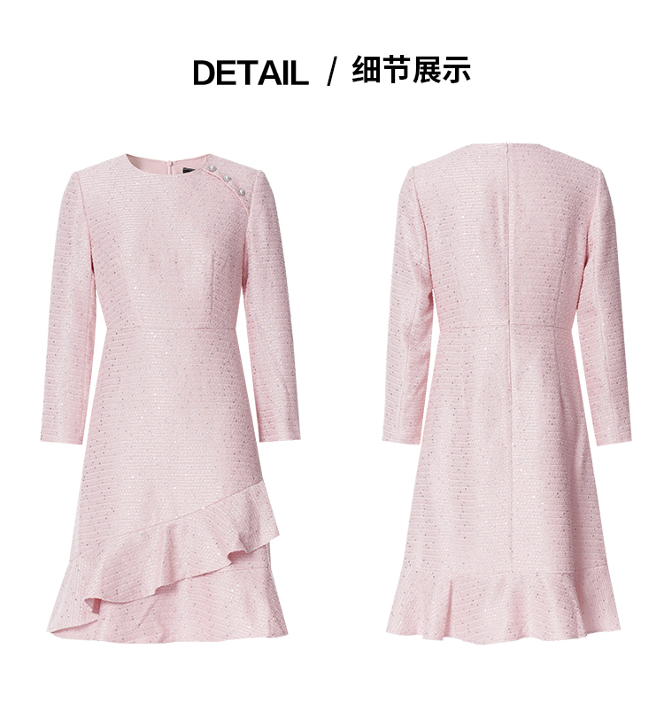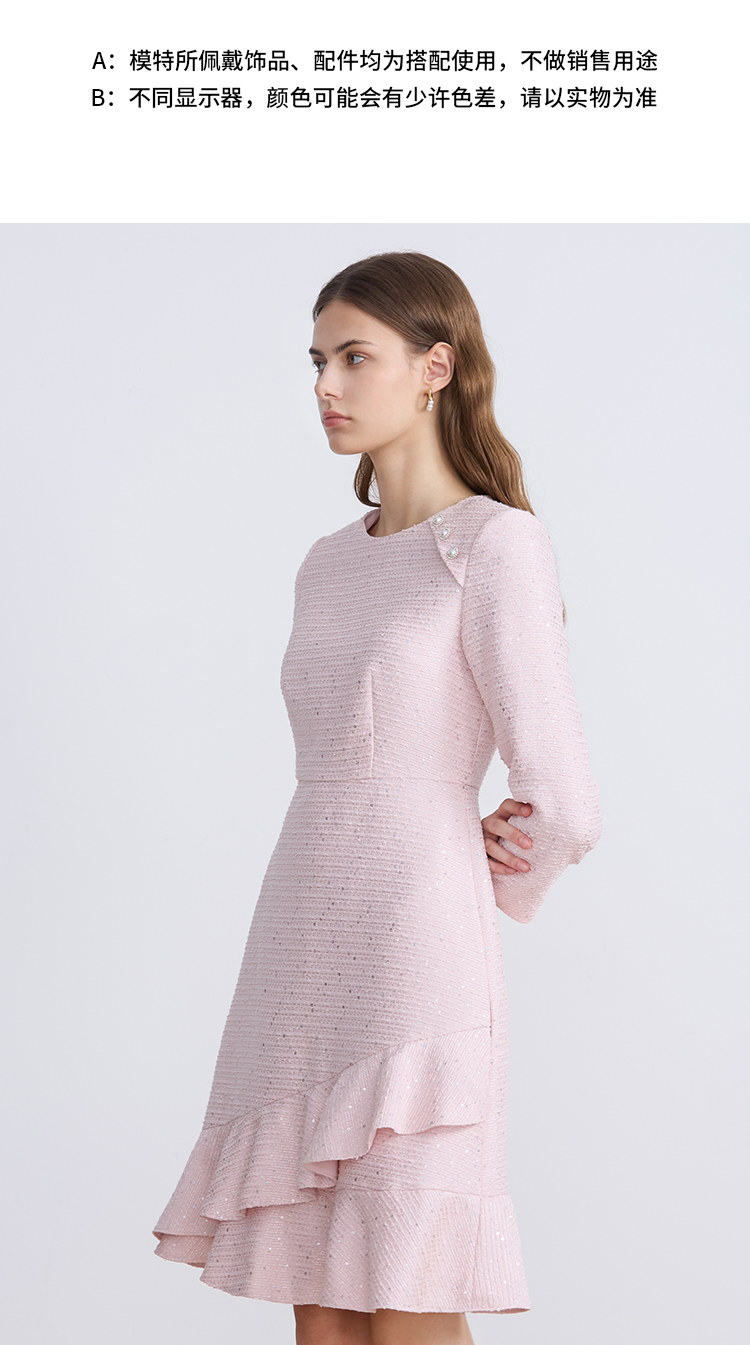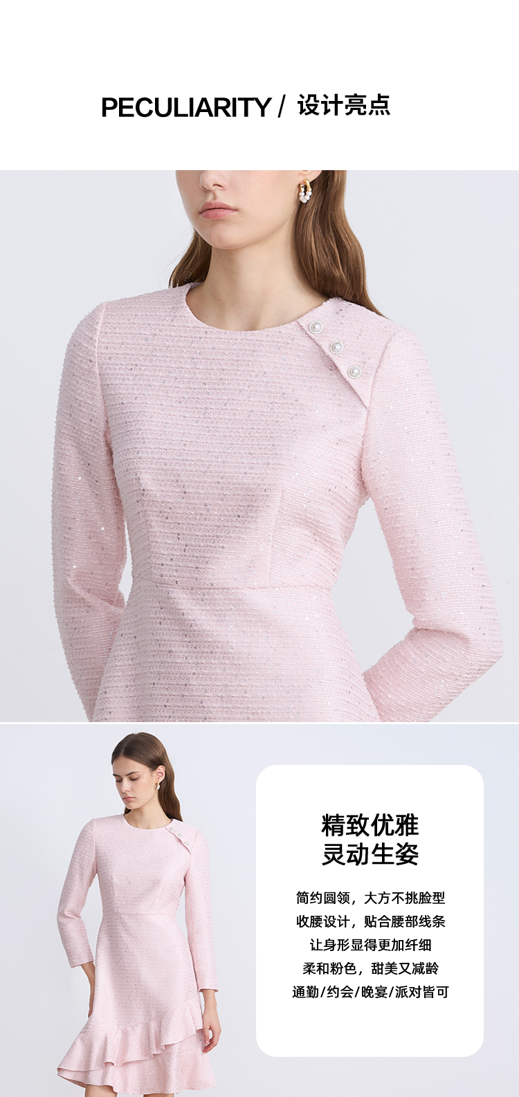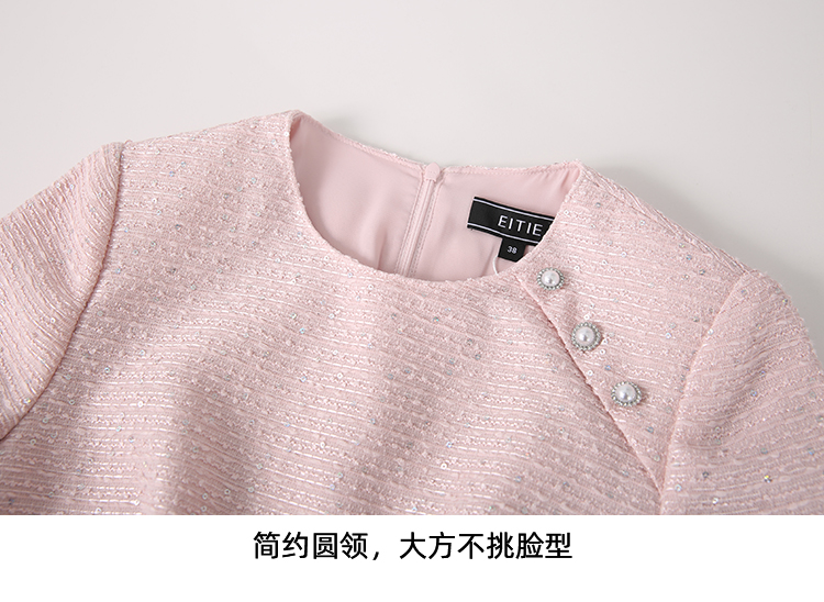 EITIE爱特爱精致粉色粗花呢荷叶裙摆圆领通勤2025秋季新款连衣裙C2507842