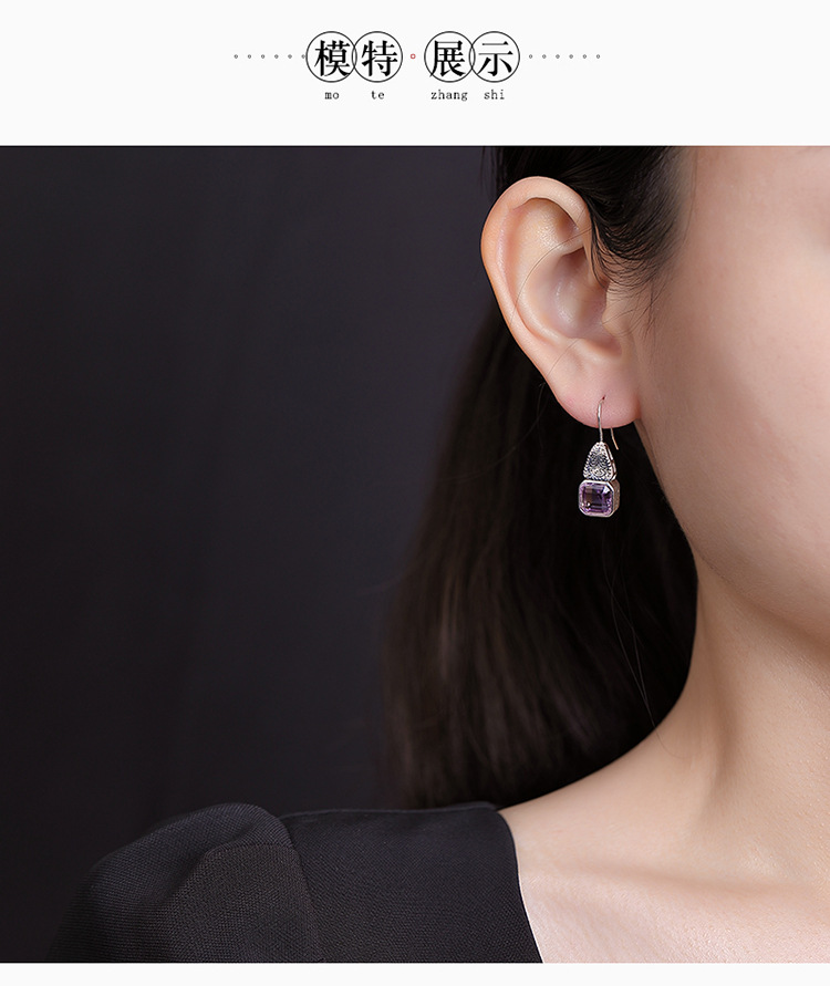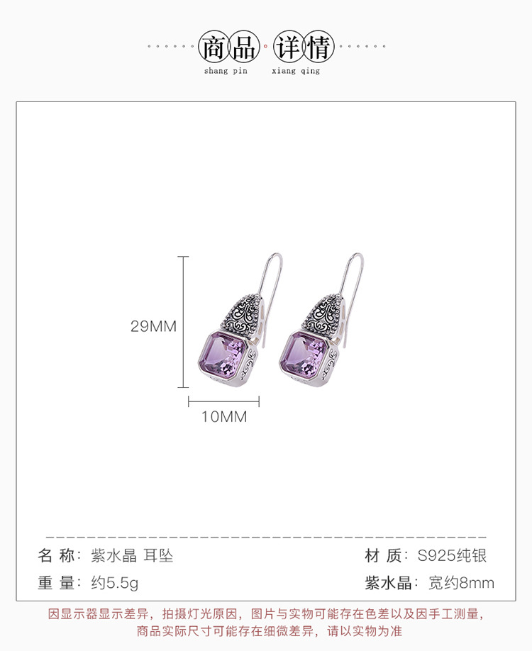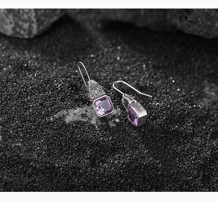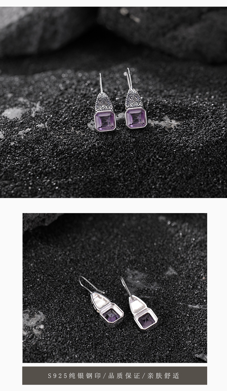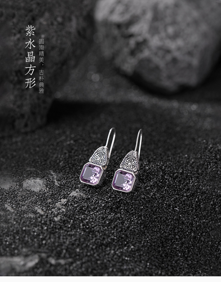 天然紫水晶S925纯银方形切面花纹,复古民族风银耳钩耳坠现货CW-EG02282