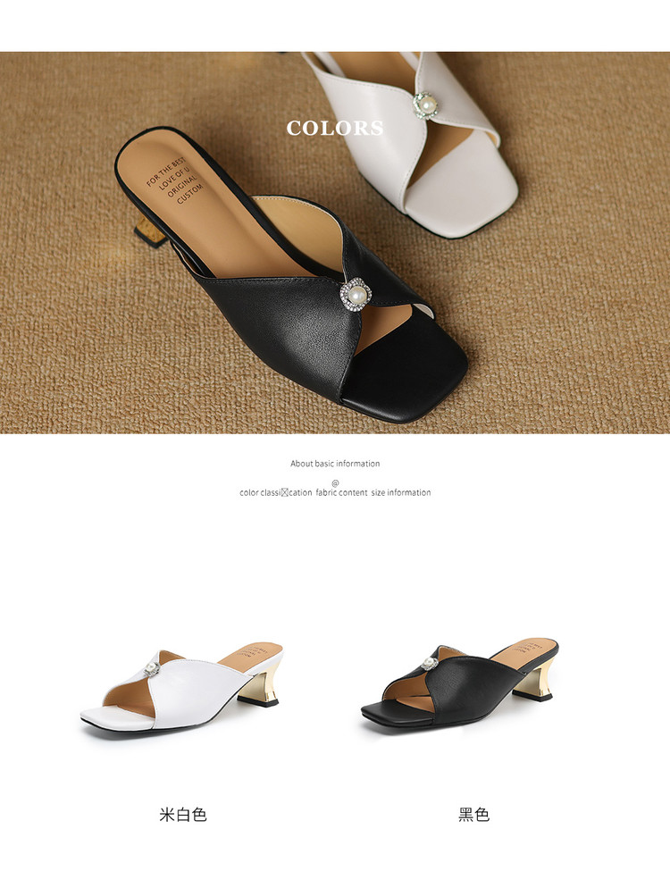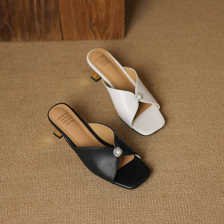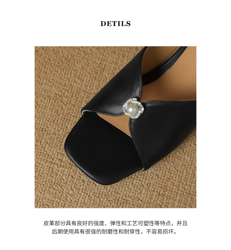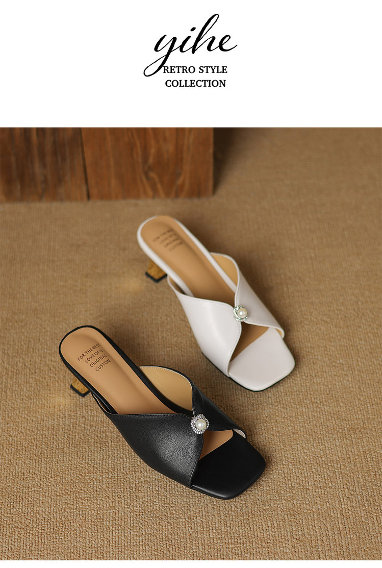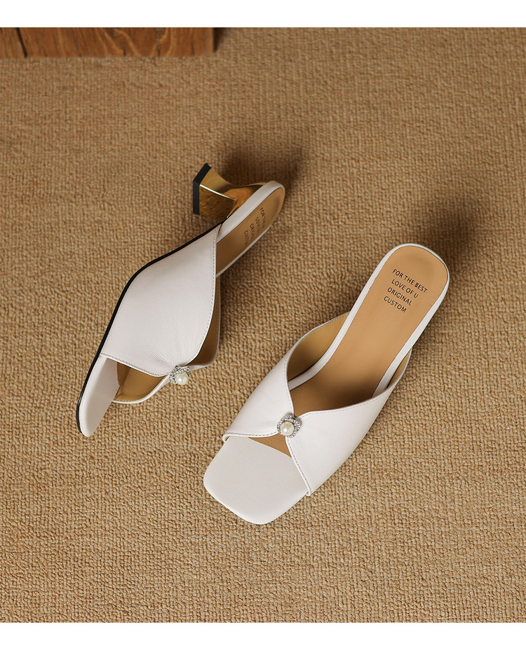 【预售5天】法式真皮粗跟一字半拖凉鞋女夏季新款百搭珍珠凉拖鞋外穿DS&1691
