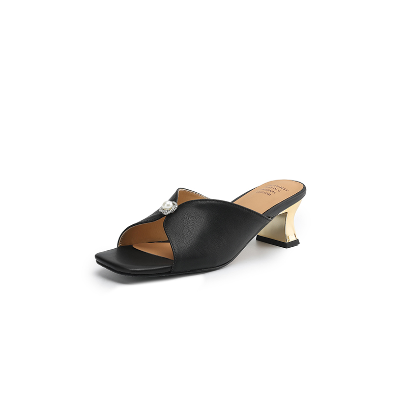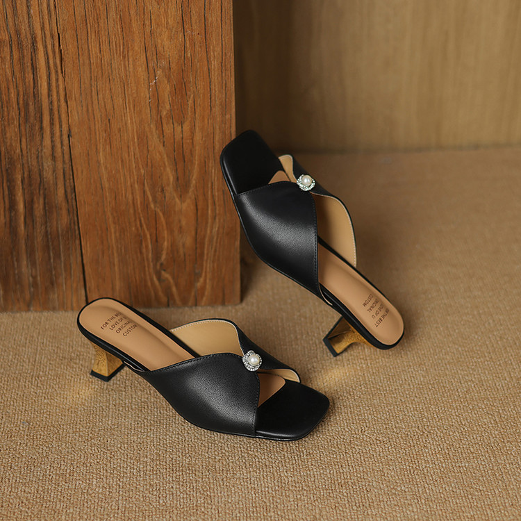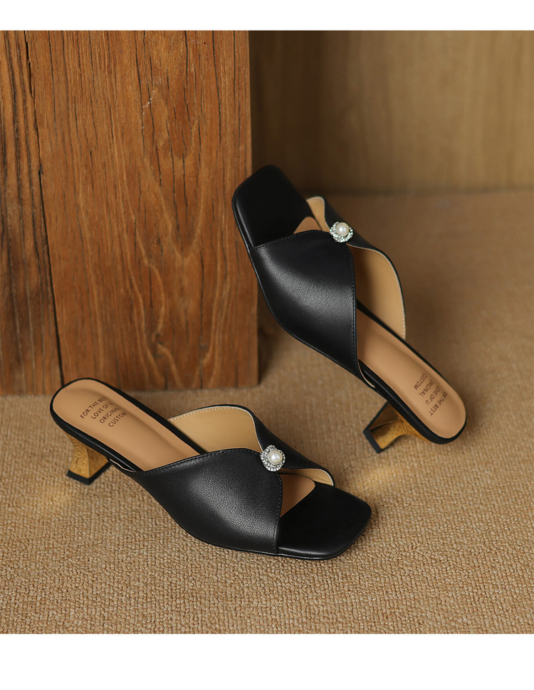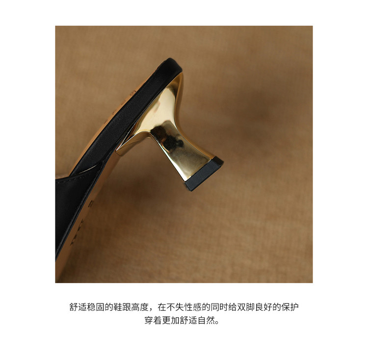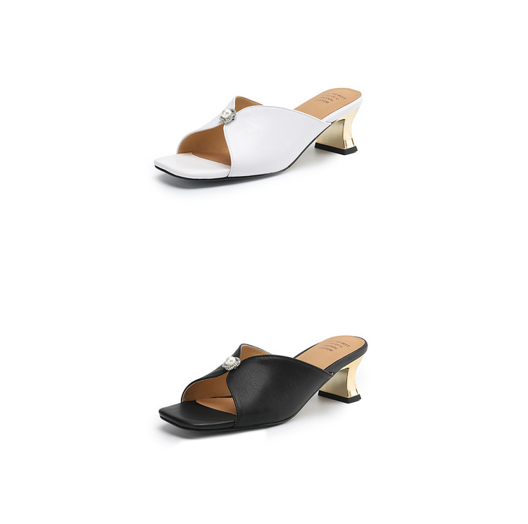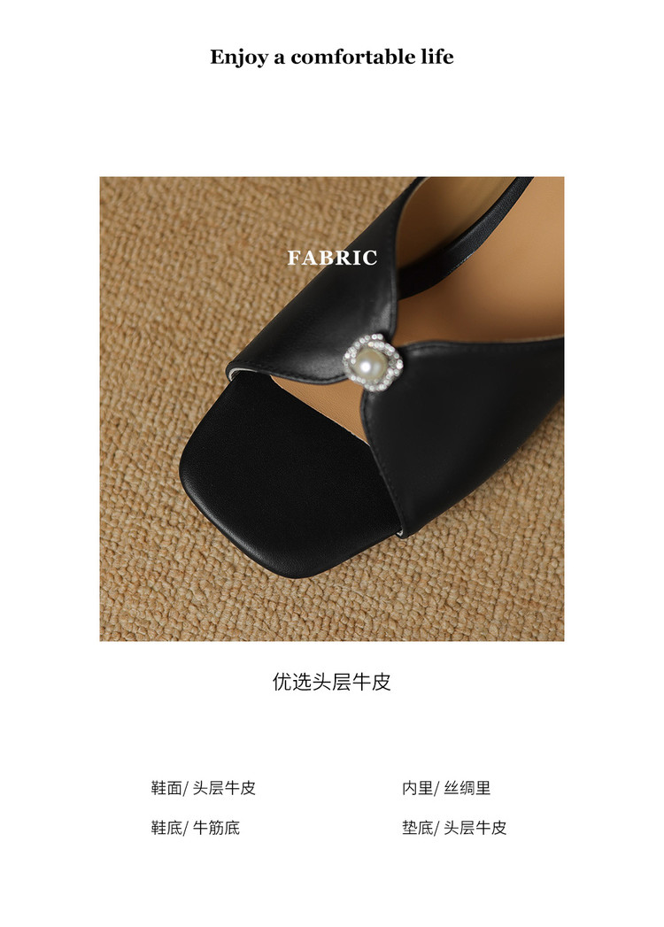 【预售5天】法式真皮粗跟一字半拖凉鞋女夏季新款百搭珍珠凉拖鞋外穿DS&1691