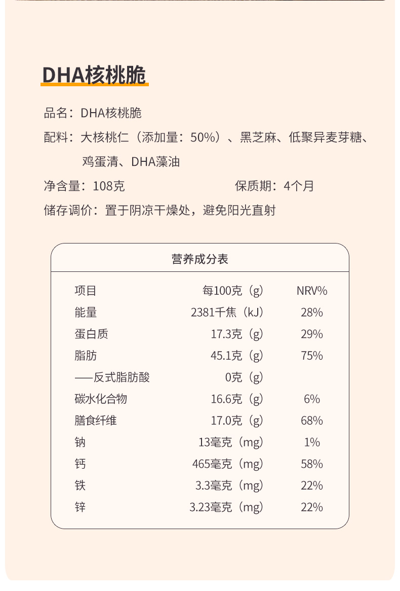 配料:大核桃仁(添加量:50%),黑芝麻,低聚异麦芽糖,鸡蛋清,DHA藻油