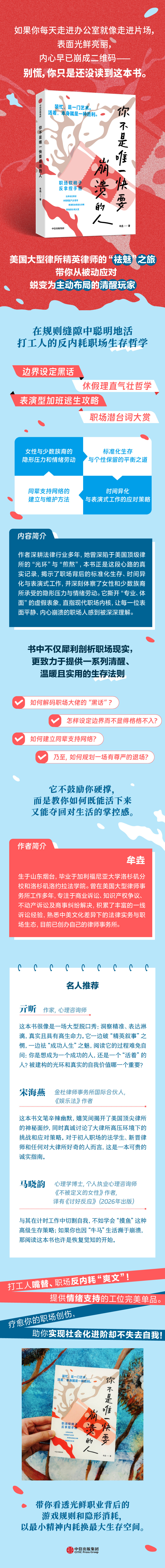 作为美国级律所的新人律师,作者曾深陷于级律所的“光环”与“煎熬”,本书正是这段心路的真实记录,揭示了职场背后的标准化生存、时间异化与表演式工作,并深刻体察了女性和少数族裔所承受的隐形压力与情绪劳动。它撕开“专业、体面”的虚假表象,直指现代职场内核,让每一位表面平静、内心崩溃的职场人感到被深深理解。书中不仅犀利剖析职场现实,更致力于提供一系列清醒、温暖且实用的生存法则: