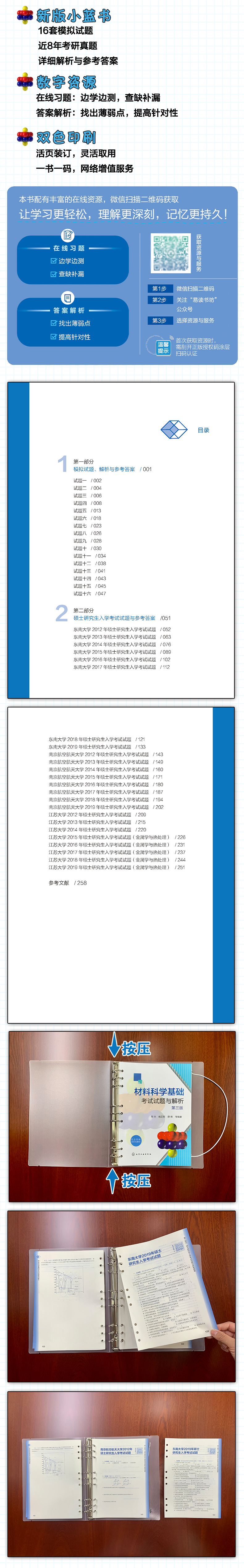 《材料科学基础考试试题与解析》是配合材料科学与工程专业“材料科学基础”课程的教学、学生课后练习及考研复习而编写的辅导书。包括模拟试题十六套及解析与参考答案、三所高校近年硕士研究生入学考试试题与参考答案等。本书采用活页装订,以试卷的形式直观呈现,方便读者模拟测试使用;数字资源配有在线习题、详细的习题解析等应用,并将持续改进完善。本书可供材料科学与工程、金属材料与工程、冶金工程等材料类专业师生以及科研技术人员参考,也可作为远程教学、网上学习效果自测的辅导材料。