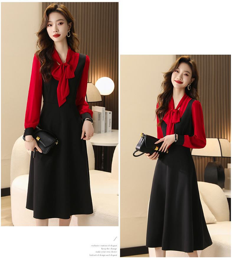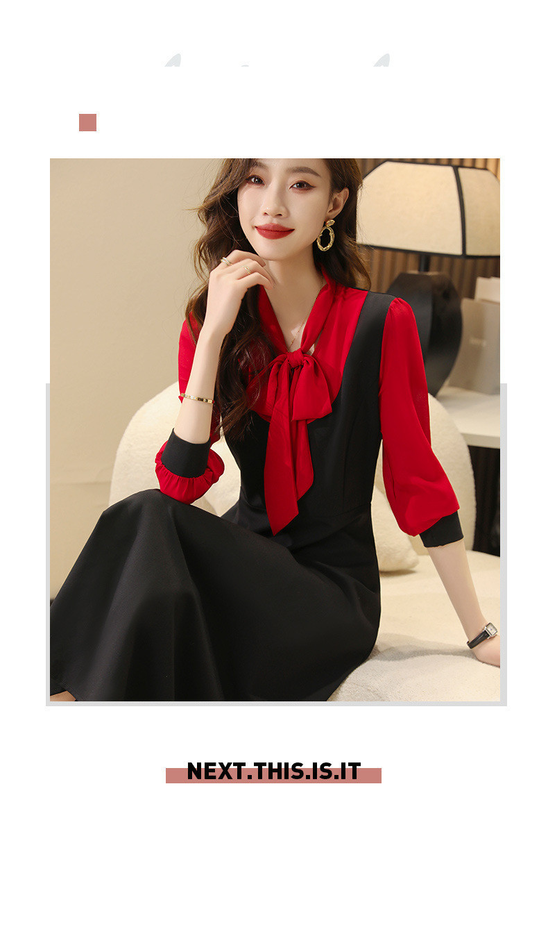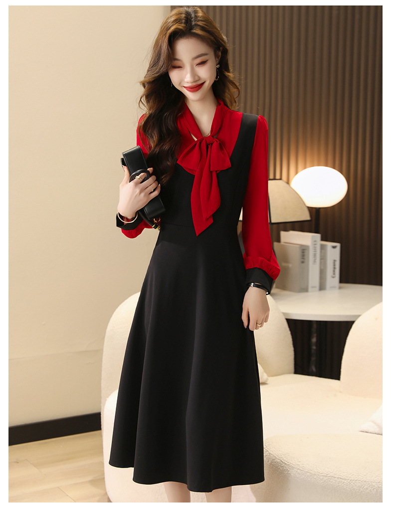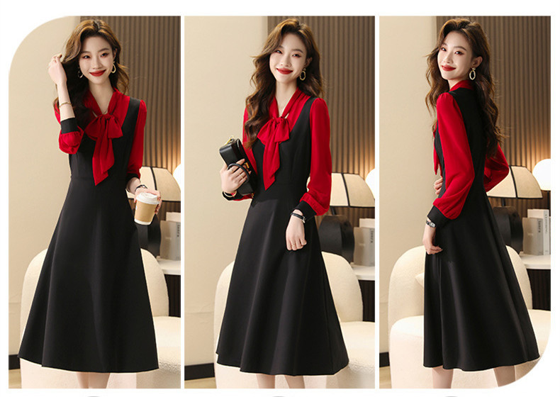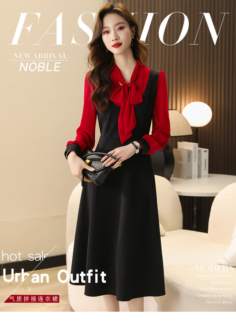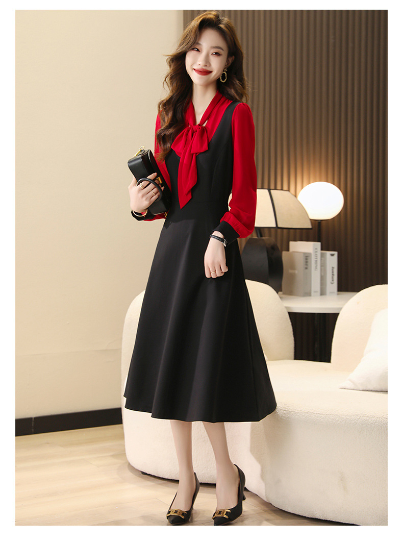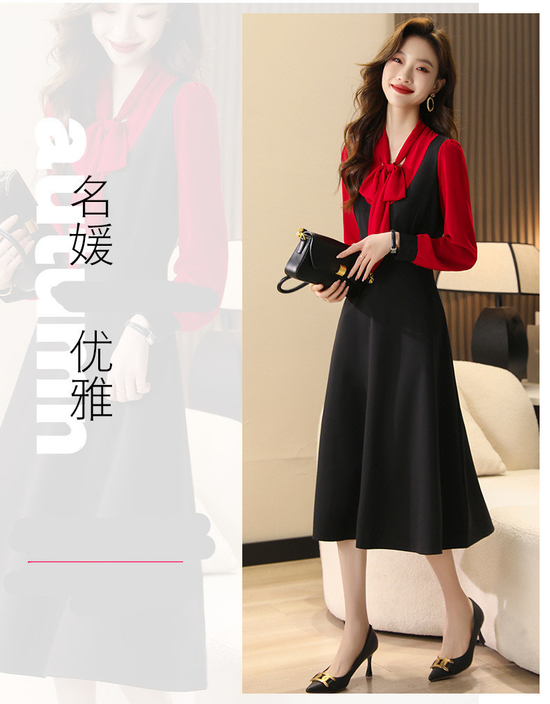 大码女装新款时尚拼接中长款假两件收腰显瘦蝴蝶结连衣裙