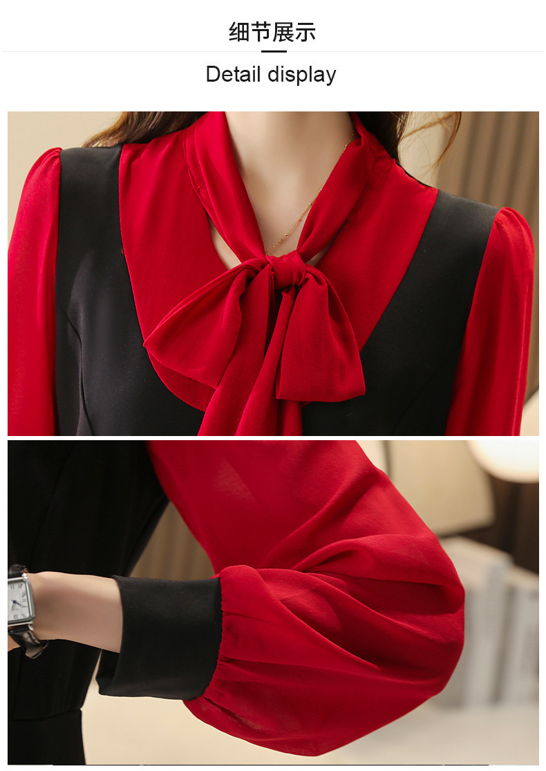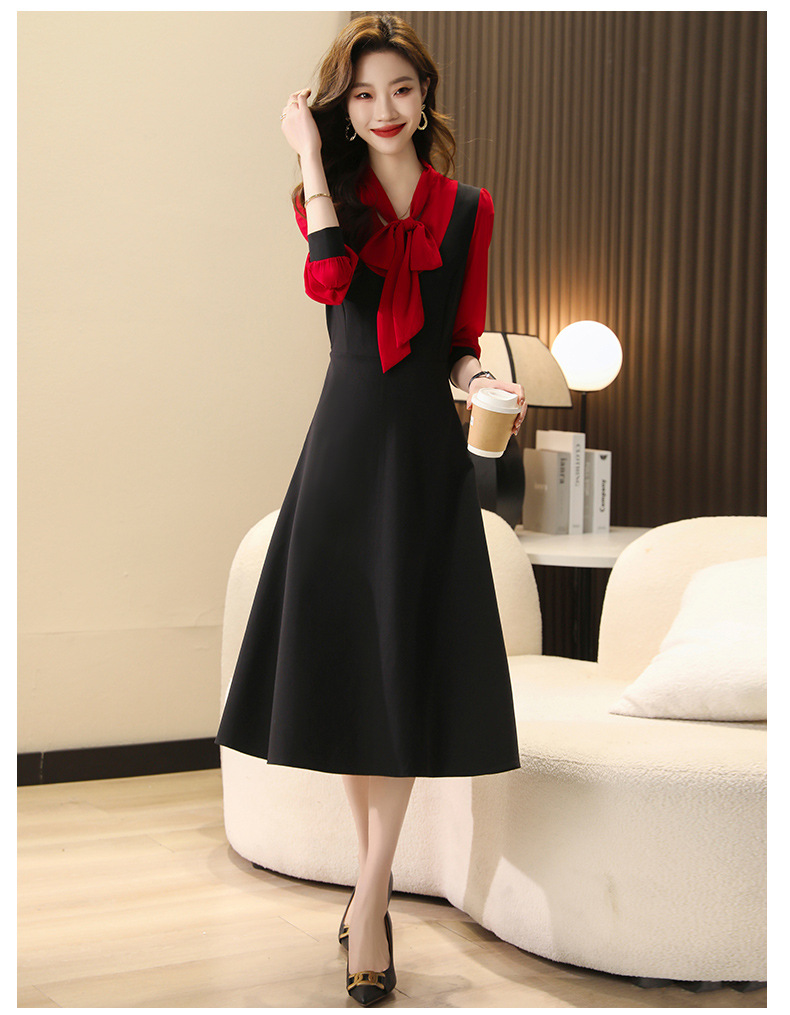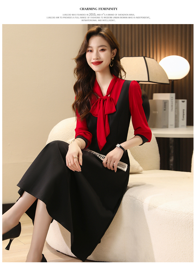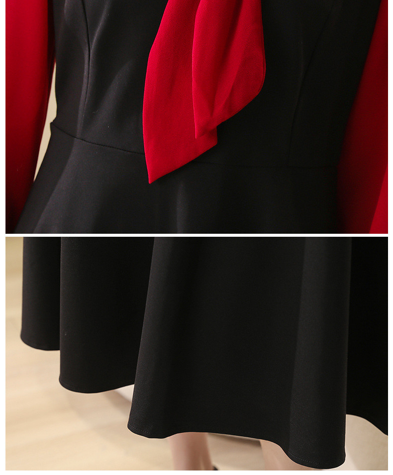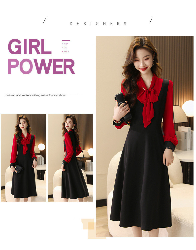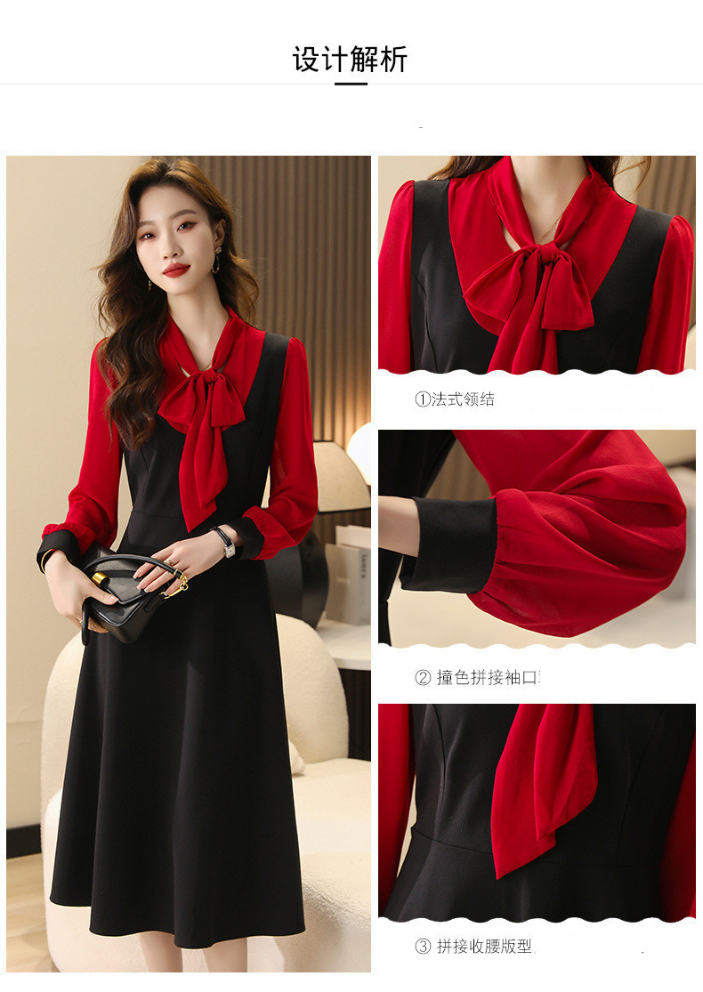 大码女装新款时尚拼接中长款假两件收腰显瘦蝴蝶结连衣裙