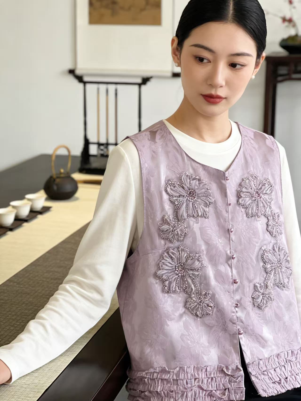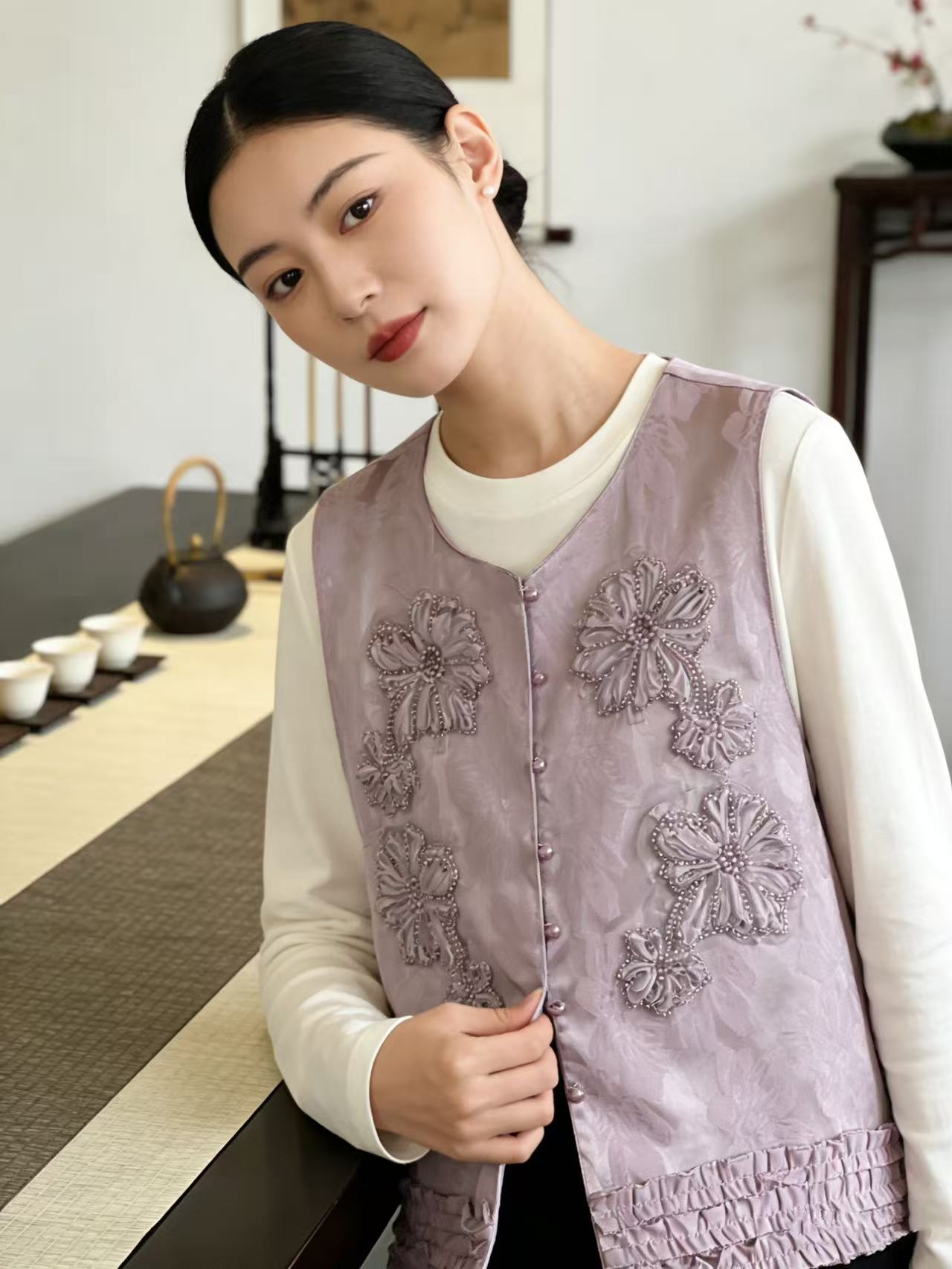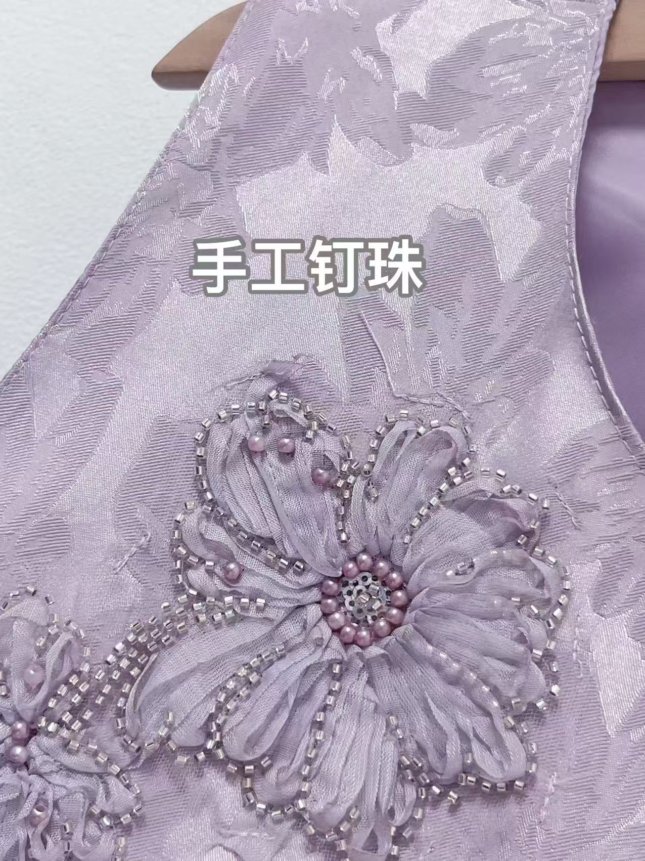 重工手工钉珠【自营】嫣紫花朵工艺提花新中式马甲上衣-喜出