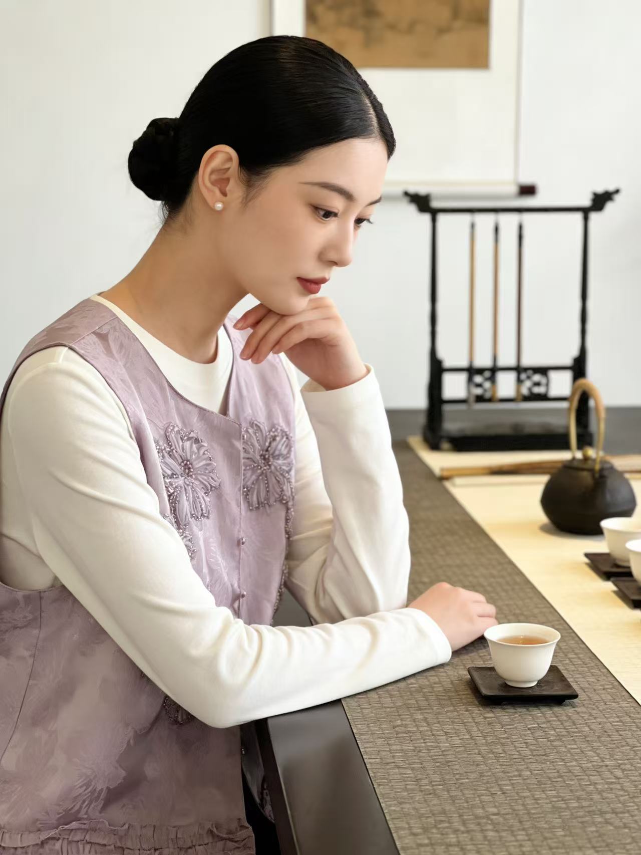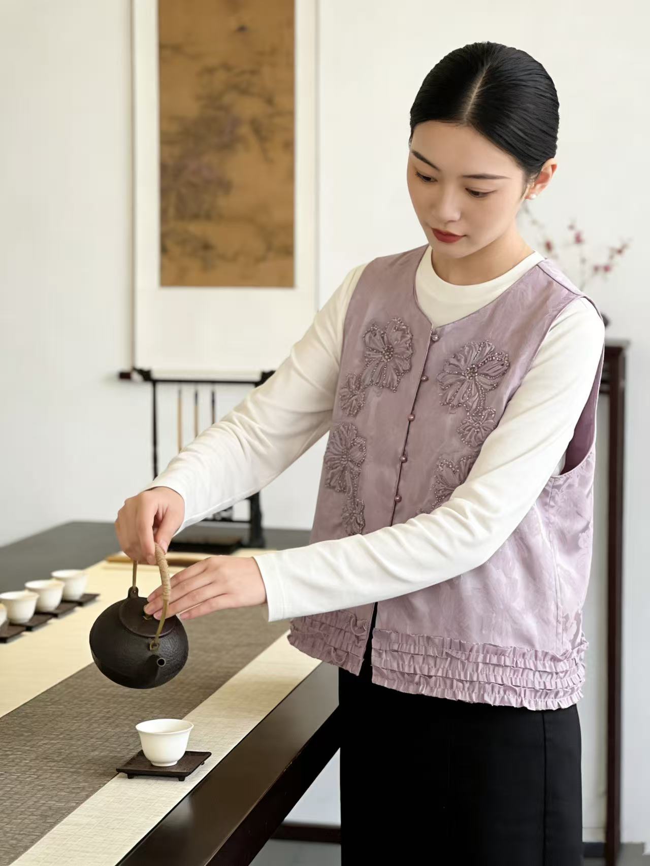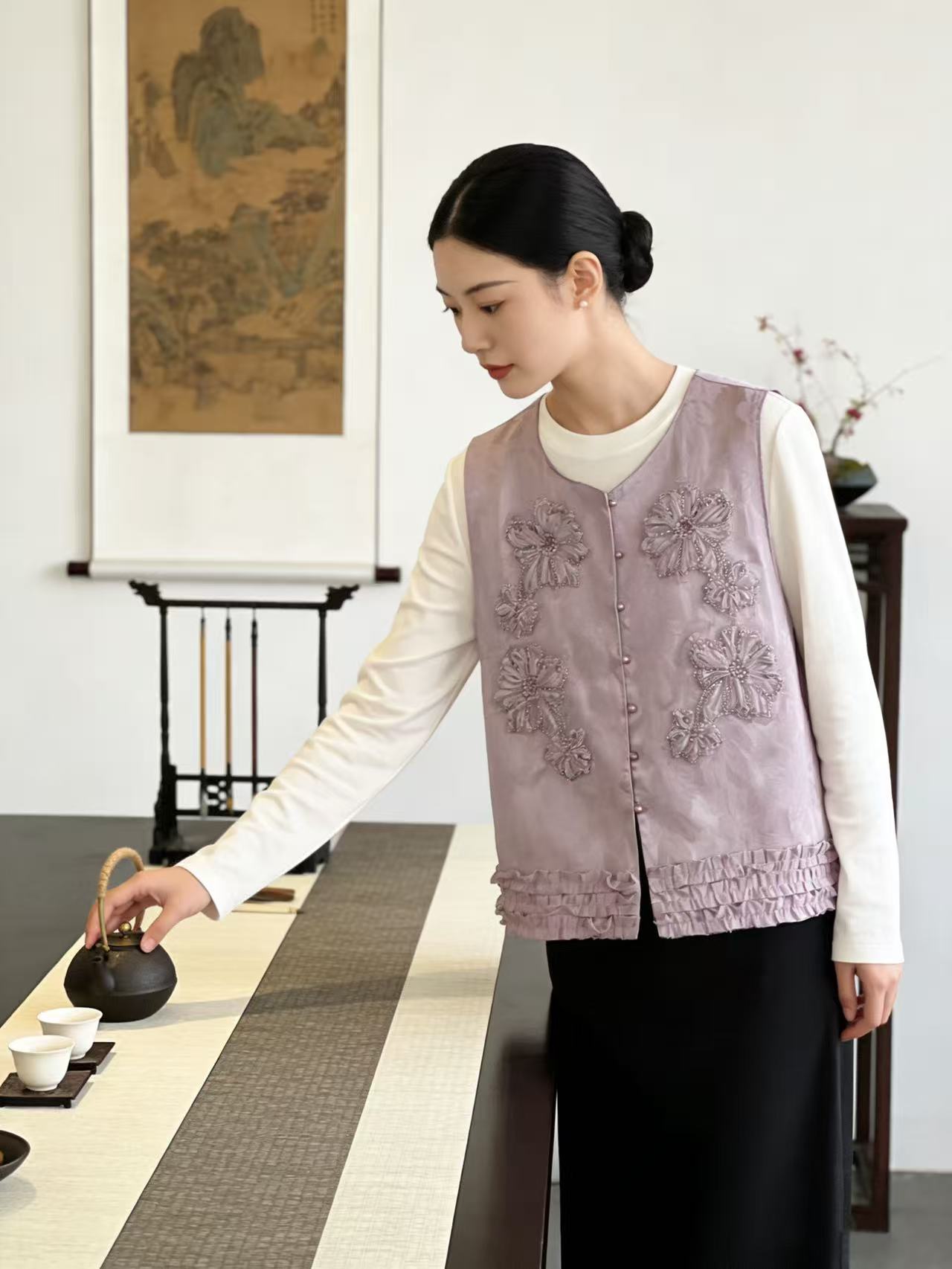 重工手工钉珠【自营】嫣紫花朵工艺提花新中式马甲上衣-喜出