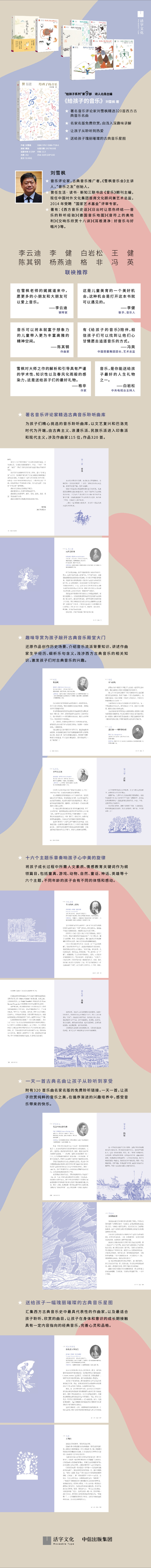1.诗人北岛主编“给孩子系列”第九部,音乐评论家刘雪枫精选320首西方古典音乐名曲,名家名版免费欣赏,由浅入深趣味讲解,让孩子从聆听到热爱,送给孩子一幅瑰丽璀璨的古典音乐星图。