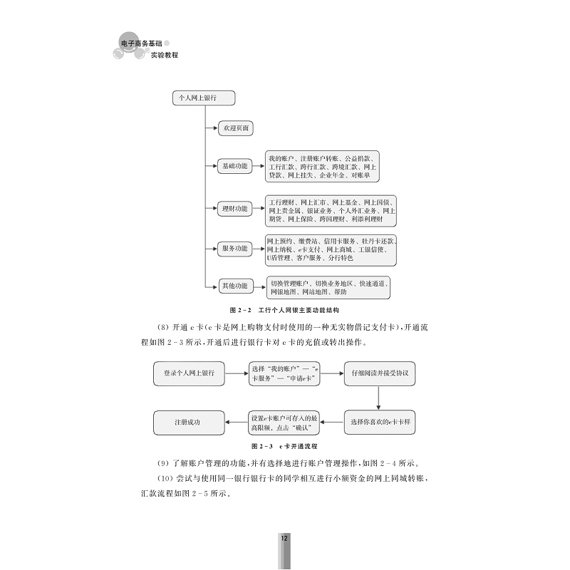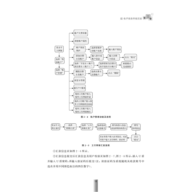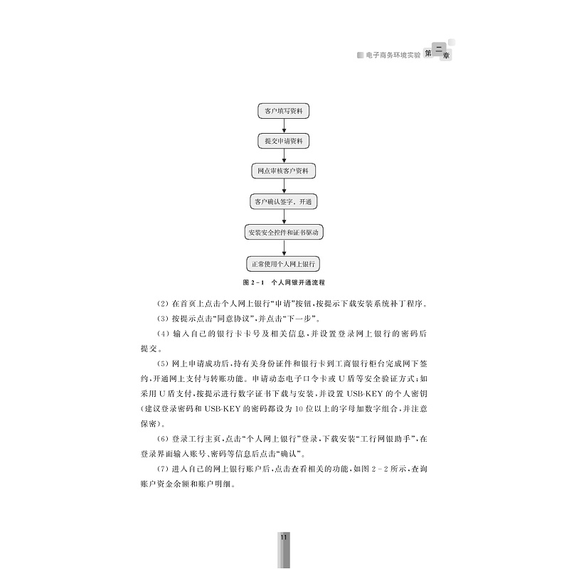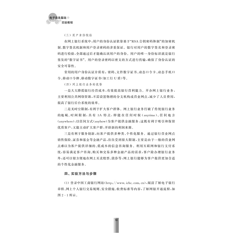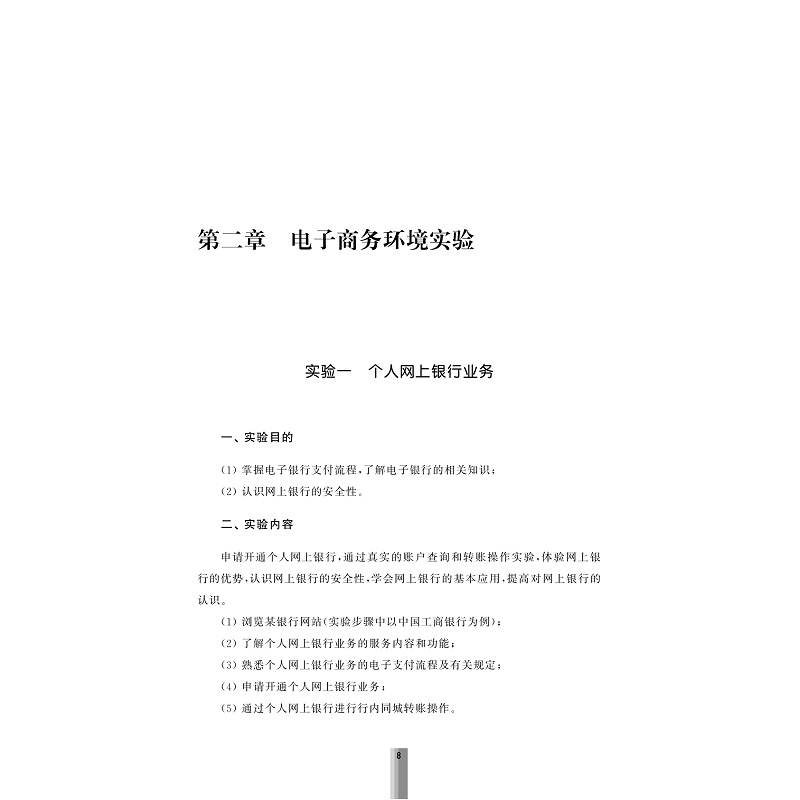 1.电子商务环境模块:该模式主要让学生学习掌握电子商务的环境因素,开展电子商务活动的真实支撑环境所涉及的支付、安全、物流等主要实验教学内容。由于互联网接入、邮件收发等基础都已成学生的普遍技能,本实验教程并不涉及。本模块主要包括网上银行实验、第三方支付实验、新型互联网金融及理财、电子商务安全、电子商务物流等实验内容。