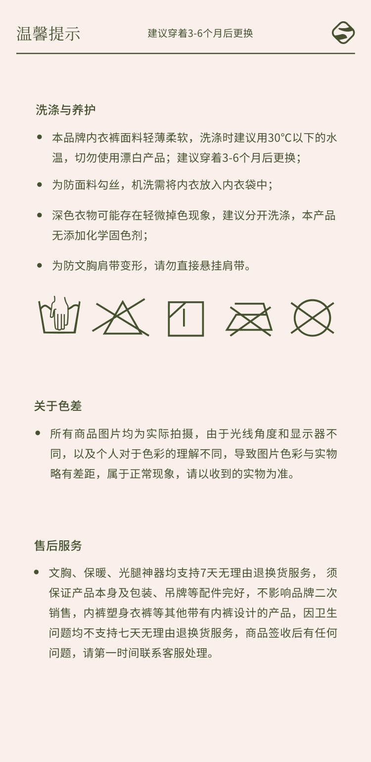 退换货规则:1.7天无理由退换货规则:品牌产品为贴身私密性衣物,务必保证所退产品吊牌水洗标齐全,无人为因素导致的破损、污渍、异味等影响二次销售的状况,否则,品牌有权不予退货退款,退货请将赠品一同寄回。内裤不支持7天无理由退换。换货差价将遵循多退少补的原则。