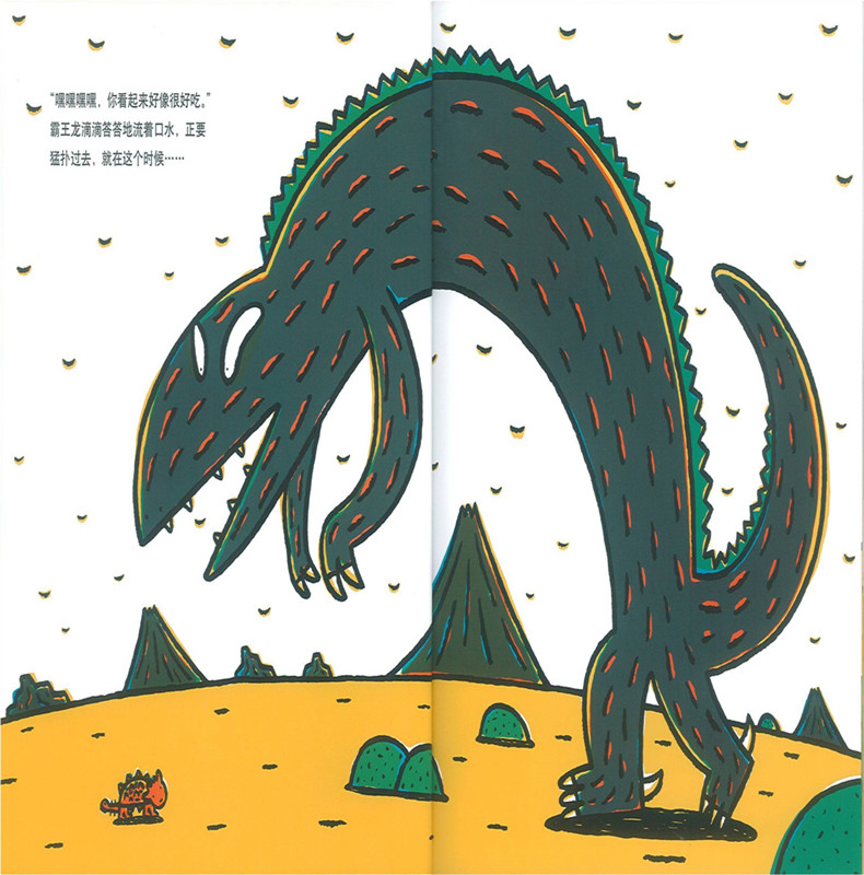 很久以前,在一个晴朗的日子里,山嘭嘭嘭地喷火,地咚咚咚地摇晃。这时,甲龙宝宝出生了。一天,它遇到了一头霸王龙,霸王龙流着口水,想要猛扑过去。就在这时,霸王龙忽然听到“爸爸”,原想吃掉小甲龙的霸王龙被小甲龙的一句“我想早点长得像爸爸一样!”击中了心底的柔情,从而改变了小甲龙和霸王龙之间的关系。小甲龙与霸王龙之间的感人的亲情让人为之动容,孩子在听故事之余,更可以潜移默化地体验到爱与被爱的快乐、人与人之间交往的真谛。