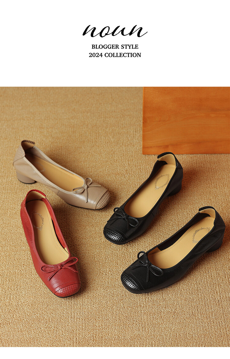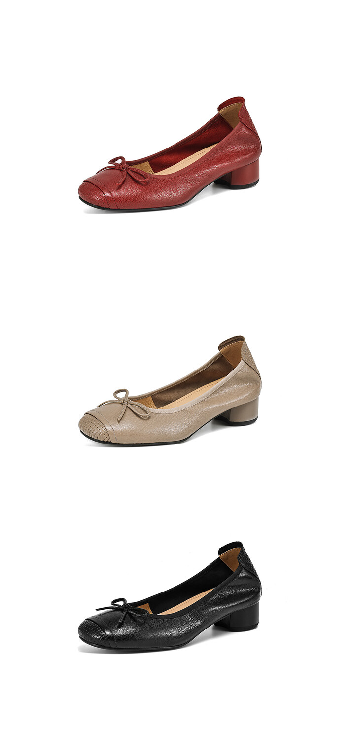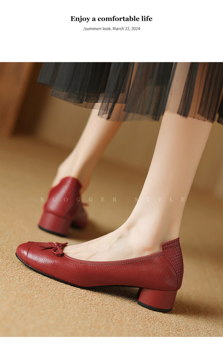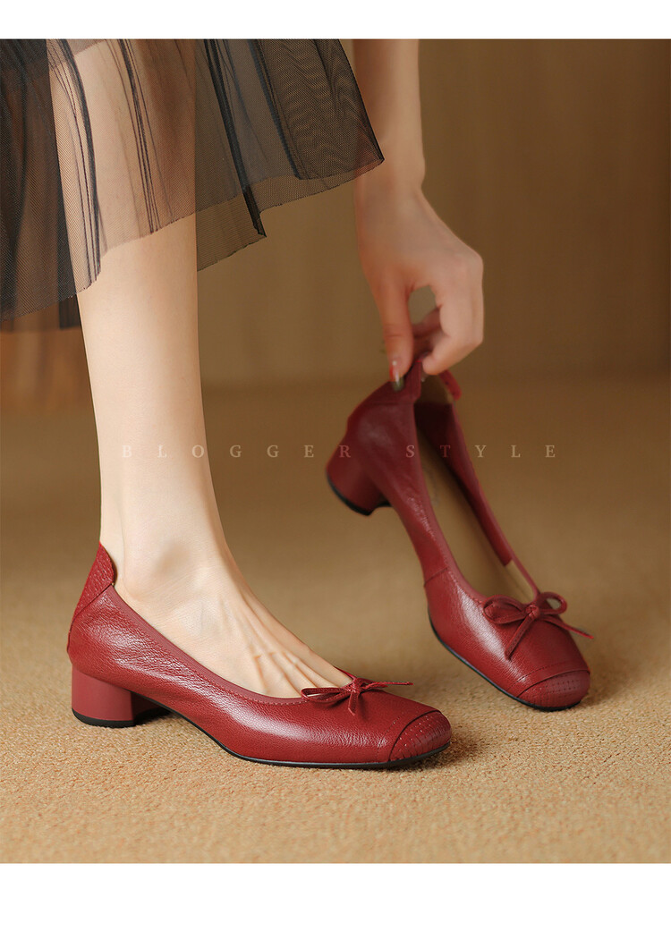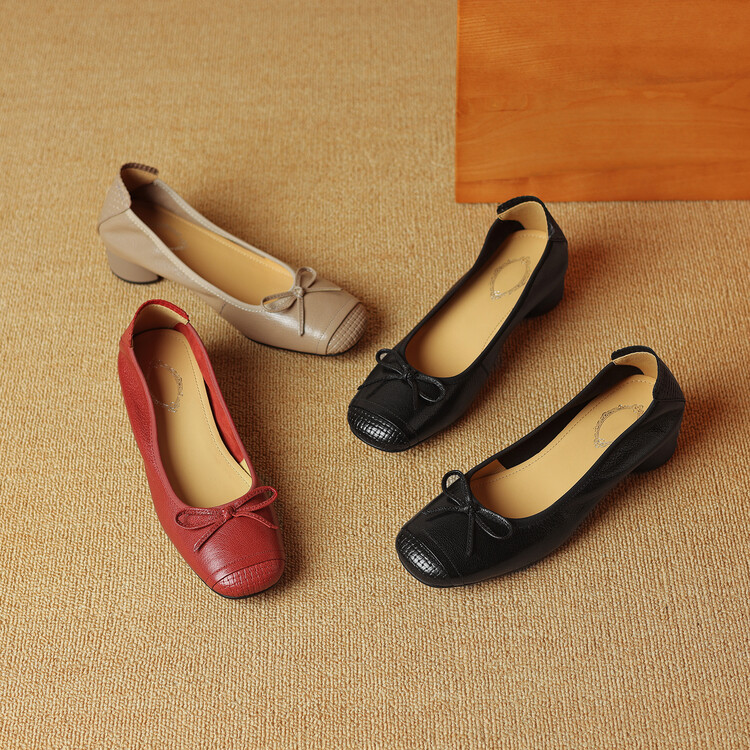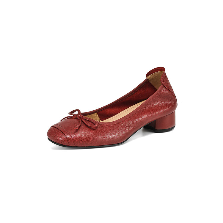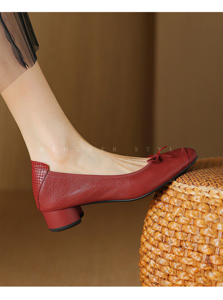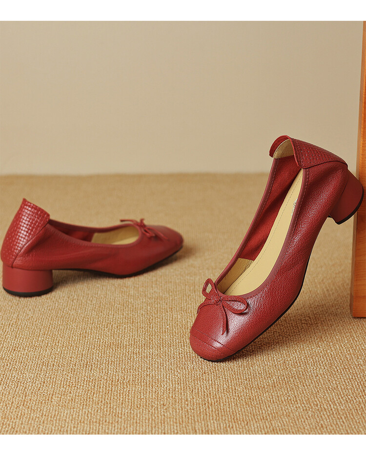 【预售5天】软羊皮单鞋女春秋浅口蝴蝶结红色软底粗跟中跟真皮通勤女鞋DPJ&2673
