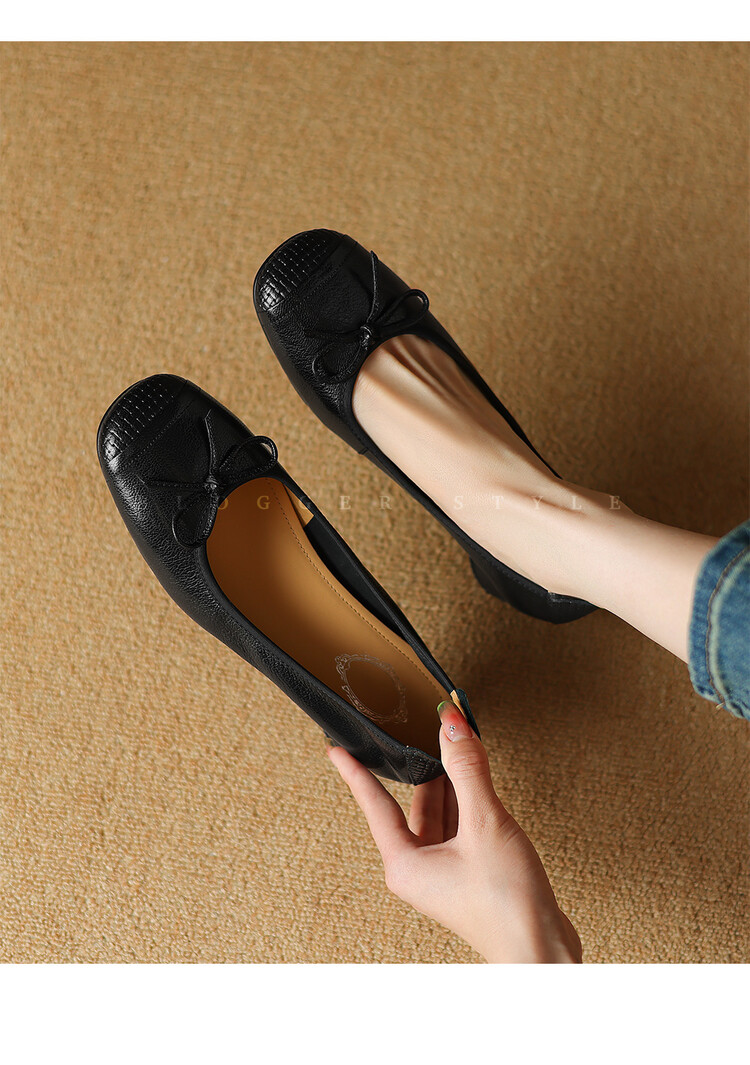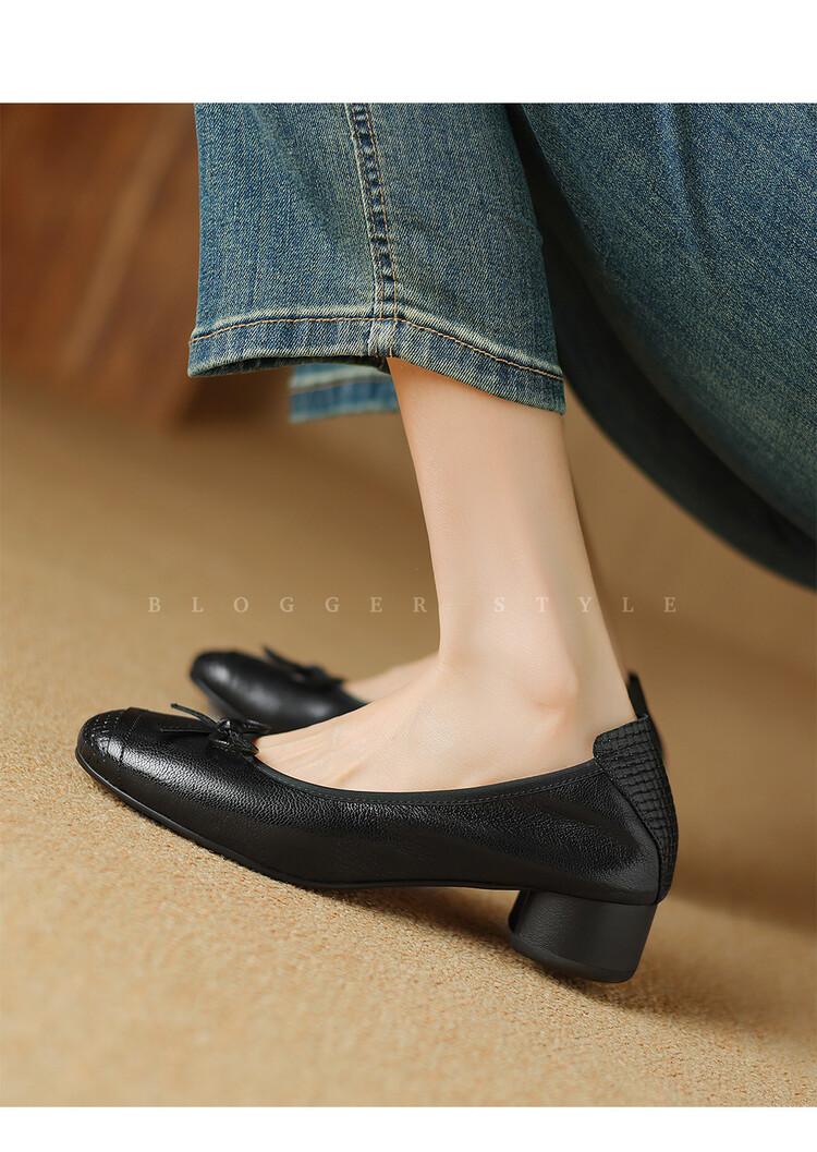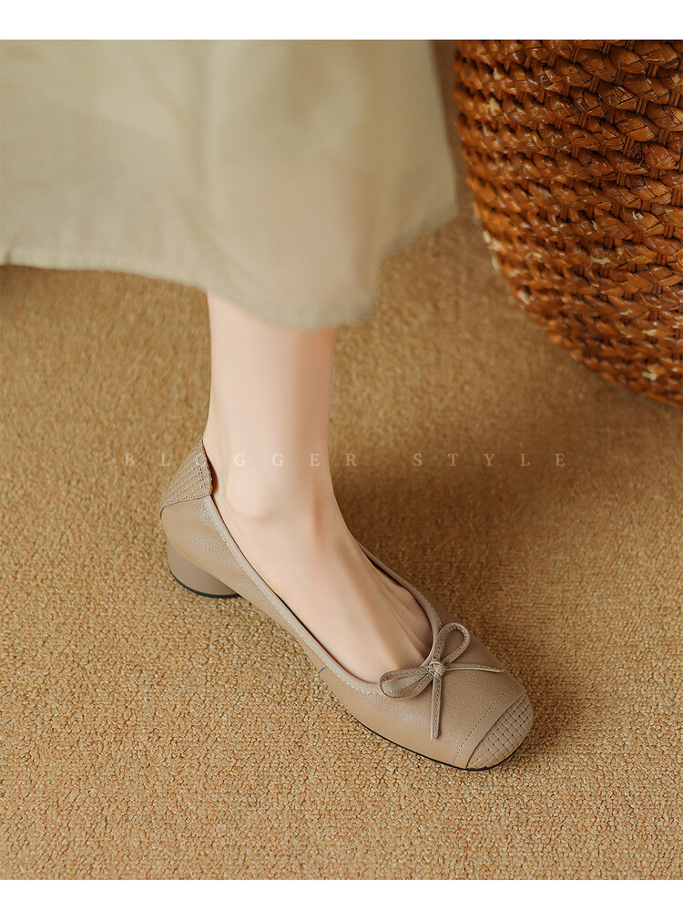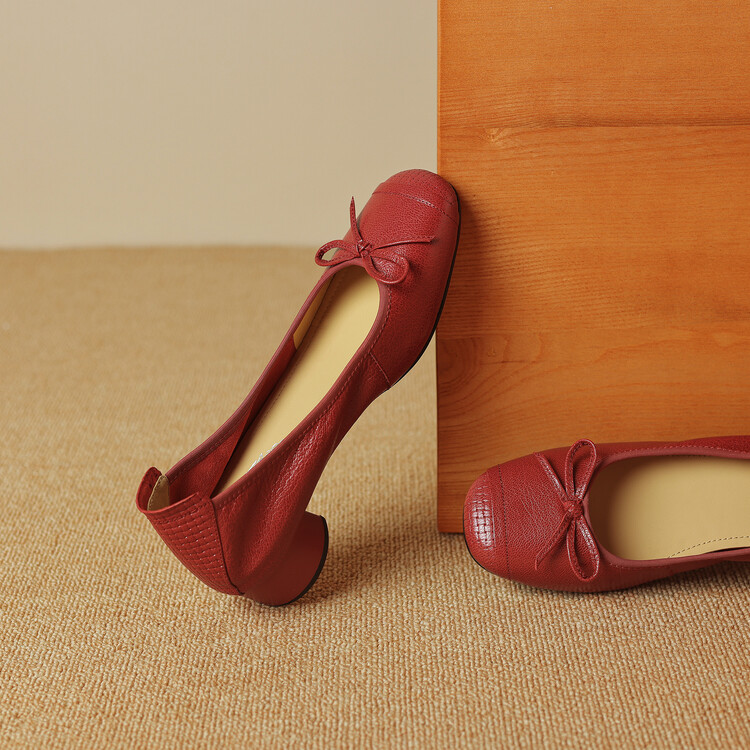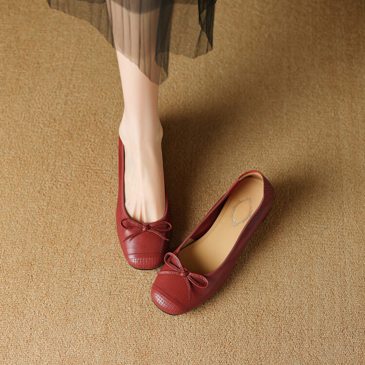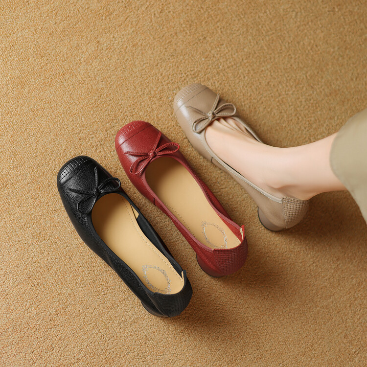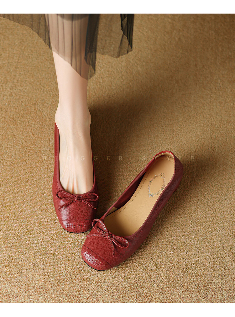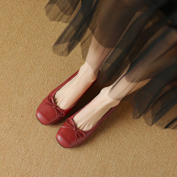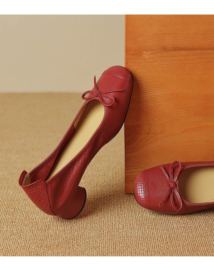 【预售5天】软羊皮单鞋女春秋浅口蝴蝶结红色软底粗跟中跟真皮通勤女鞋DPJ&2673
