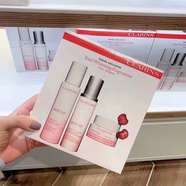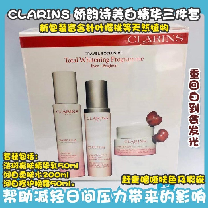 CLARINS 娇韵诗美白精华三件套👍新包装富含针叶樱桃🍒等天然植物,更侧重于提亮肤色✨,去黄,淡斑。润白柔肤水💦和精华乳💧可以有效👊击退黑色素,淡斑。滋润的晚霜在你睡眠时💤赶走暗哑肤色及瑕疵。帮助减轻日间压力带来的影响☀──可减淡黑斑、雀斑及调和不均肤色,让您在醒来时容光焕发💃、肤色更均匀😊~孕期黄气和孕斑都有效解决,重回白到会发光的小姐姐👅!套装包括:淡斑亮肤精华乳50ml➕润白柔肤水200ml➕润白修护晚霜50ml。