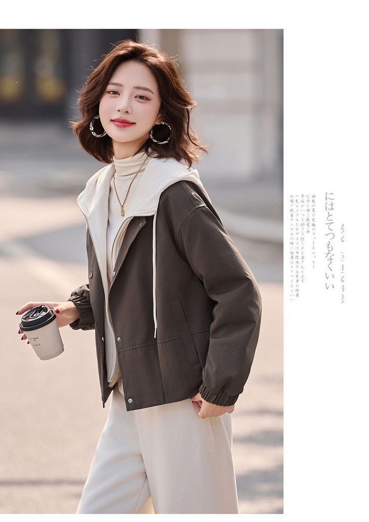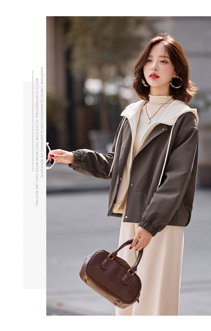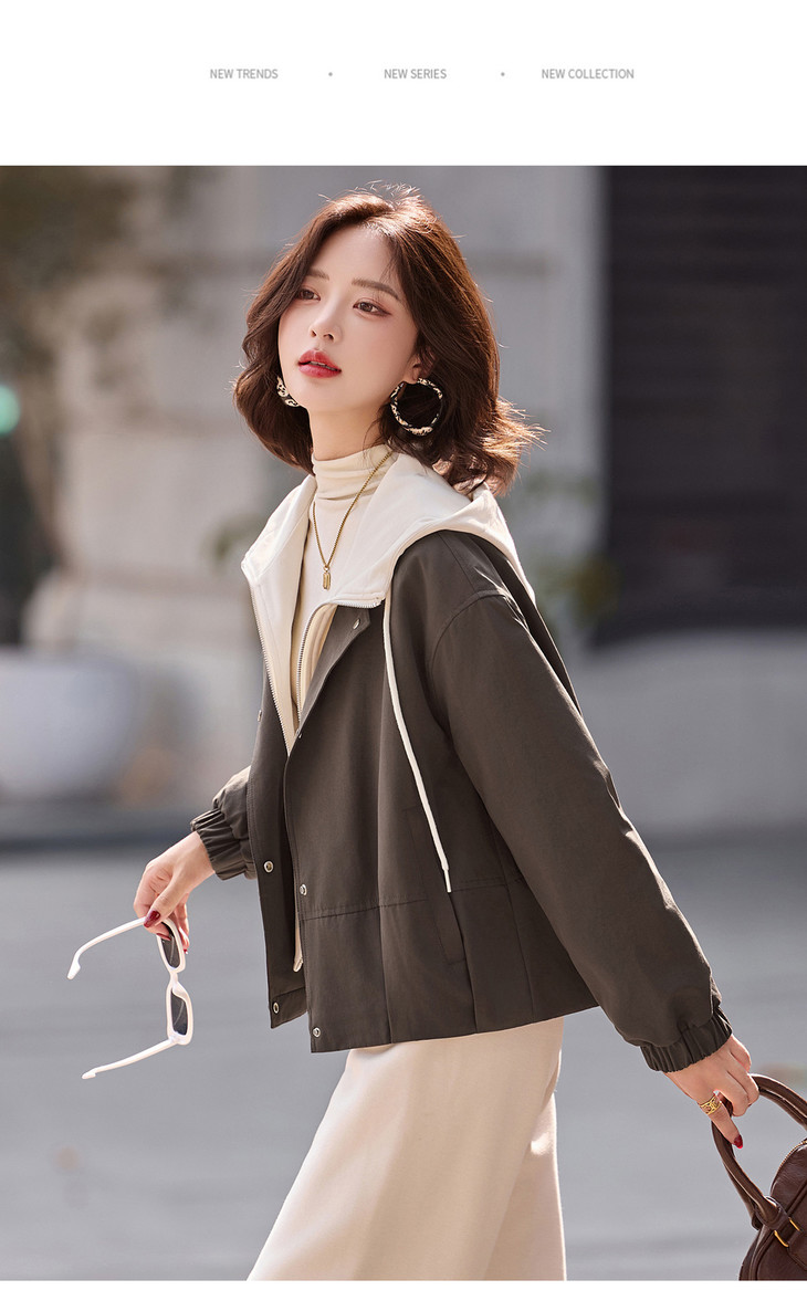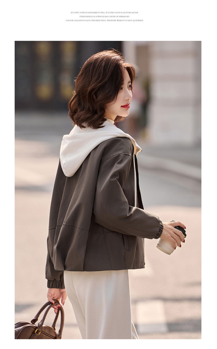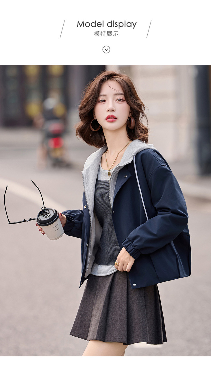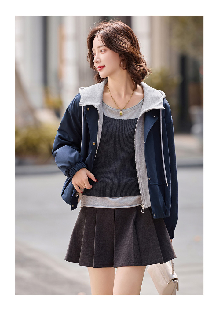 拼接假两件连帽加绒短外套,小个子休闲宽松夹克上衣HR-8951