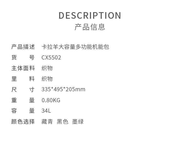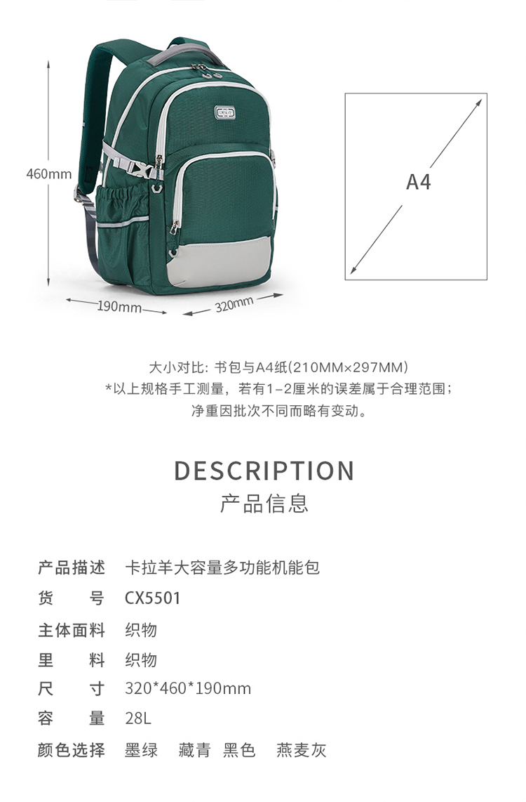 卡拉羊多功能大容量减负双肩机能包CX5501+CX5502