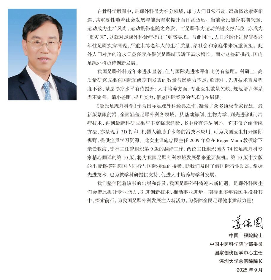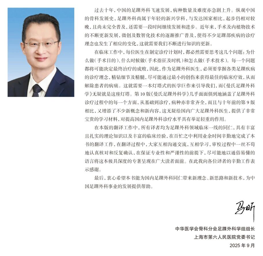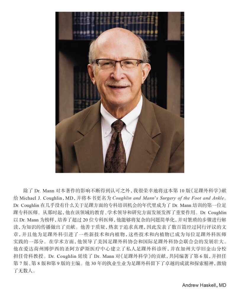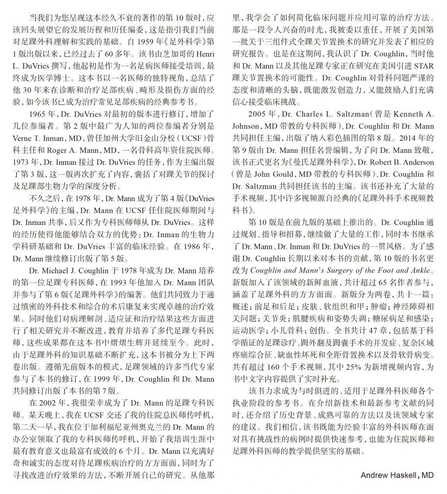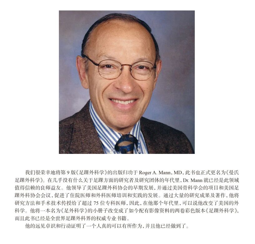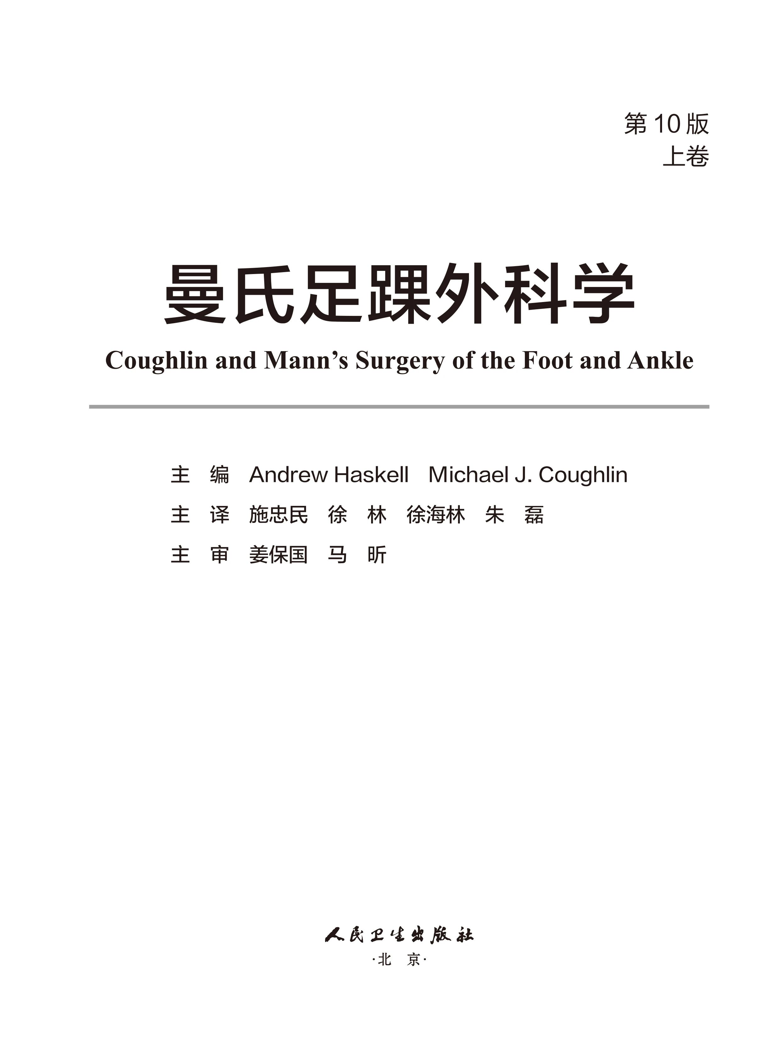 第 10 版《曼氏足踝外科学》介绍了与时俱进、涵盖全面的足踝疾病知识,针对足踝疾病治疗和管理的每一个主要方面提供了专家指导,内容涵盖生物力学、检查、诊断、非手术和手术治疗,以及术后管理。在介绍新技术和最新参考文献的同时,还介绍了历史背景、成熟可靠的方法以及该领域专家的建议。