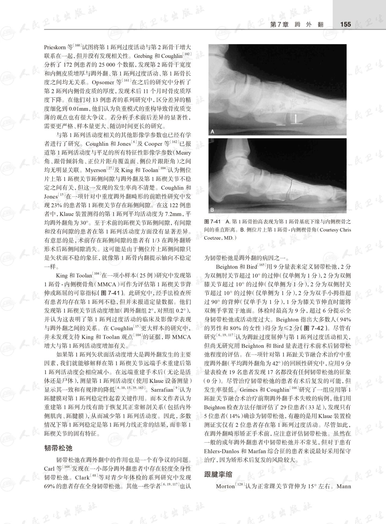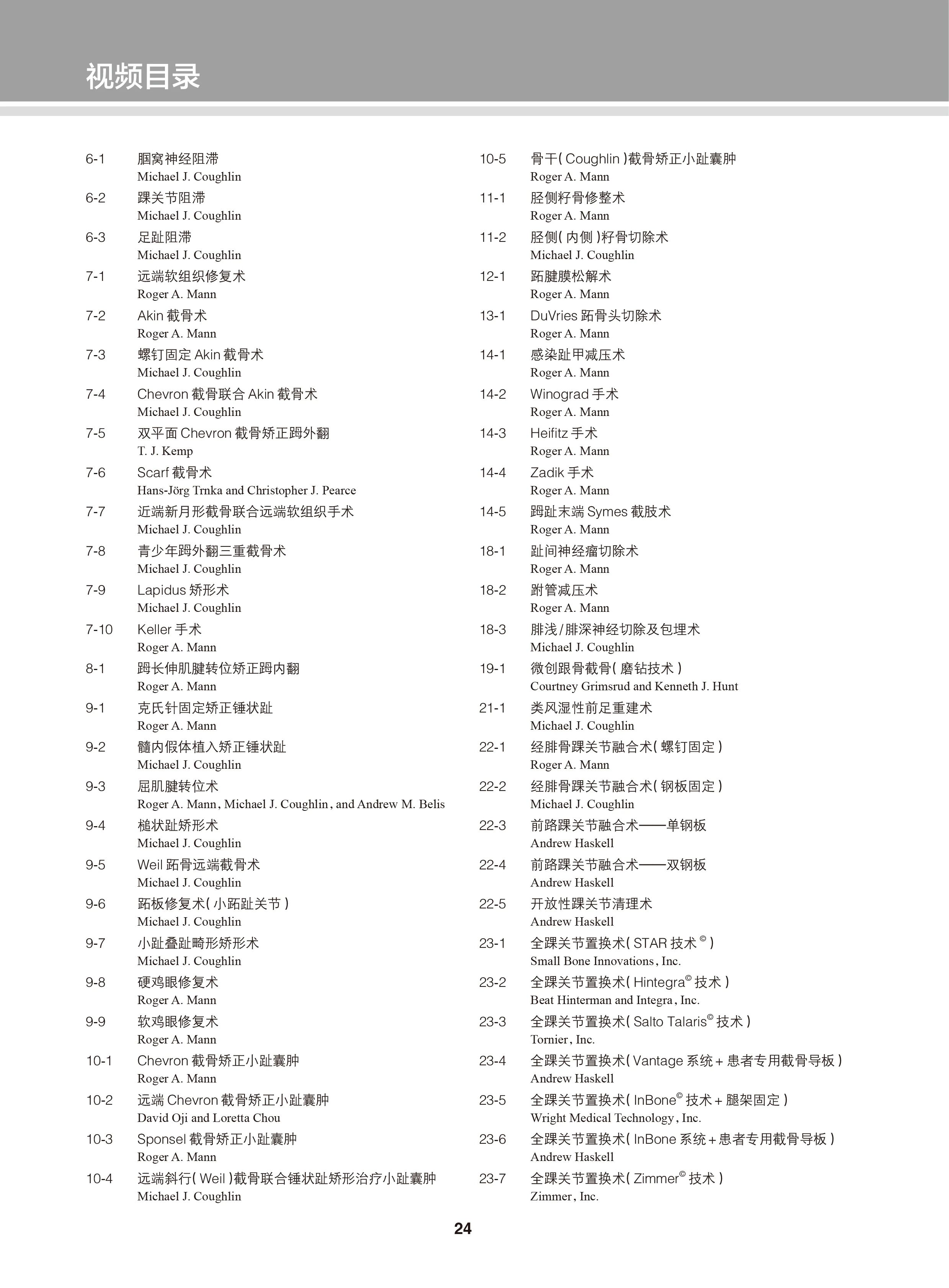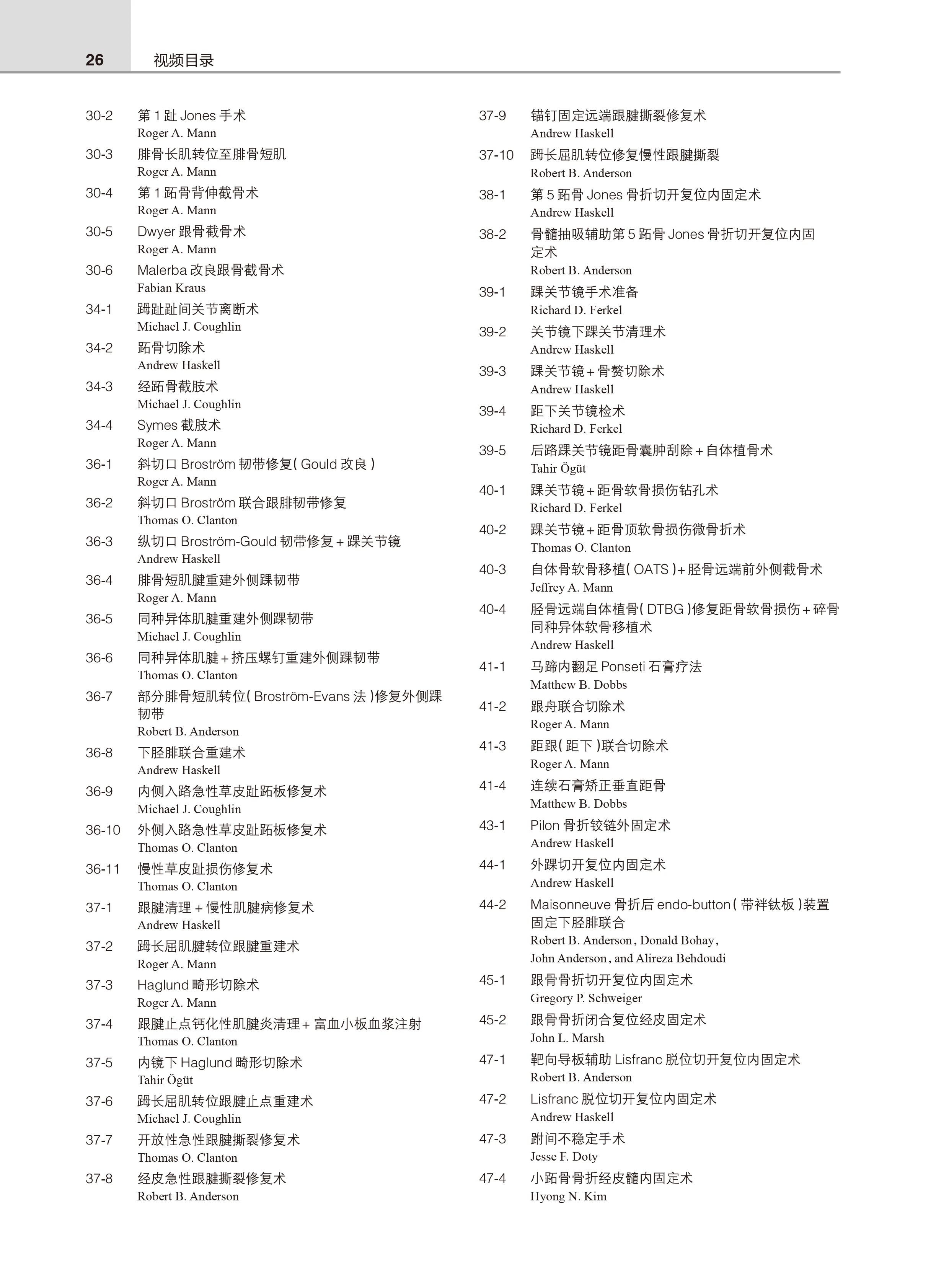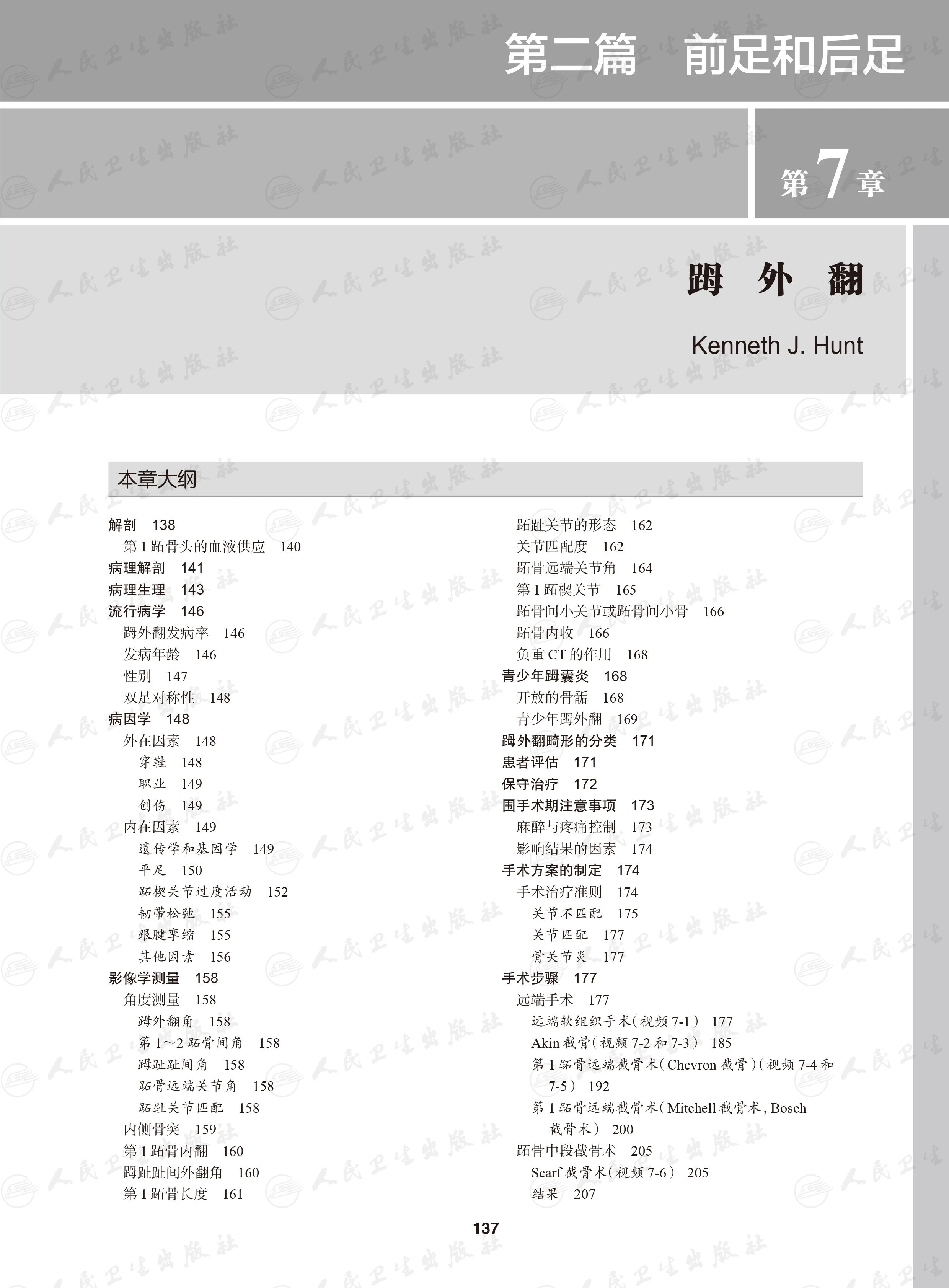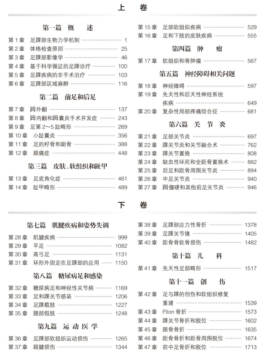 新版分为上、下卷共十一篇:概述;前足和后足;皮肤、软组织和甲;肿瘤;神经障碍相关问题;关节炎;肌腱疾病和姿势失调;糖尿病足和感染;运动医学;小儿骨科;创伤。全书共计47章,包括基于科学循证的足踝诊疗、足母外翻及足母囊手术的并发症、复杂区域疼痛综合征、缺血性坏死和全距骨置换术以及骨软骨病变等内容。全书包含超过160个高清手术视频,为书中文字内容提供了更立体的讲解。