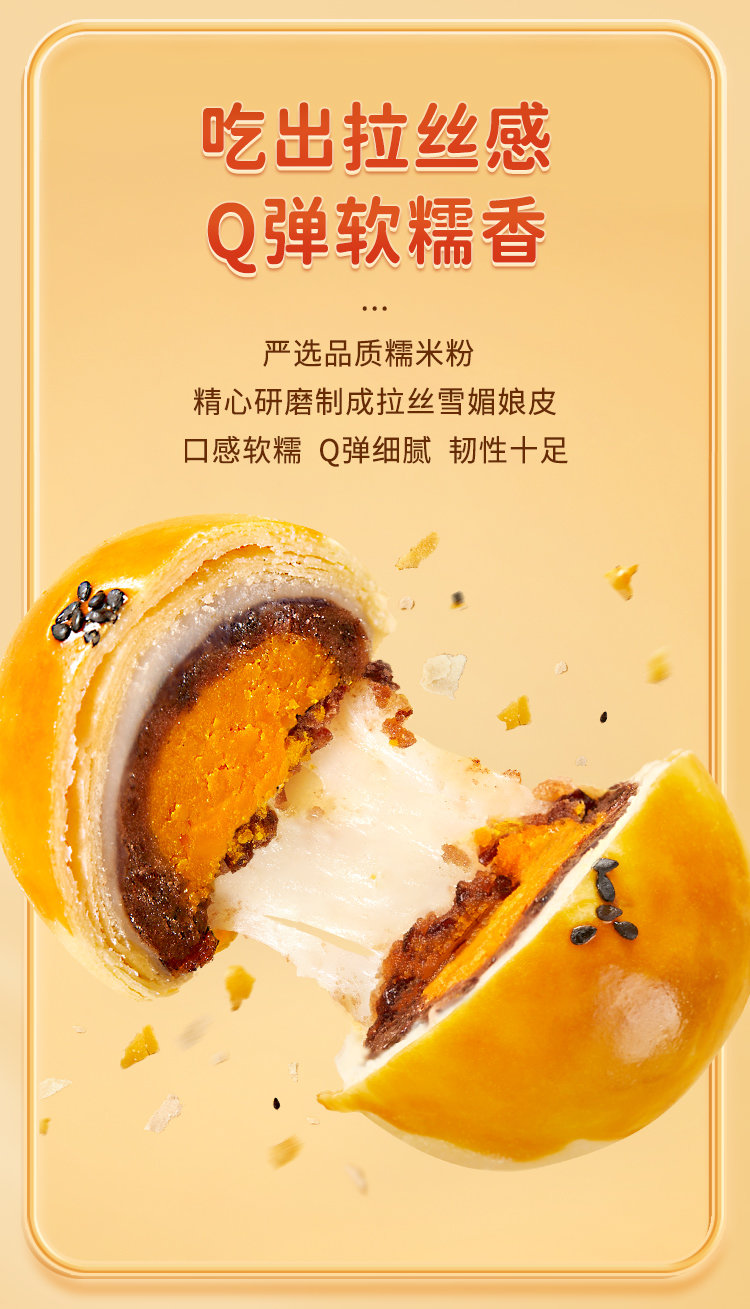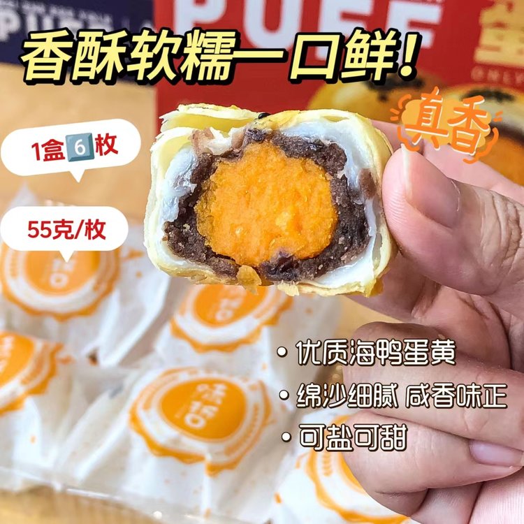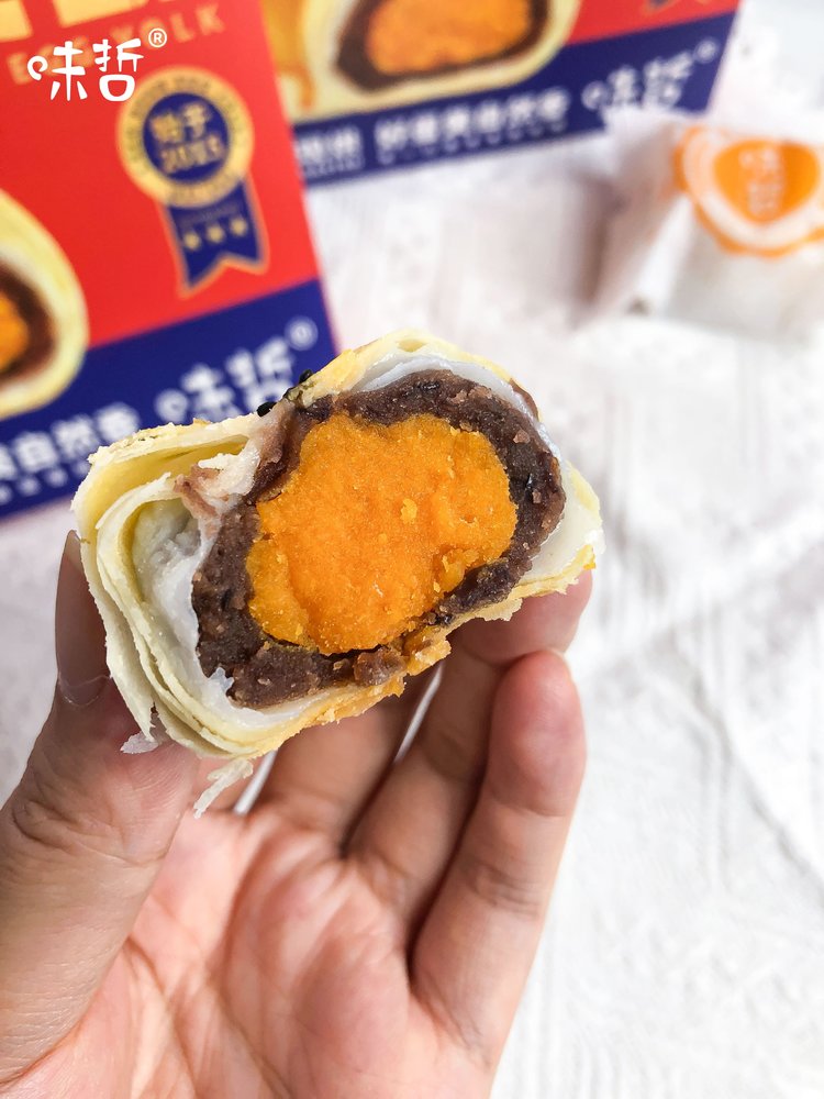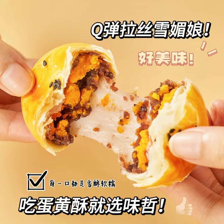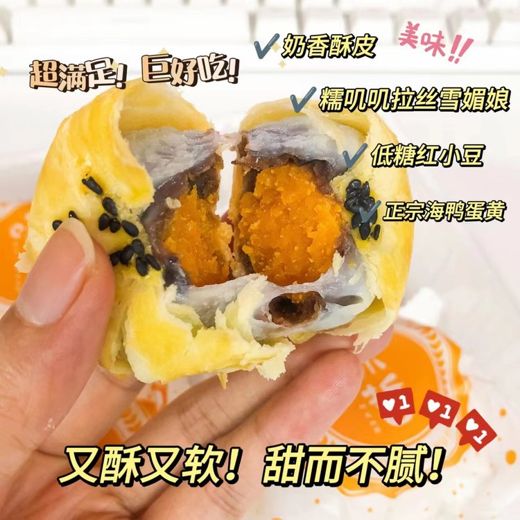 糯叽叽脑袋看过来!真的好好吃啊!软fufu的雪媚娘,软糯Q弹,拉丝清香,包裹着红豆与蛋黄,和阳光一起翻越酥海,平衡出了蛋黄酥幸福美妙的口感。