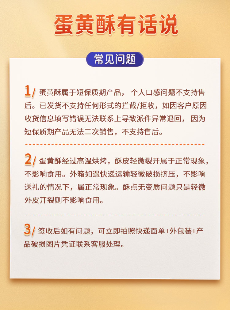 1. 蛋黄酥属于短保质期产品,个人口感问题不支持售后。已发货不支持任何形式的拦截/拒收,如因客户原因收货信息填写错误无法联系上导致派件异常退回, 因为短保质期产品无法二次销售,不支持售后。