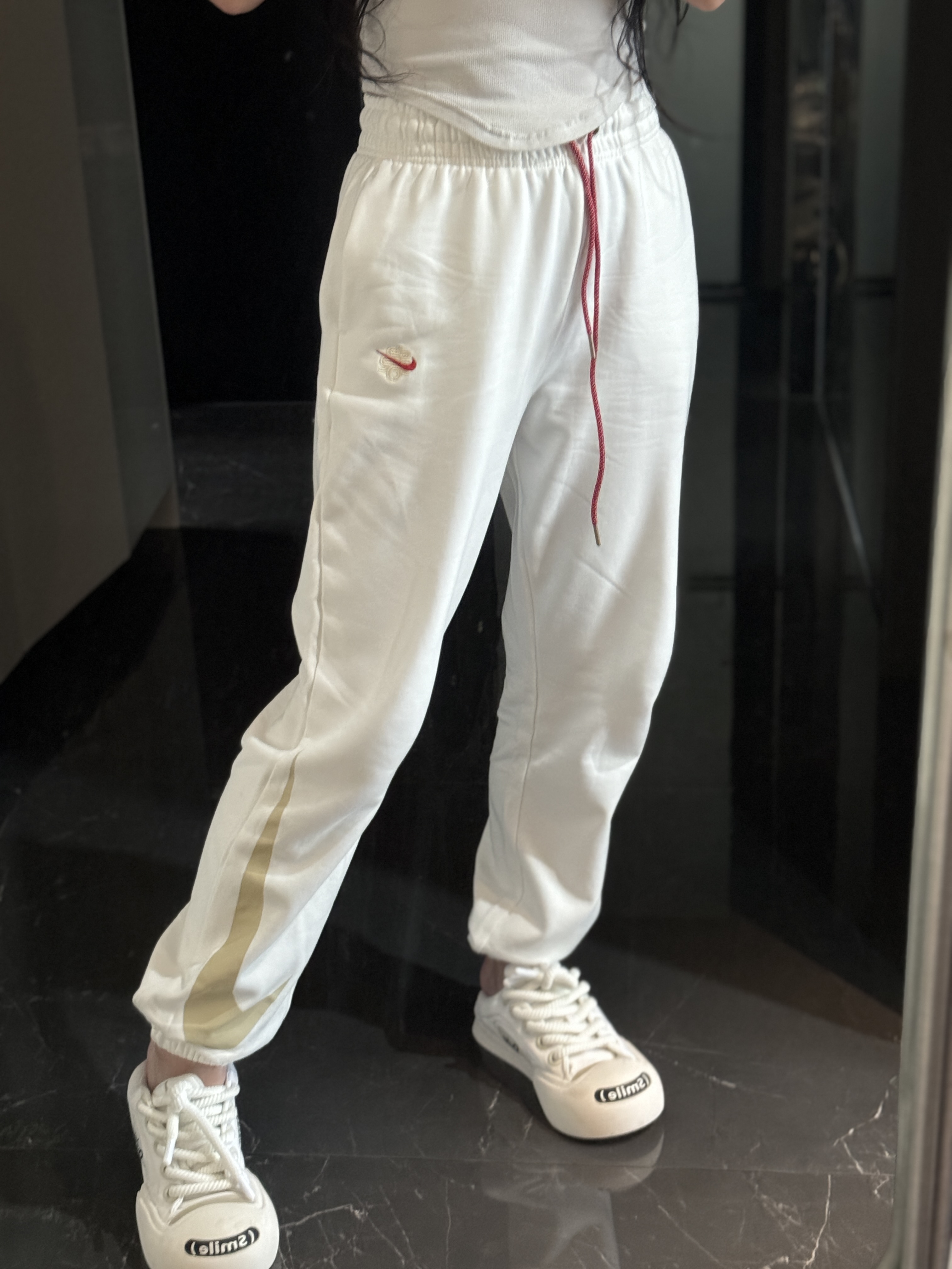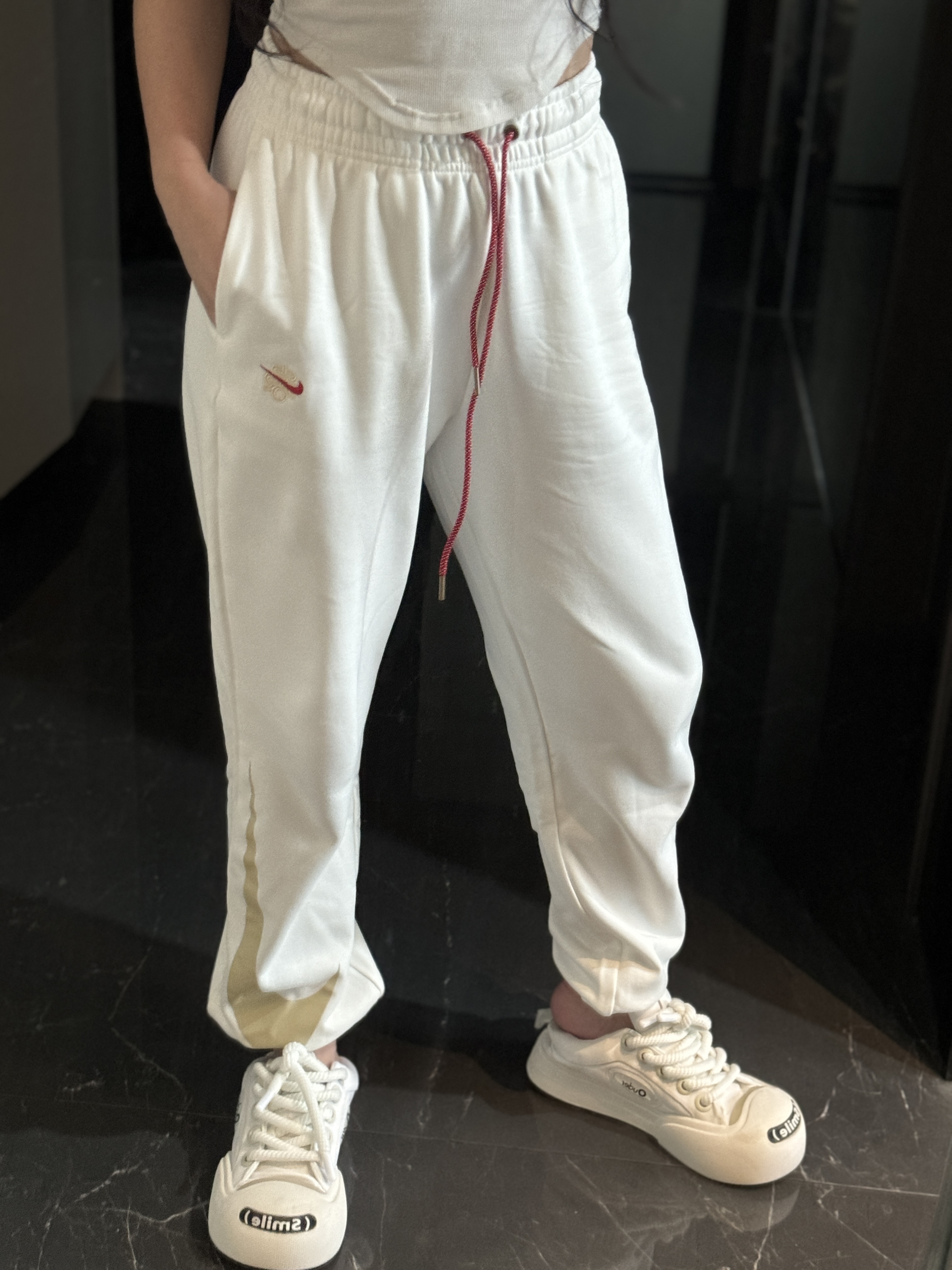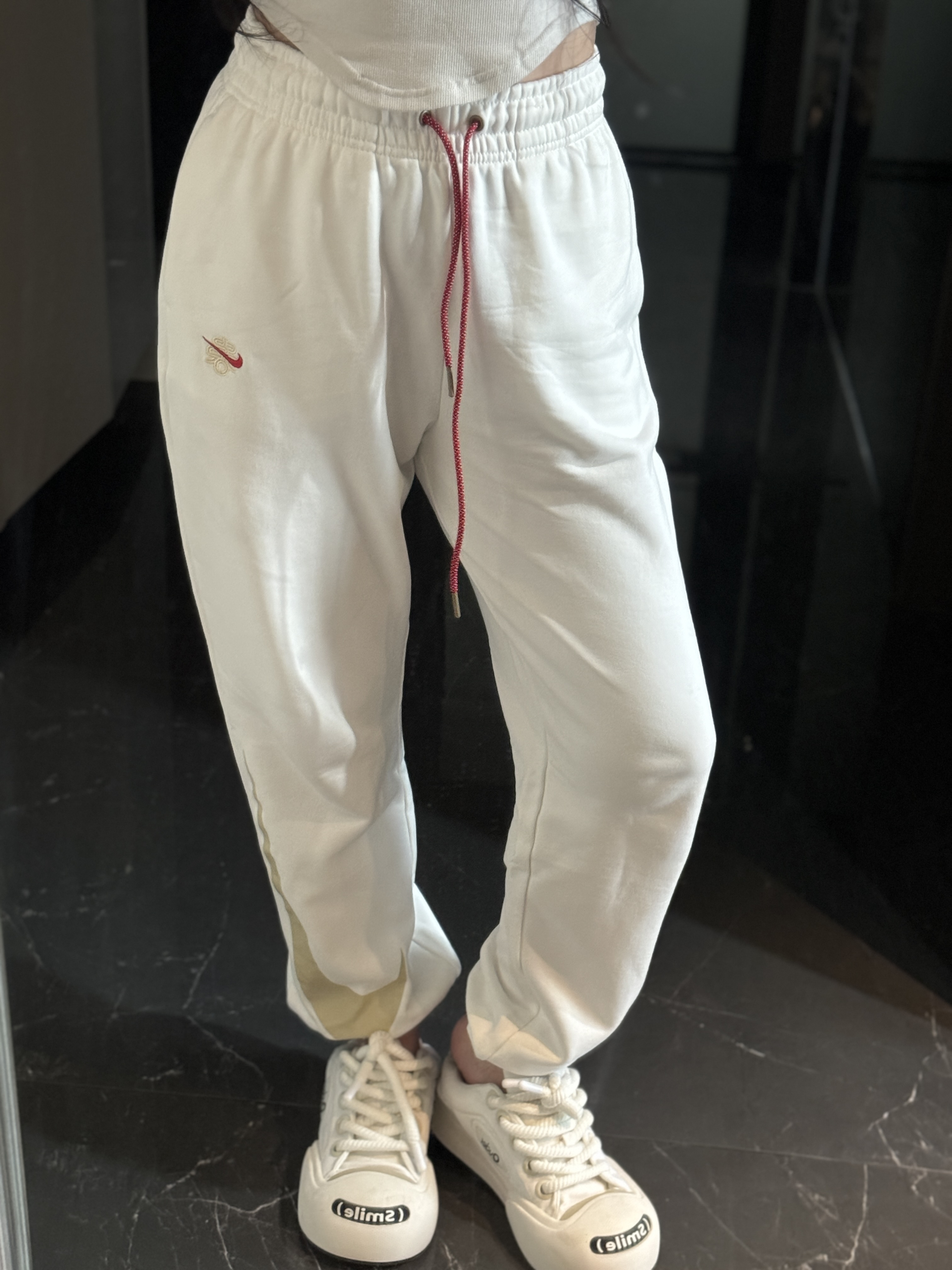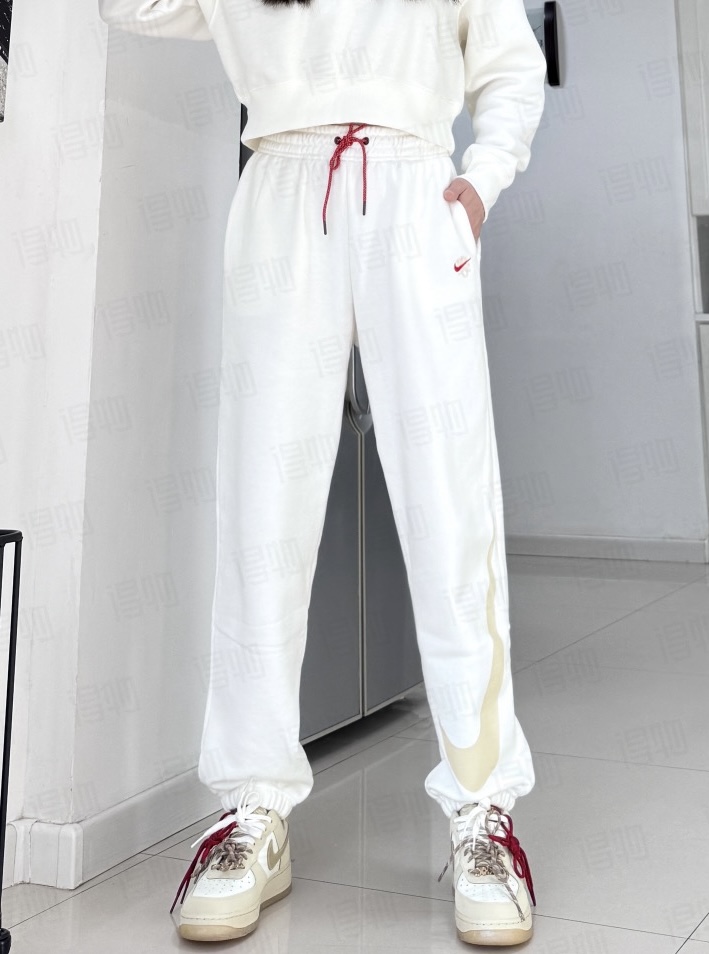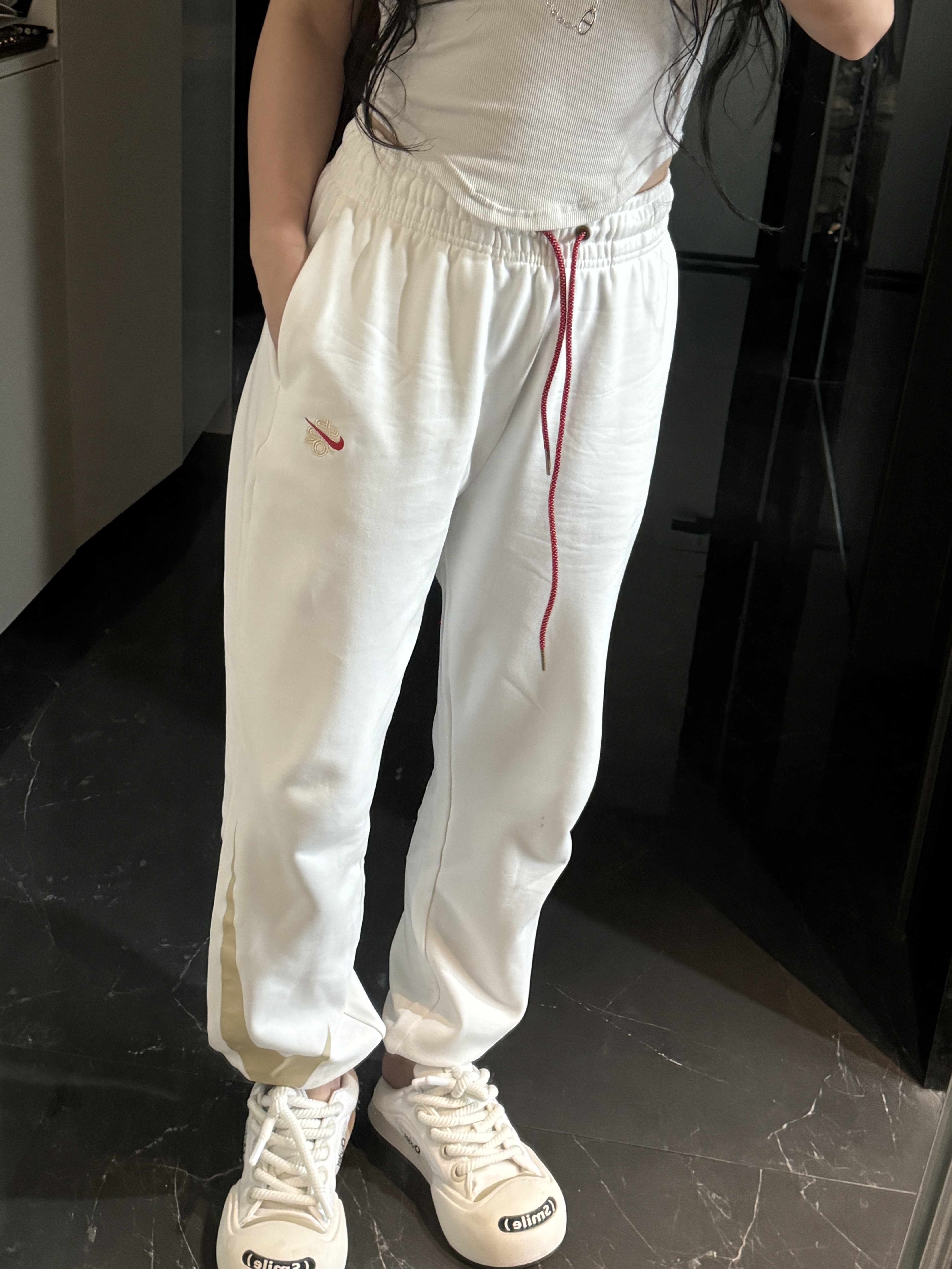 zheng品‼️ !得物卖300多!‼️N&K迎新系列卫裤 25年最新款🔥🔥2025春季灵蛇迎新系列女子高腰卫裤,厚实法式毛圈面料,柔软舒适,宽松版型+高腰剪裁,活动自如又显身材十。白色主色配红色抽绳和金色Swoosh,简约又有细节感。日常休闲、运动都能穿,尺码选择多,满足不同体型需求 S码80-115斤以内⚠️ M码90-130斤以内⚠️ L码100-150斤以内。XL码110-170以内⚠️