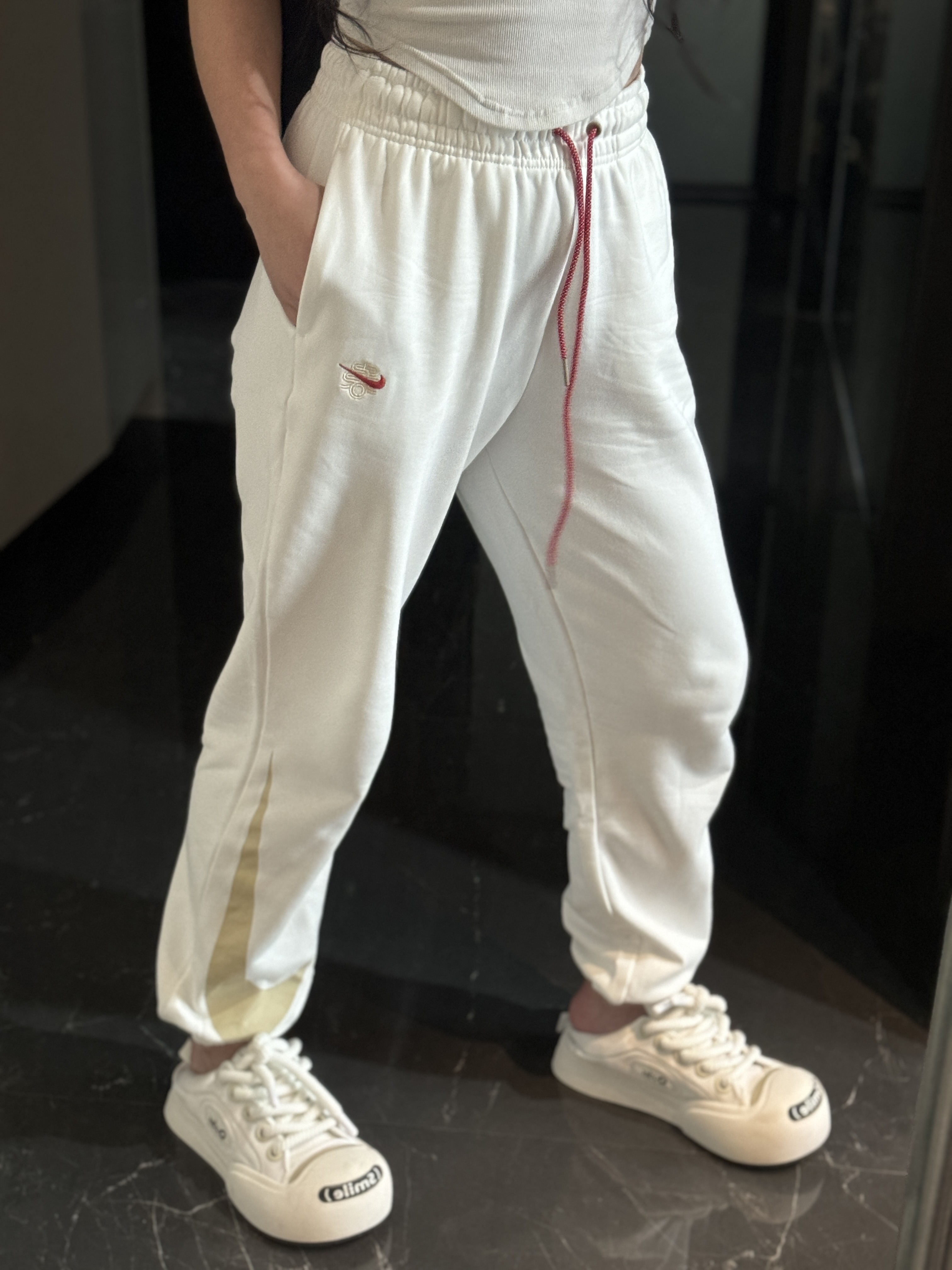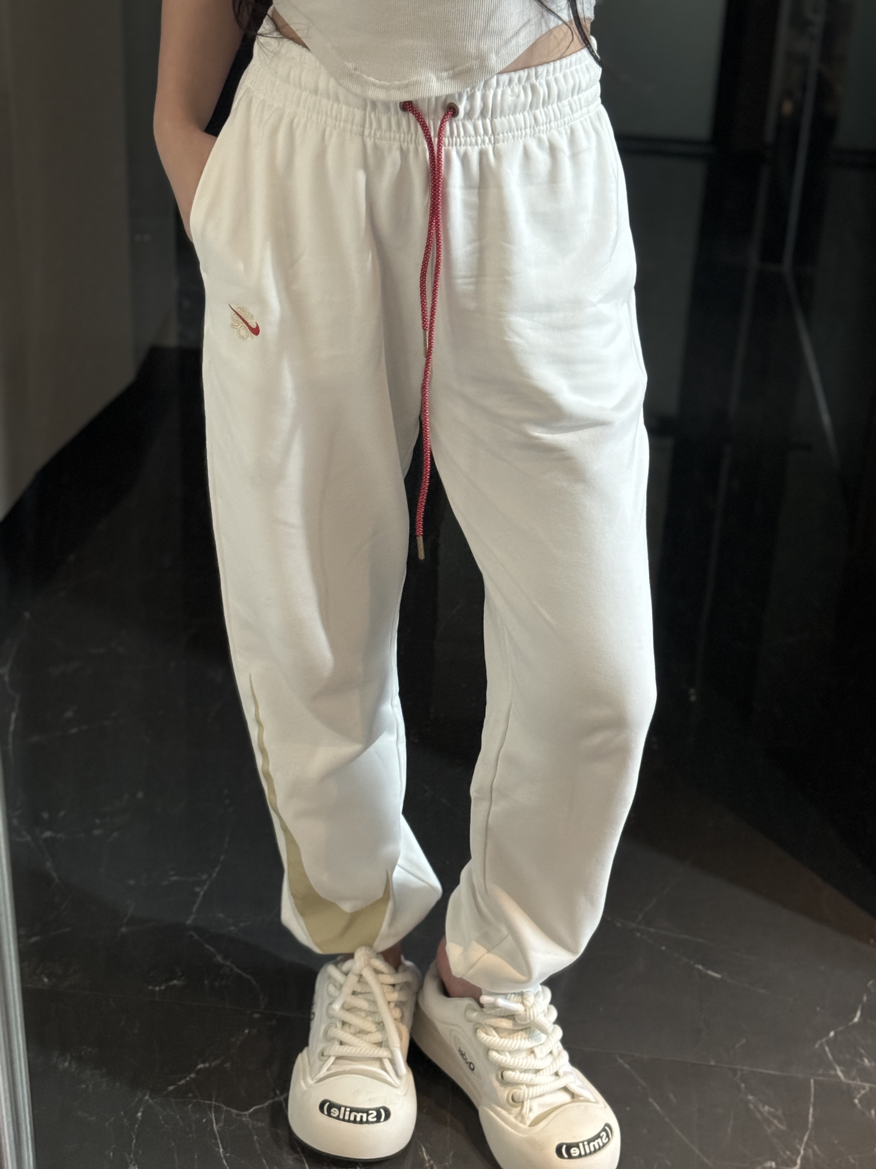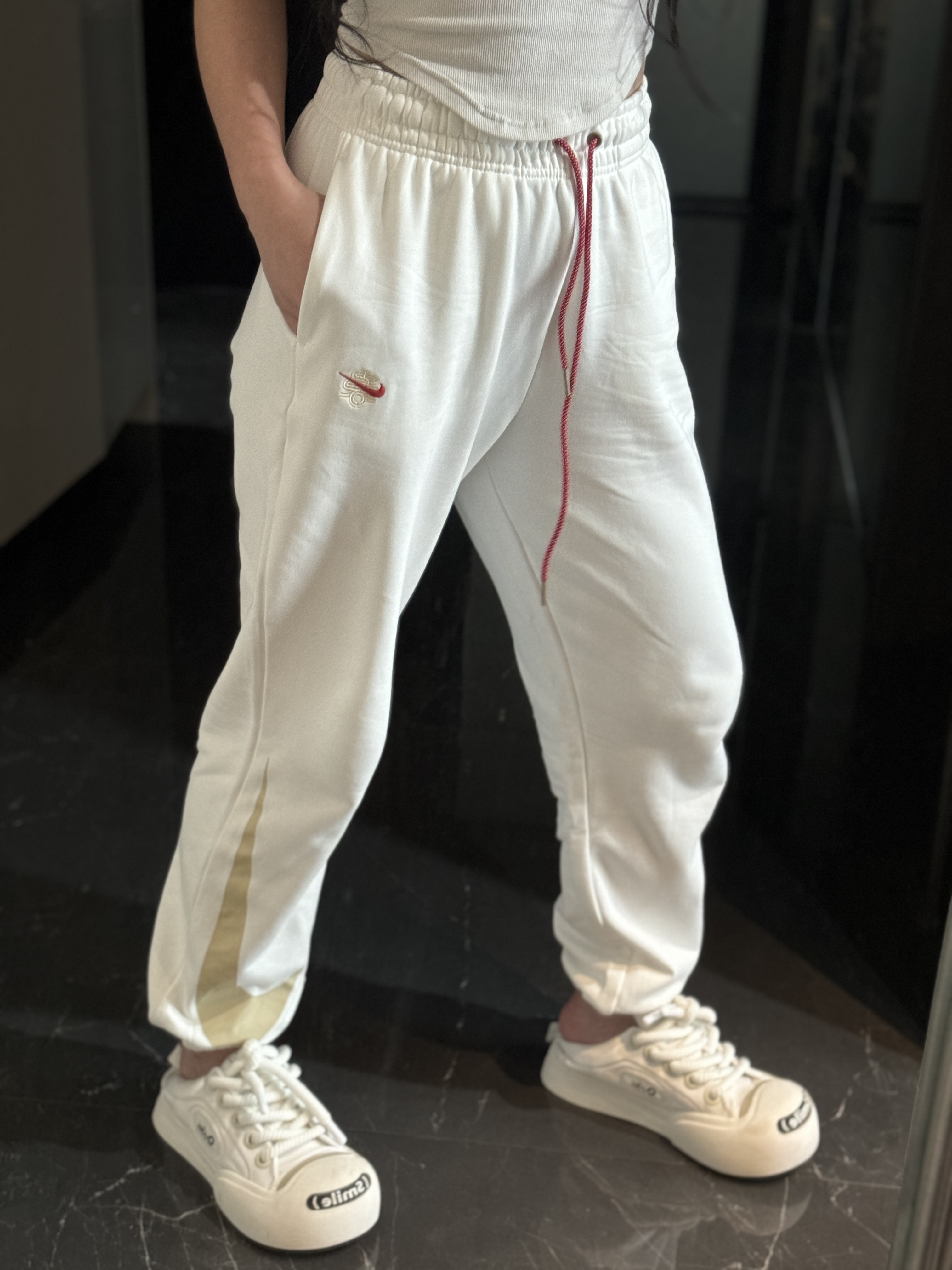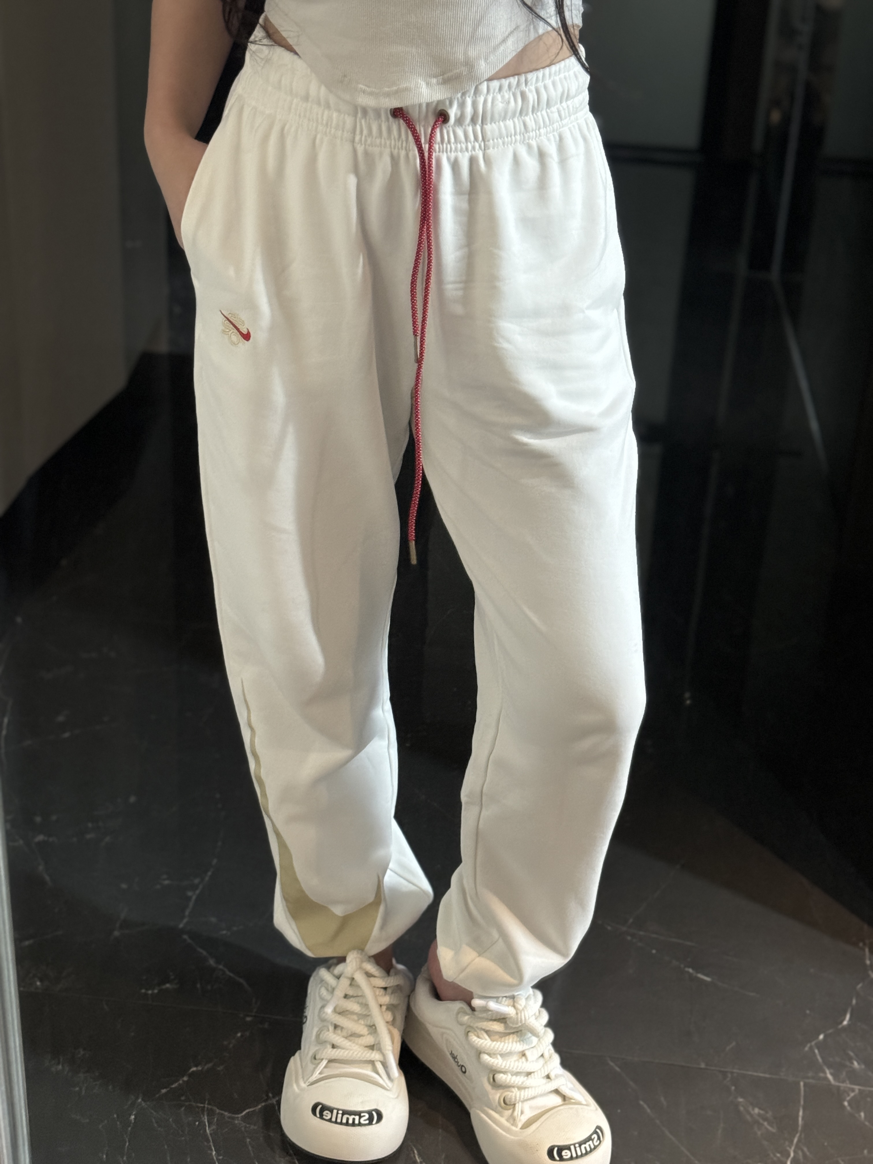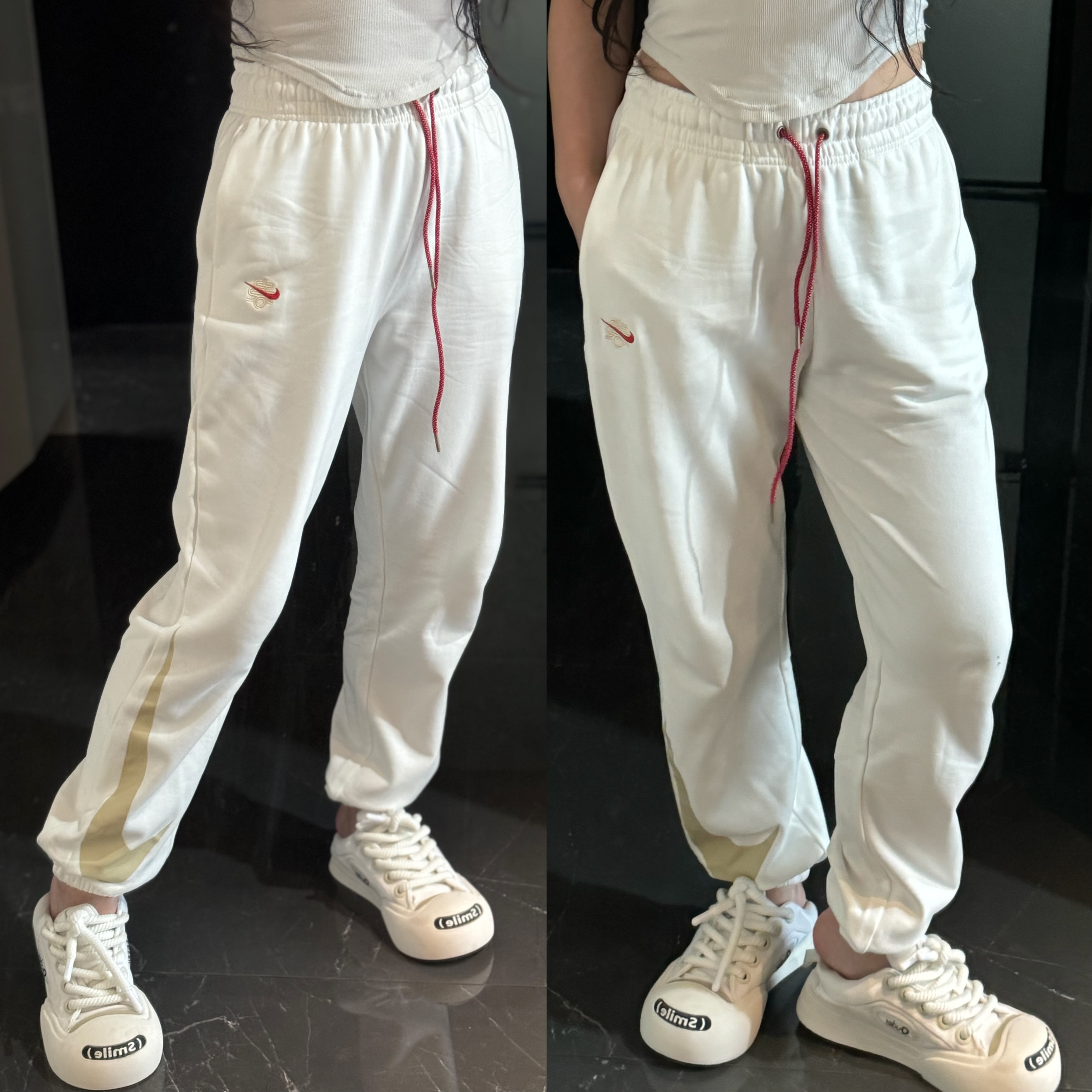zheng品‼️ !得物卖300多!‼️N&K迎新系列卫裤 25年最新款🔥🔥2025春季灵蛇迎新系列女子高腰卫裤,厚实法式毛圈面料,柔软舒适,宽松版型+高腰剪裁,活动自如又显身材十。白色主色配红色抽绳和金色Swoosh,简约又有细节感。日常休闲、运动都能穿,尺码选择多,满足不同体型需求 S码80-115斤以内⚠️ M码90-130斤以内⚠️ L码100-150斤以内。XL码110-170以内⚠️