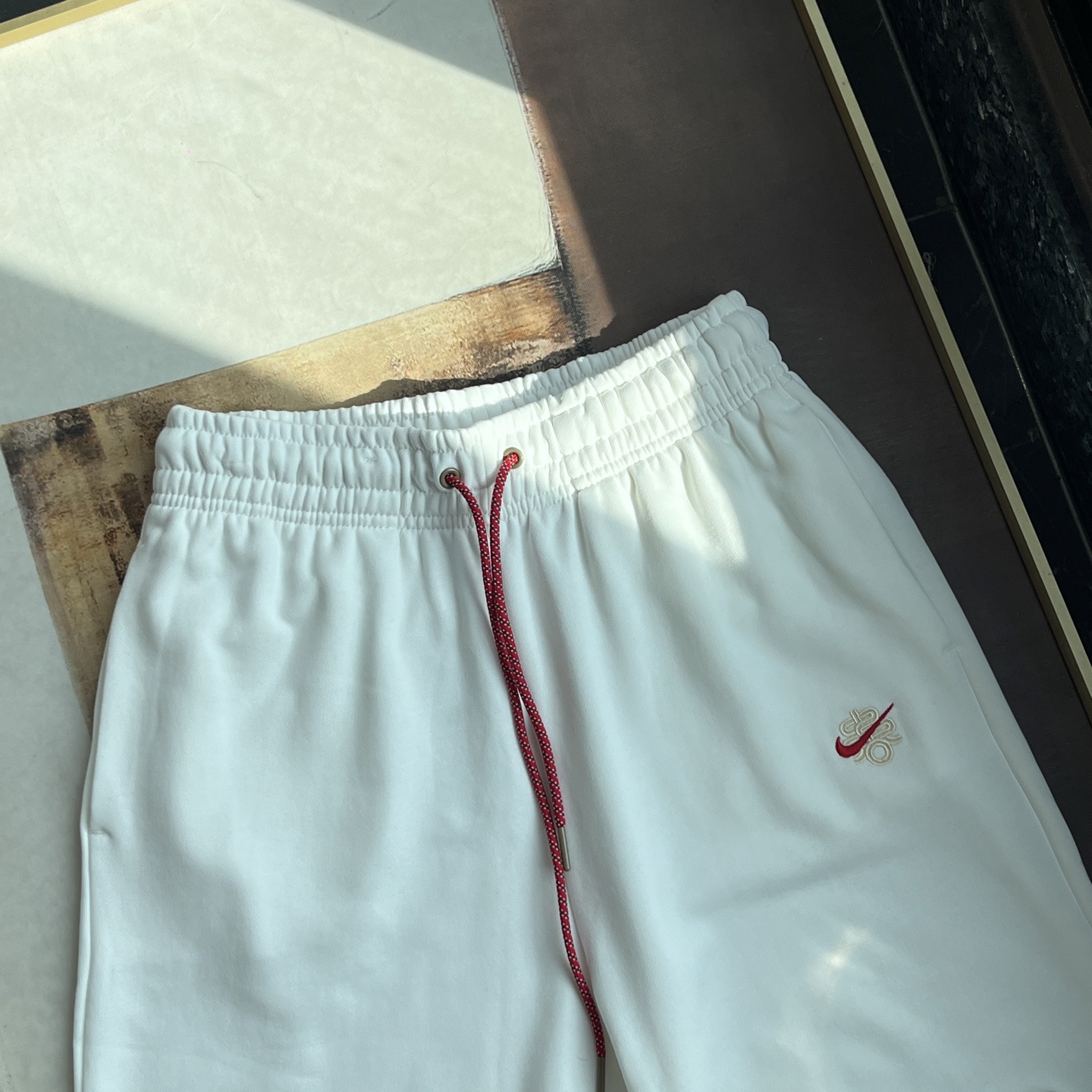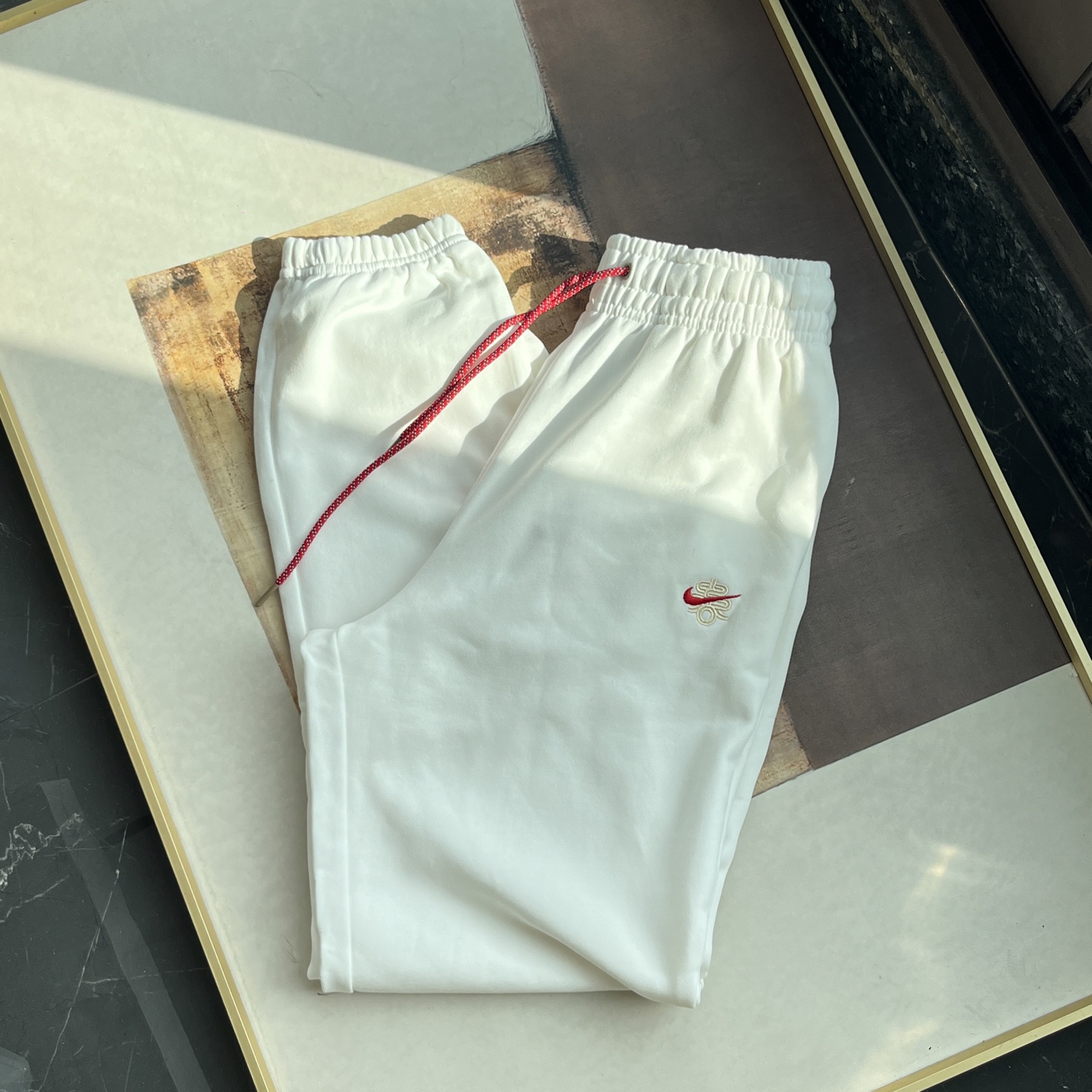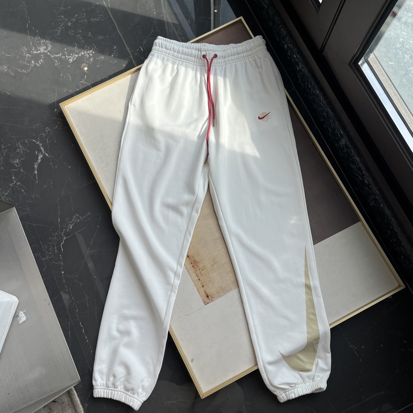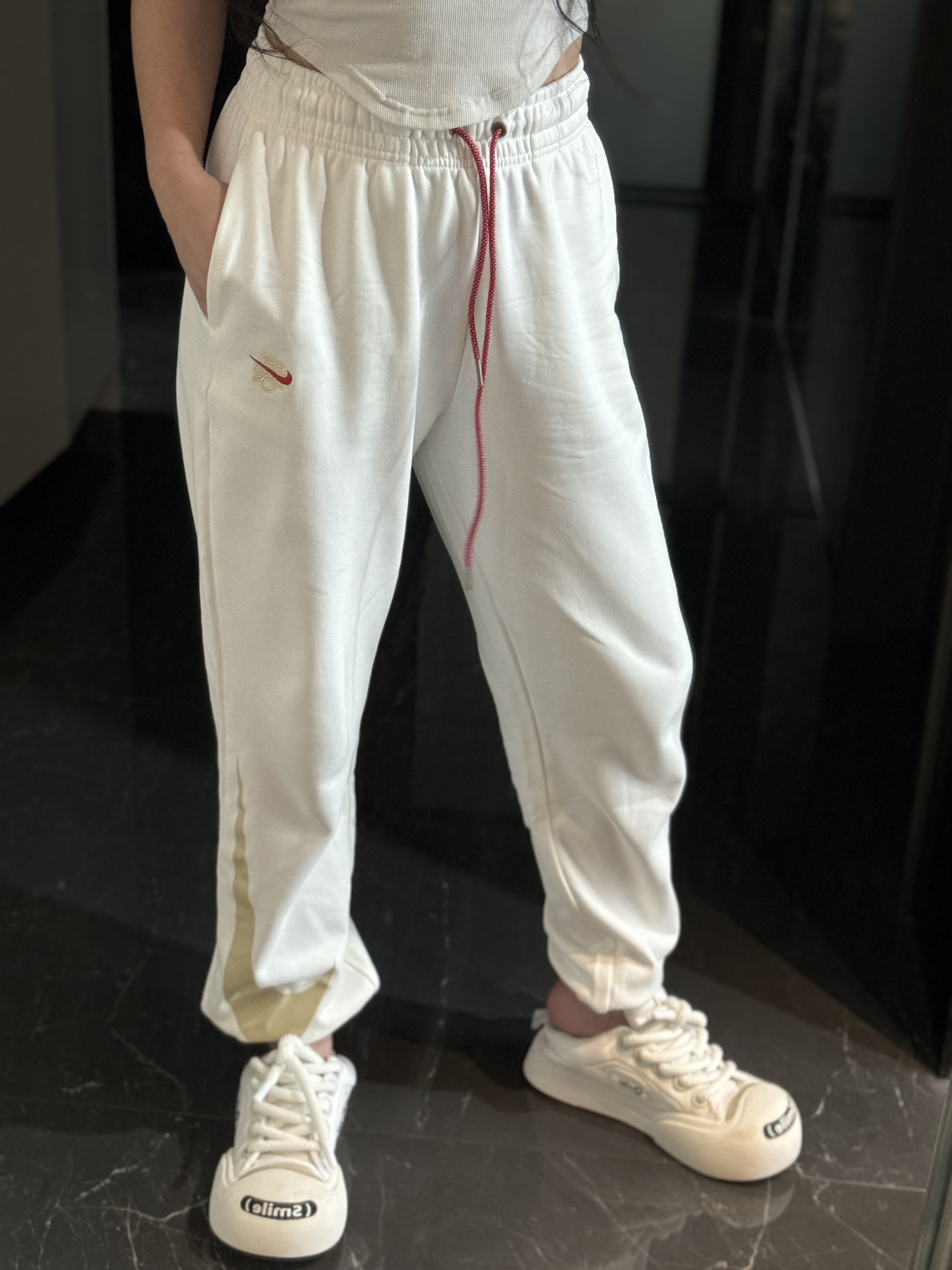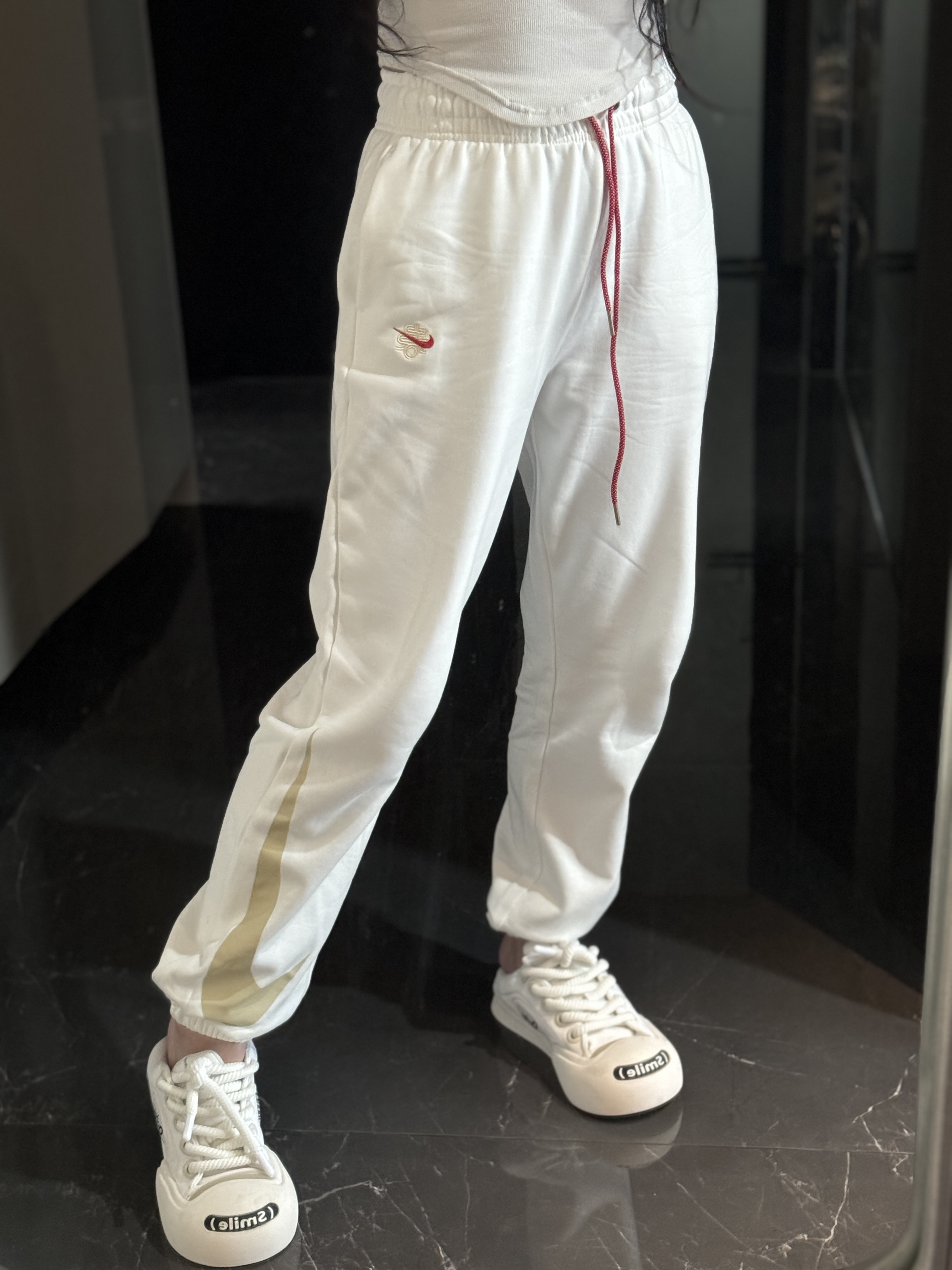 zheng品‼️ !得物卖300多!‼️N&K迎新系列卫裤 25年最新款🔥🔥2025春季灵蛇迎新系列女子高腰卫裤,厚实法式毛圈面料,柔软舒适,宽松版型+高腰剪裁,活动自如又显身材十。白色主色配红色抽绳和金色Swoosh,简约又有细节感。日常休闲、运动都能穿,尺码选择多,满足不同体型需求 S码80-115斤以内⚠️ M码90-130斤以内⚠️ L码100-150斤以内。XL码110-170以内⚠️