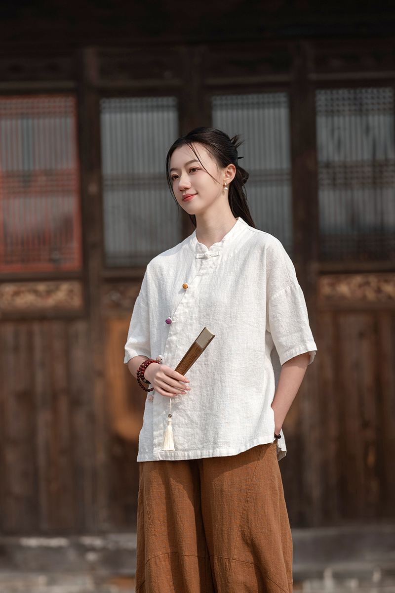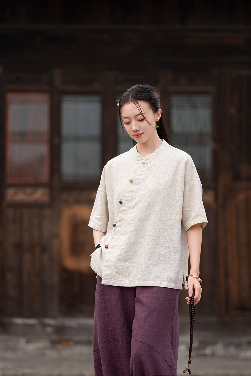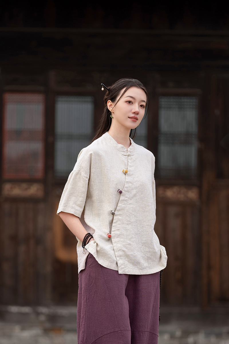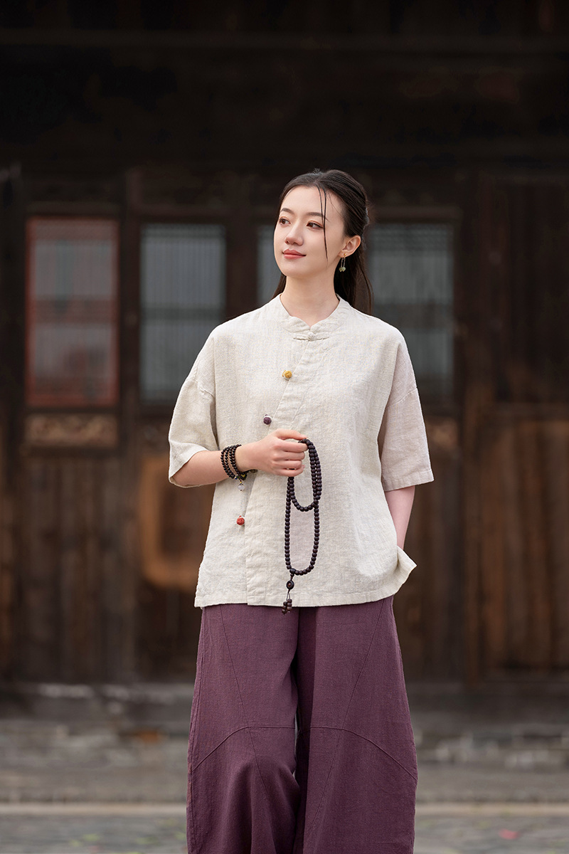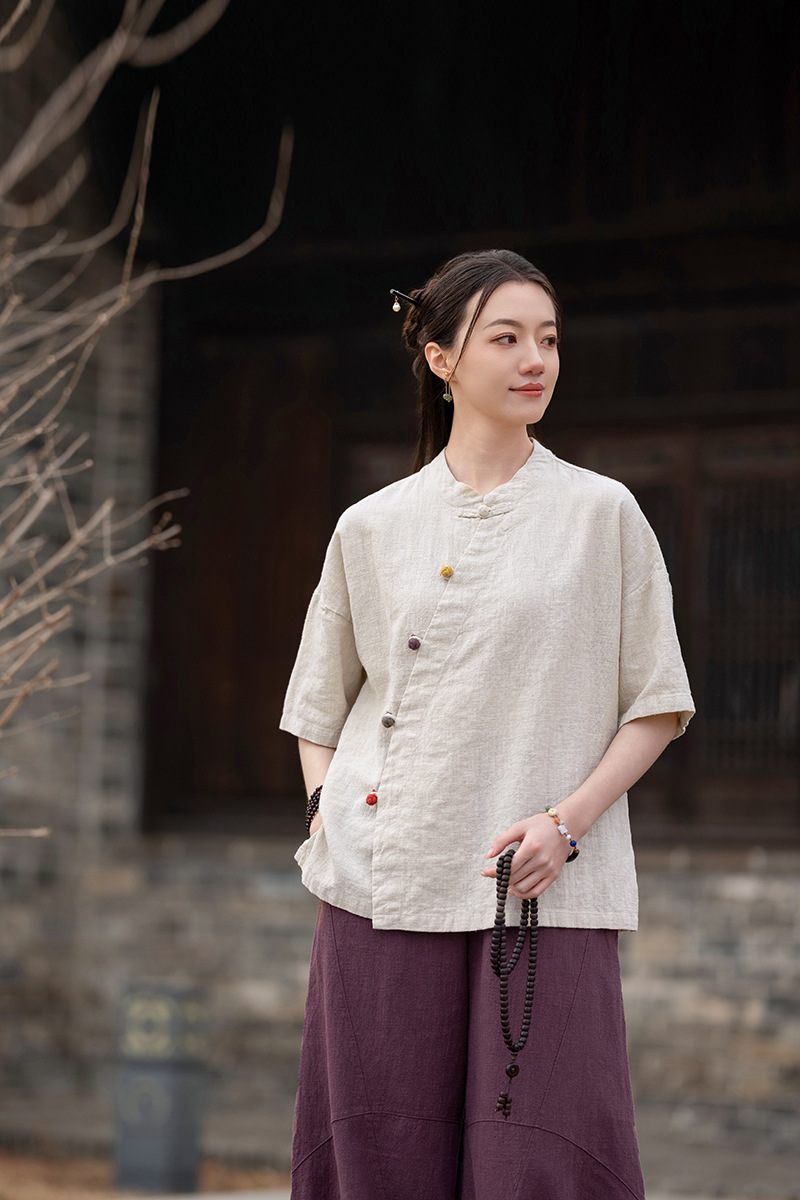 国风立领偏襟撞色盘扣,棉麻禅意茶服衬衫女短袖复古上衣KY- 8376