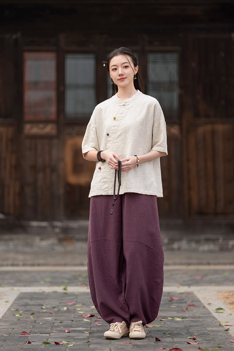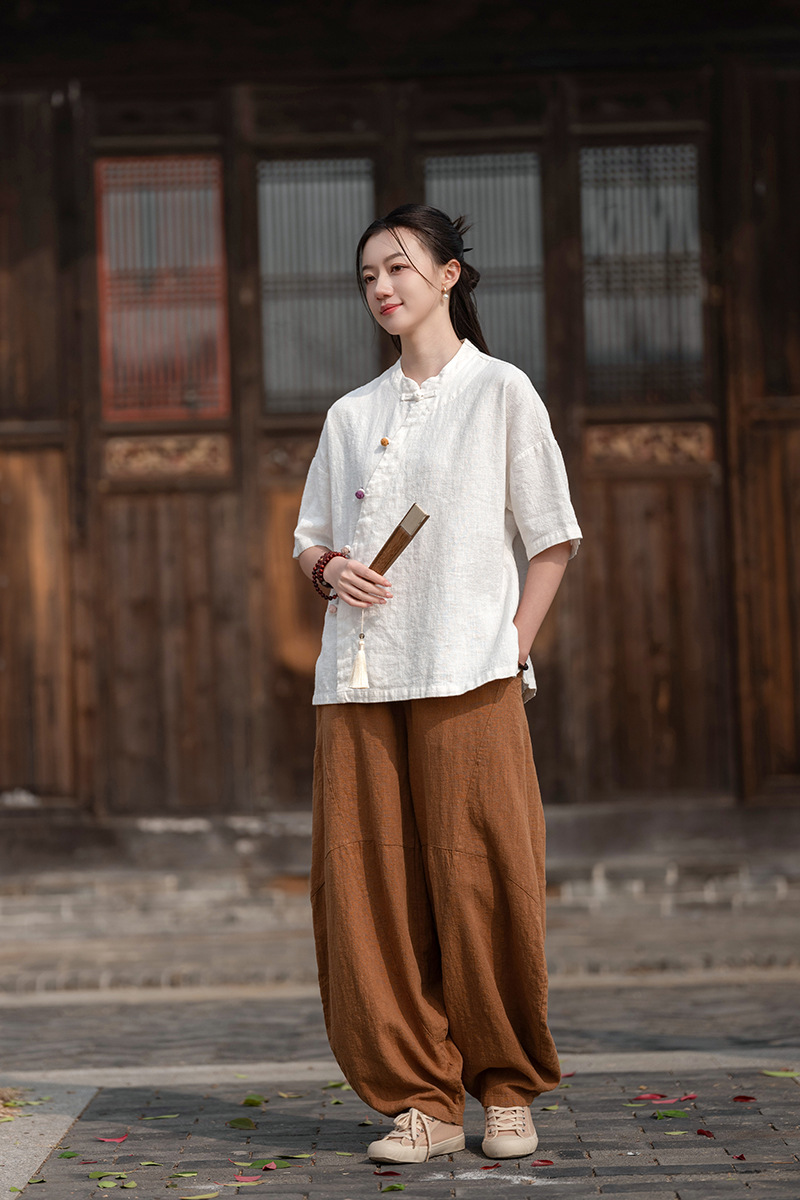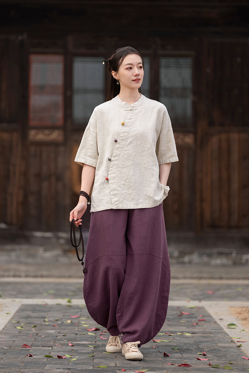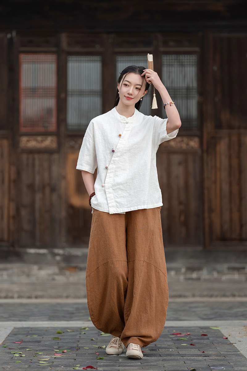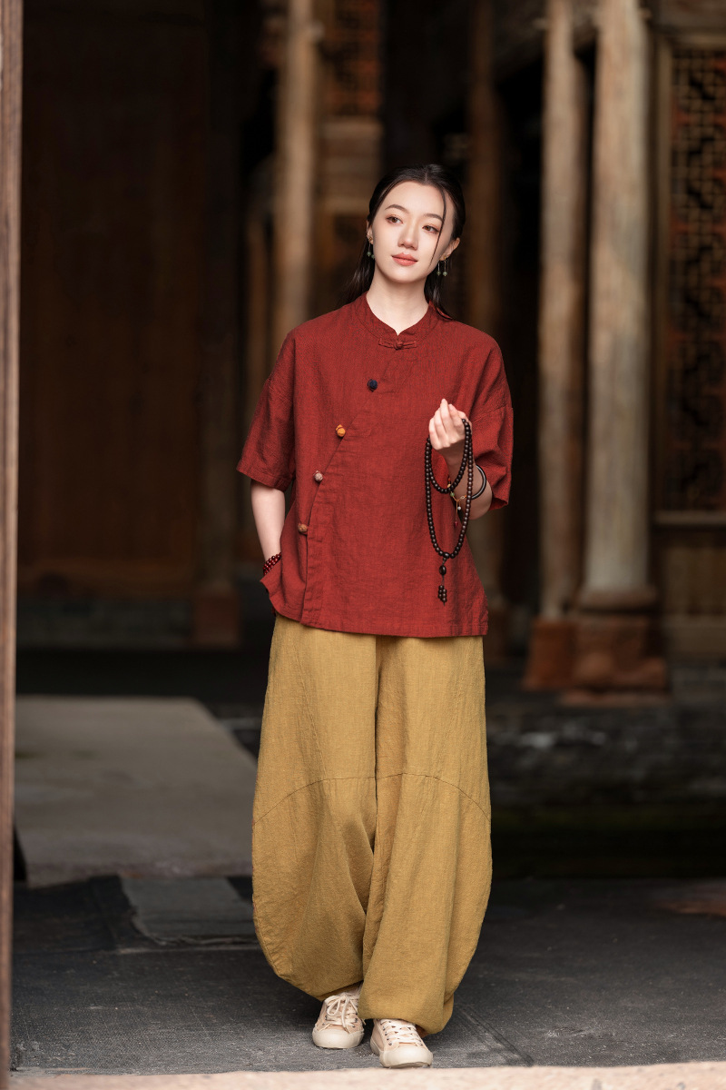 国风立领偏襟撞色盘扣,棉麻禅意茶服衬衫女短袖复古上衣KY- 8376
