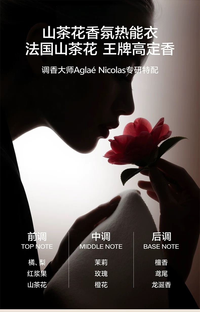 山茶花香氛热能衣法国山茶花 王牌高定香 调香大师Aglaé Nicolas专研特配 前调橘、梨 茉莉 檀香 中调红浆果 玫瑰 鸢尾 后调山茶花 橙花 龙涎香!权威检测实力认证。采用无痕工艺剪裁,衣身无多余缝合线,穿上如同第二层肌肤般轻盈服帖,领口、袖口的细腻包边杜绝勒感与摩擦,晨起穿搭或夜间休憩都能享受无束缚的温柔。
