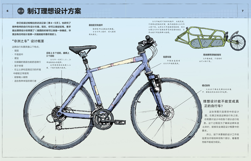 如何建造一辆自行车、一个机器人,甚至是一座太空站?《千万不要设计一辆自行车:给孩子的创客养成笔记》可以给你提供思路!本书包含6个章节,每章分别介绍一种事物的设计思路:自行车、机器人、过山车、滑板场、体育场和空间站。由小至大,逐步开拓思维。你会发现不同的事物在设计中有不同的侧重点,有的需要注重外观,有的需要注重结构,还有的需要考虑周边环境……跟随本书作者的步伐,你将一步步将实现你的梦幻设计!首先,你需要构建理想模型,作者将向你介绍一个理想的模型应当具有哪些条件和特点。据此,你可以初步绘制出设计草图。之后,会有10个步骤带你完善你的设计。材料如何选取?资金如何预估?各个零部件该如何设计?你将学会工程师的思维,在这10个步骤过后,得到一个超棒的最终设计。最后你还会看到世界上现有的、已经建成的设计,发现更多灵感。