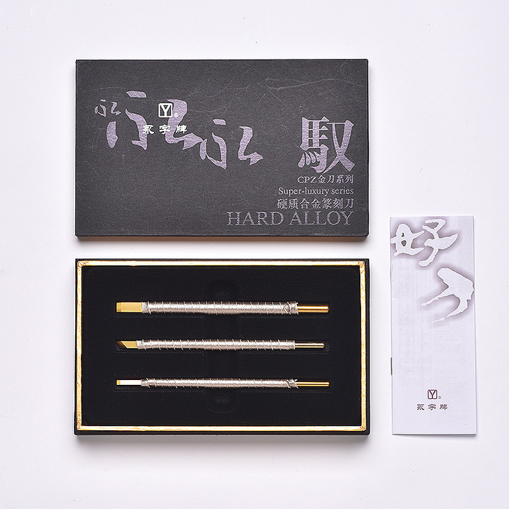 “永字牌”篆刻刀具,硬质合金材质,具有硬度高,强度好和特别耐磨三大特点,独特刃口工艺,不涩不滑,制作精美。深受印林诸君喜爱,畅销全国和东南亚。