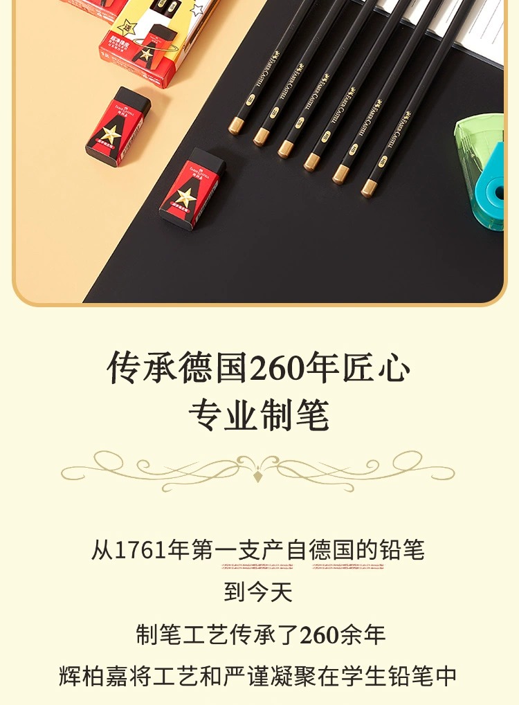 - 德国辉柏嘉,始创于1761年的家族品牌,历经259年岁月洗礼的制笔权威,一直致力于提供高品质书写及绘画艺术创作工具的专业制造商。