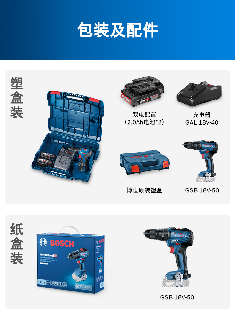 博世(BOSCH)18V无刷冲击钻双电GSB 18V-50 2X2.0Ah 塑盒装 商品图2